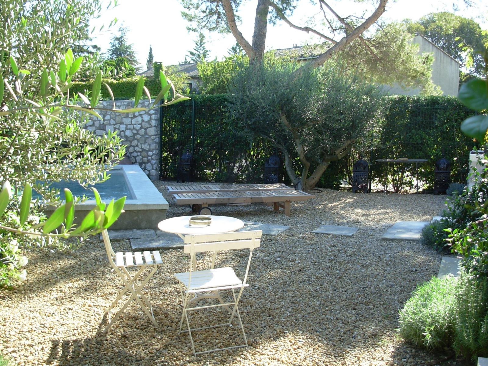 Le jardinet de 390 m² accueille un bassin-piscine équipé d'une nage à contre-courant, idéal pour la détente comme pour l'entraînement.