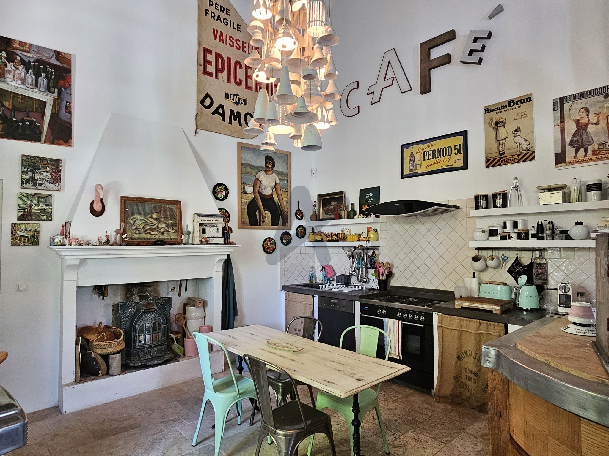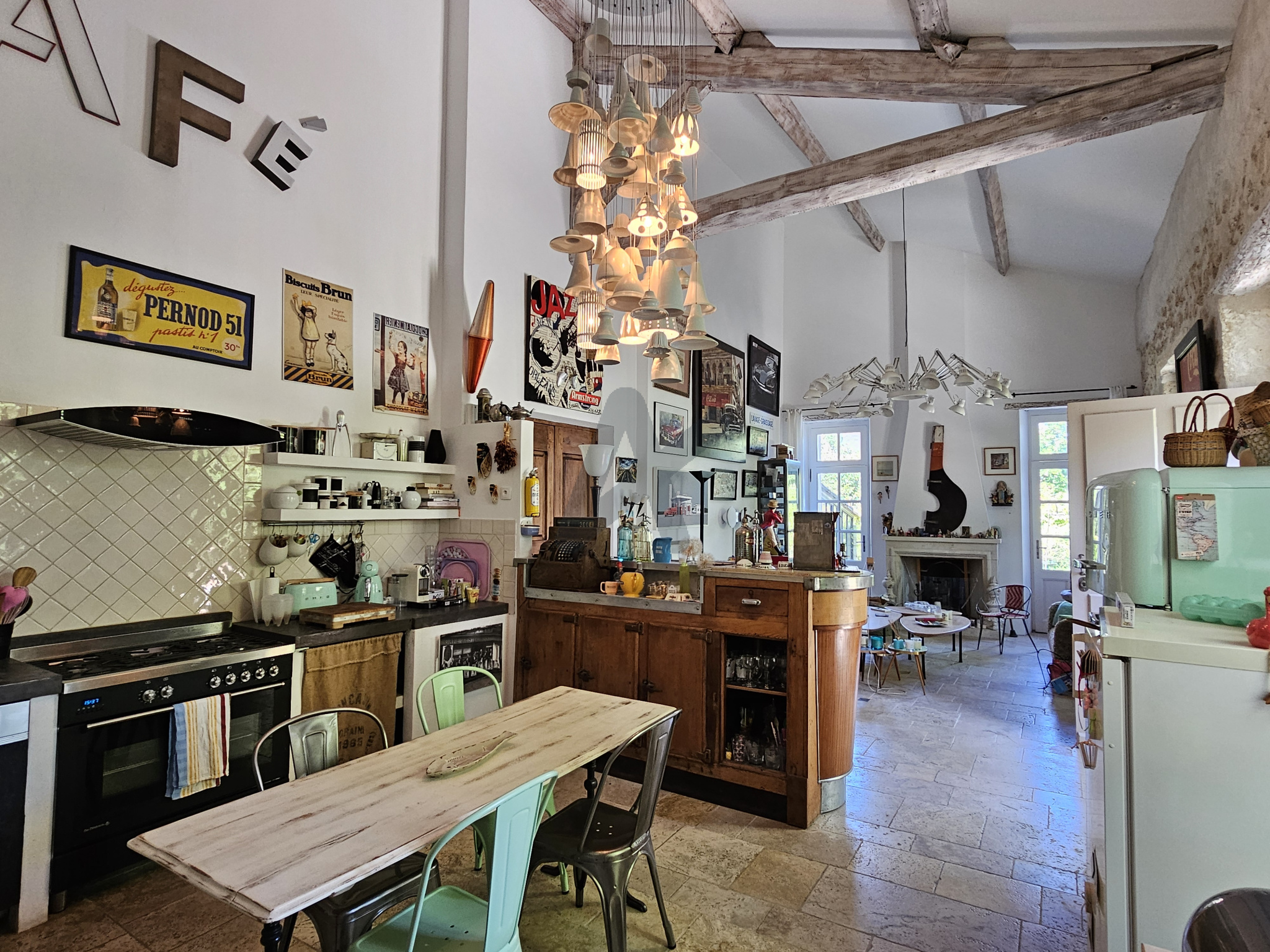 L'ensemble a été restauré avec une attention particulière portée aux matériaux : belles hauteurs sous plafond, deux cheminées, finitions délicates... La pièce de vie, spacieuse et conviviale, intègre une cuisine élégante et s'ouvre naturellement vers l'extérieur.