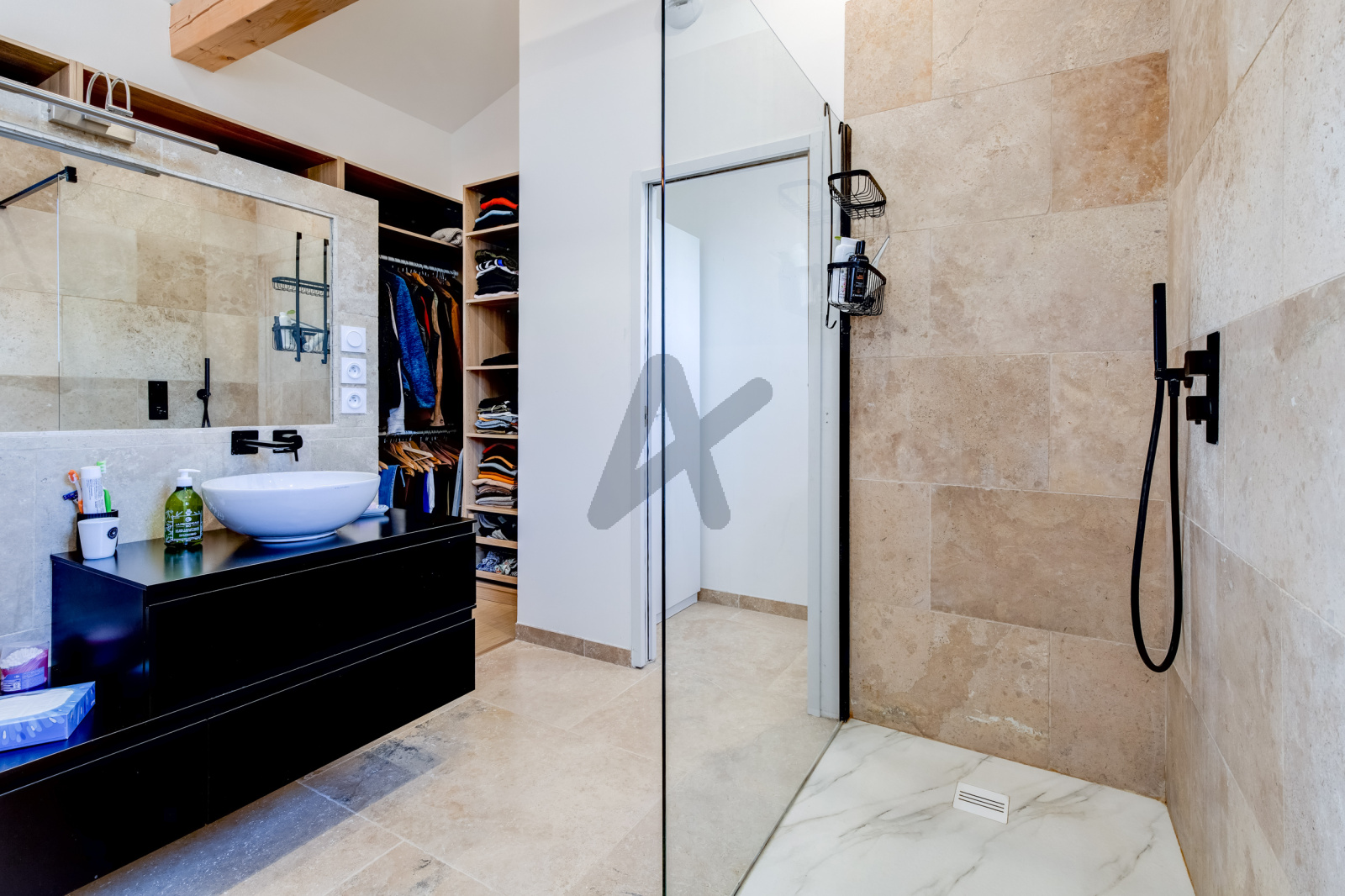 A l'étage, deux chambres se partagent une salle de bains. Une troisième chambre, pensée comme une suite, bénéficie de sa propre salle d'eau et d'un dressing.