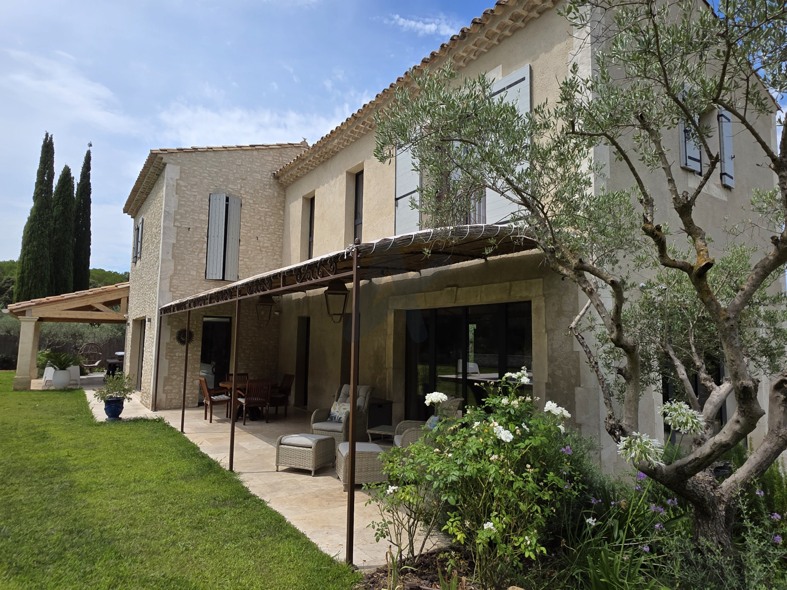 Au rez-de-jardin, la maison accueille une vaste pièce de vie baignée de soleil, avec un salon ouvrant sur une terrasse de 38 m² protégée par une tonnelle, idéal pour profiter des belles journées d'Eygalières.