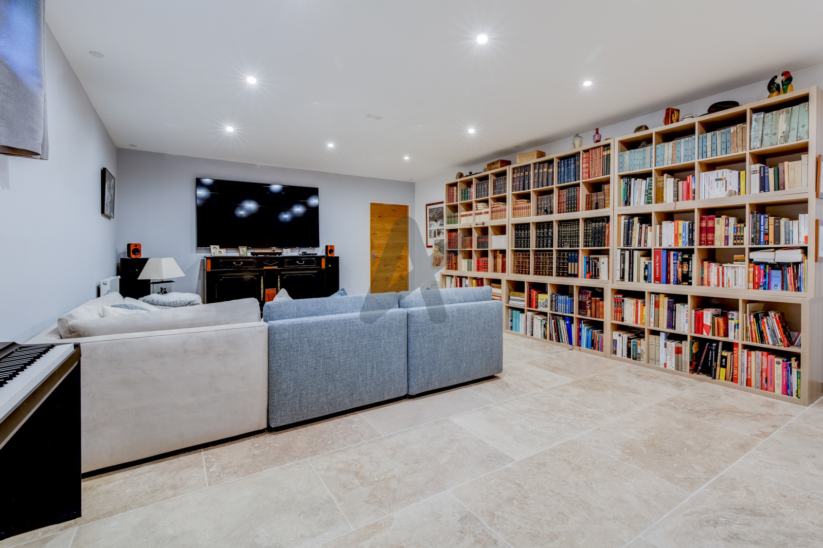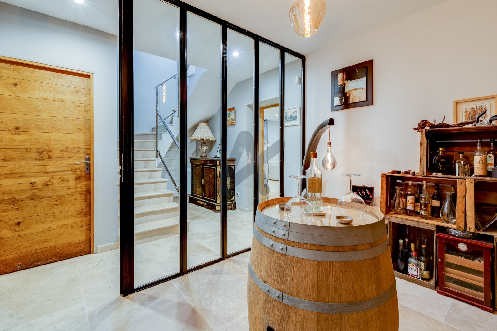 Le sous-sol de 80 m², éclairé par des fenêtres, offre de magnifiques prestations : un home-cinéma pour de soirées de détente, une cave à vin, une chambre supplémentaire avec salle d'eau, idéale pour recevoir en toute indépendance.
