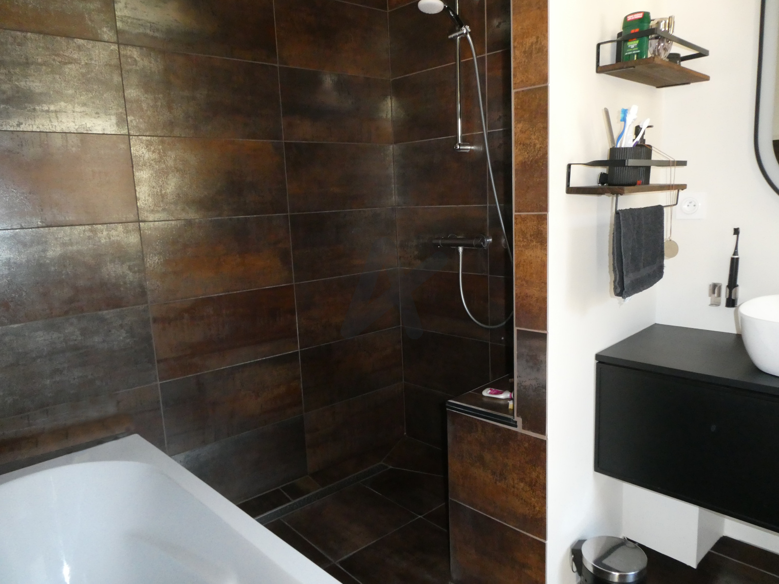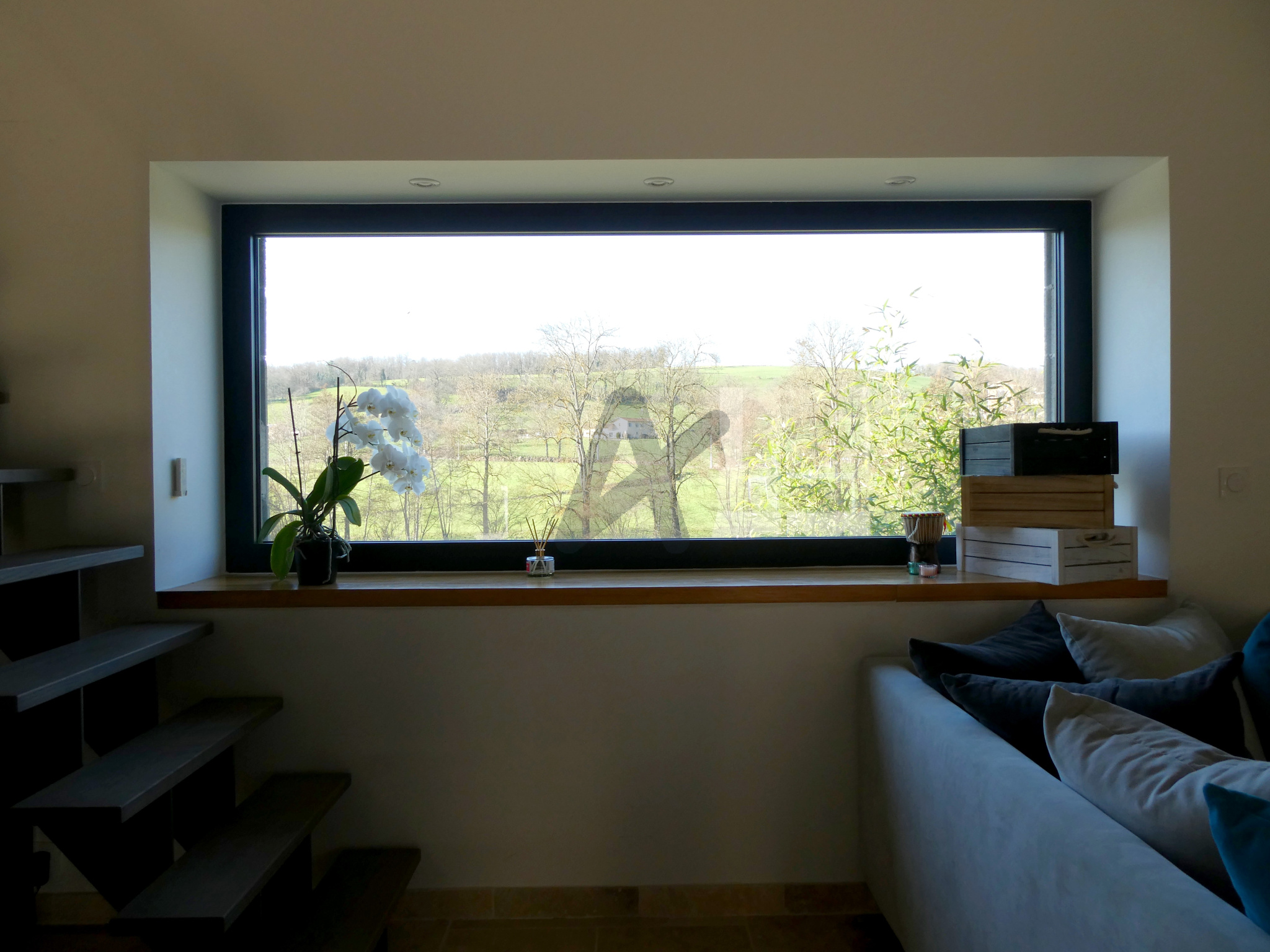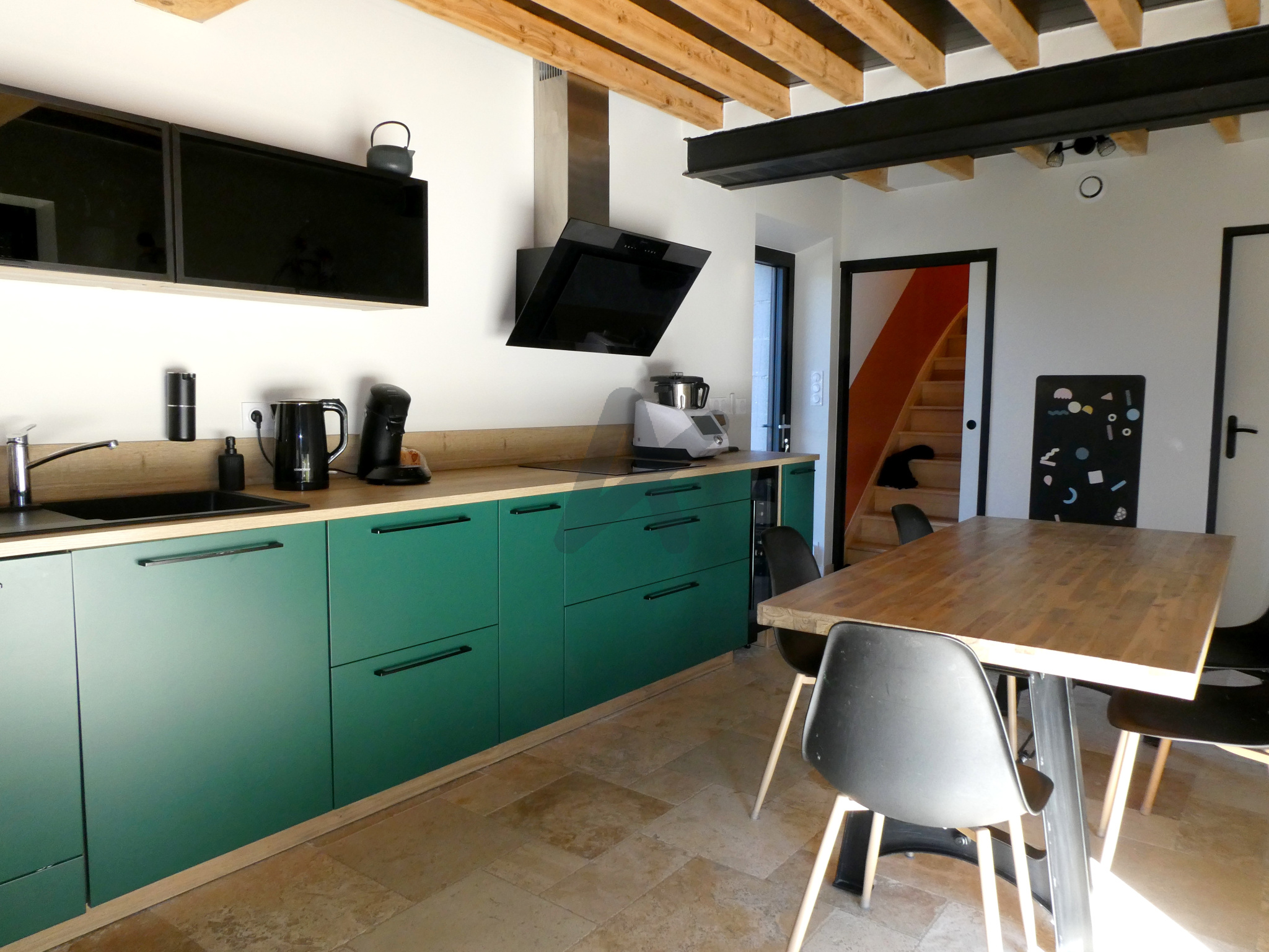 Le chauffage est assuré par une pompe à chaleur air/eau, complétée par un poêle à bois dans le séjour.