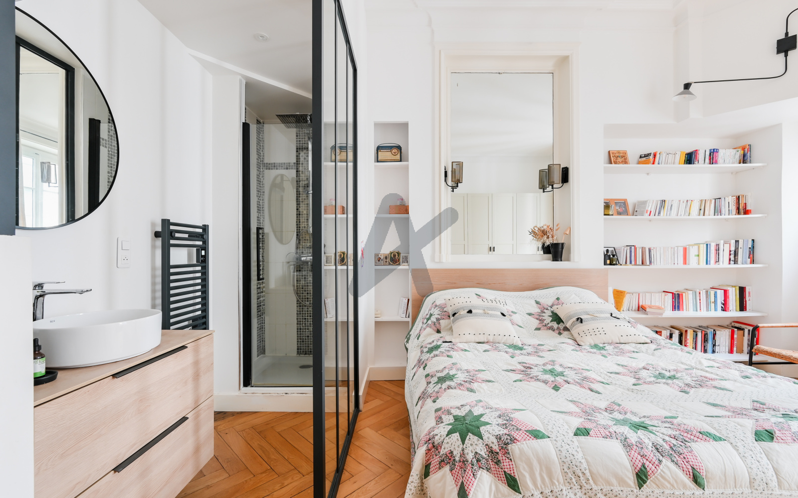 Pour les amoureux de l'ancien : parquet, moulures, cheminée, hauteur sous plafond, carreaux de ciment dans les parties communes, ... tout a été conservé et remis en valeur.