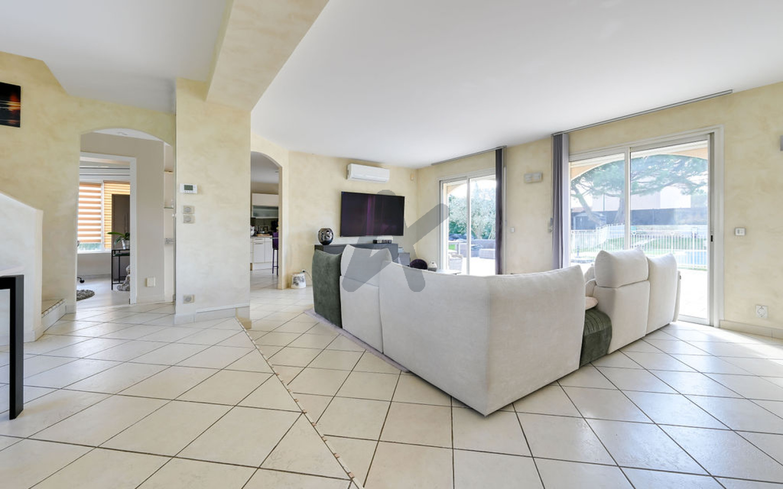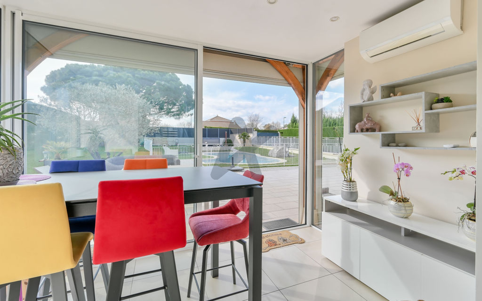 Maison climatisée de 175 m² habitables sur un terrain clos de 1 289 m², offrant de belles prestations avec piscine, jacuzzi, terrasse, carport, atelier et terrain de pétanque.