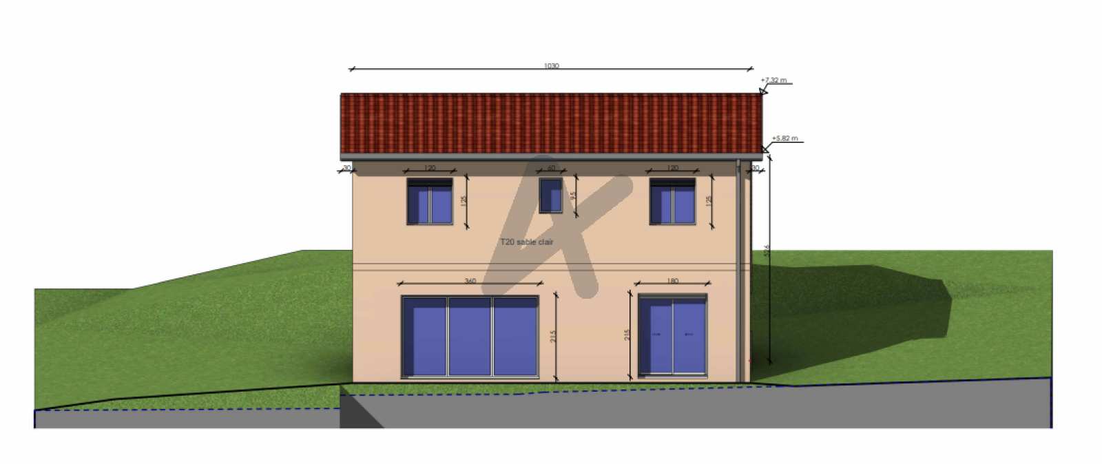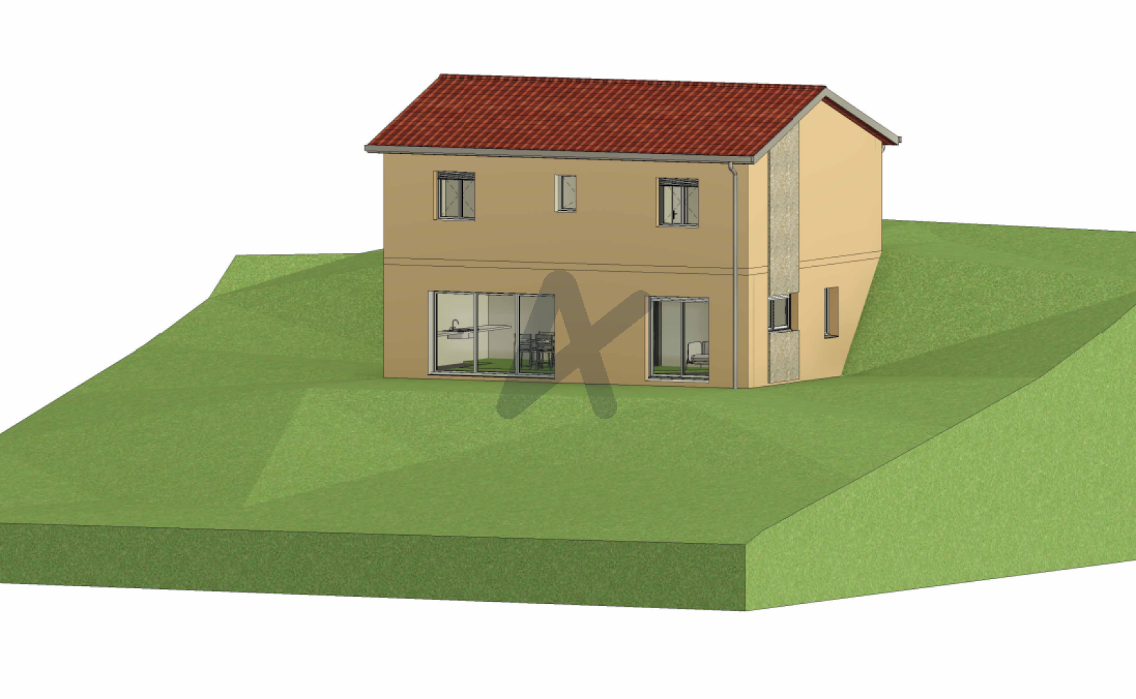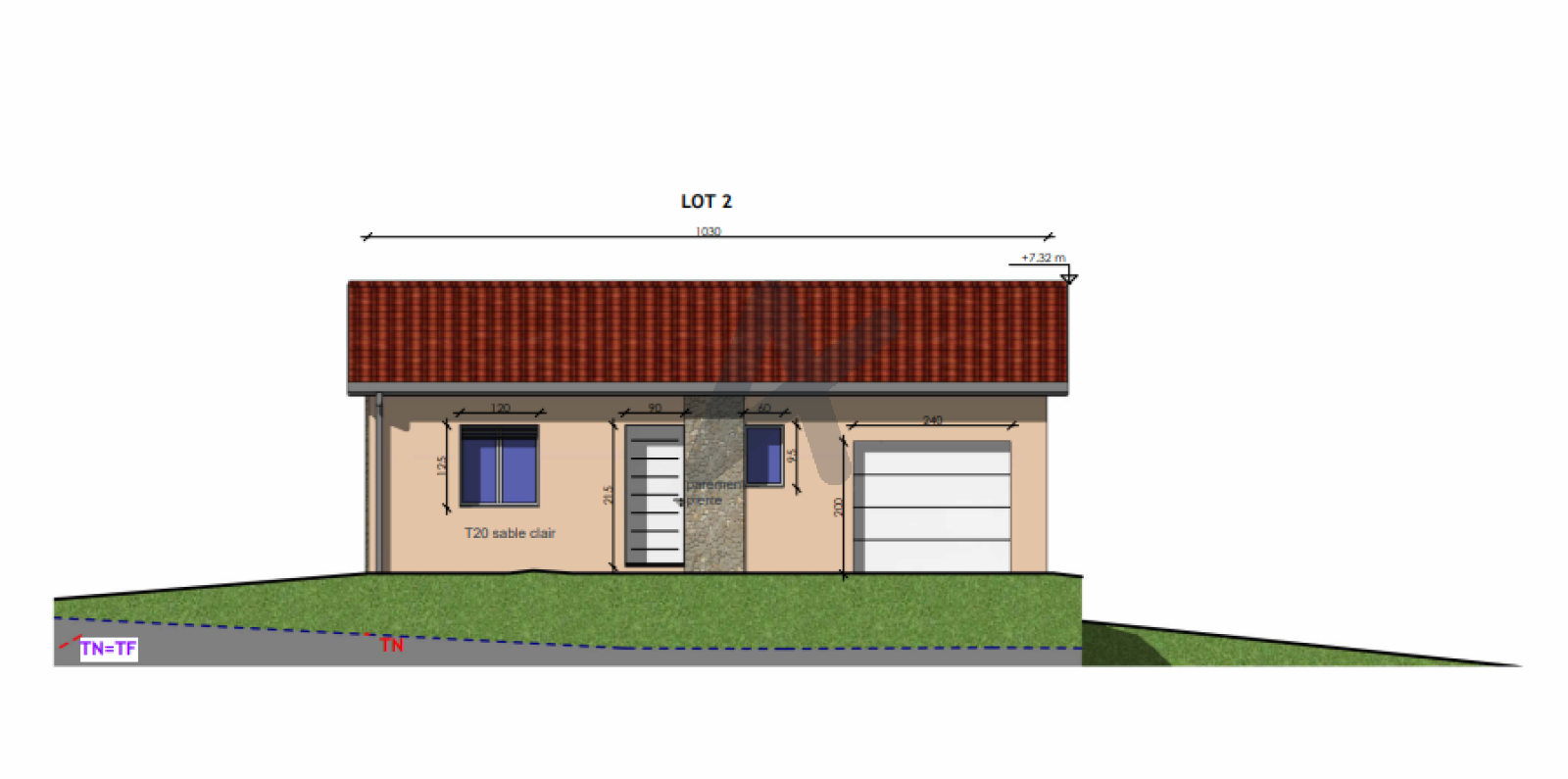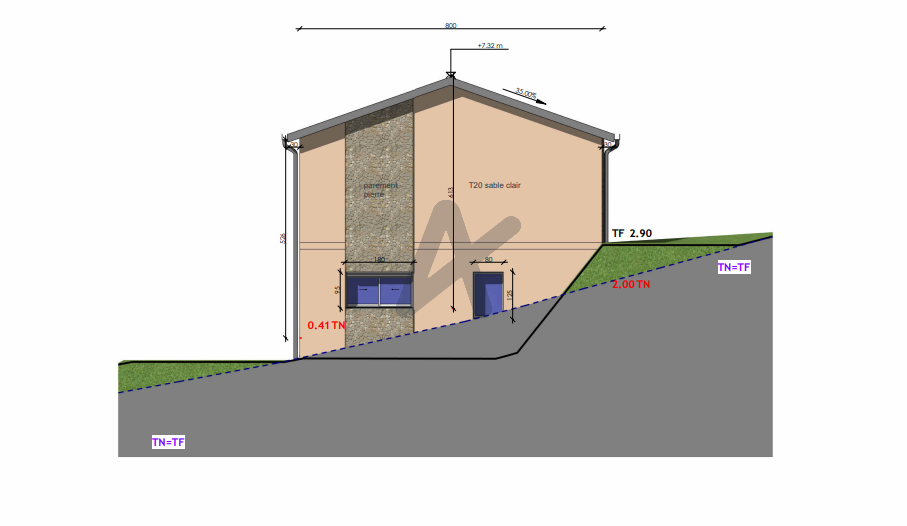 La pente naturelle du terrain lui permet un accès direct de plain pied par l'avant (coté voirie) par l'arriere sur le terrain.