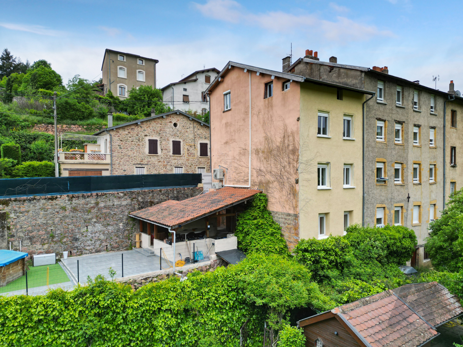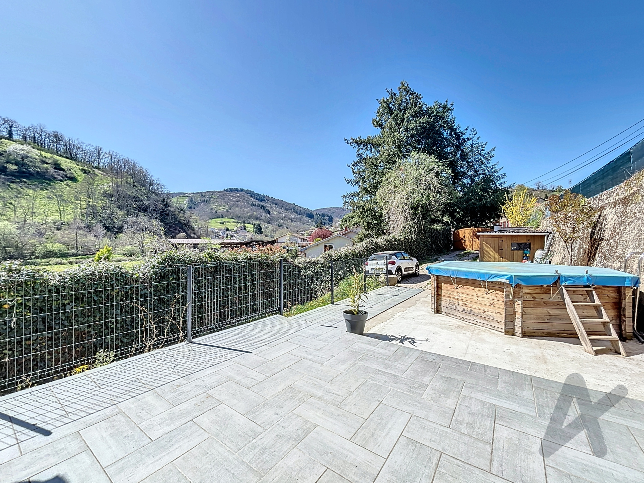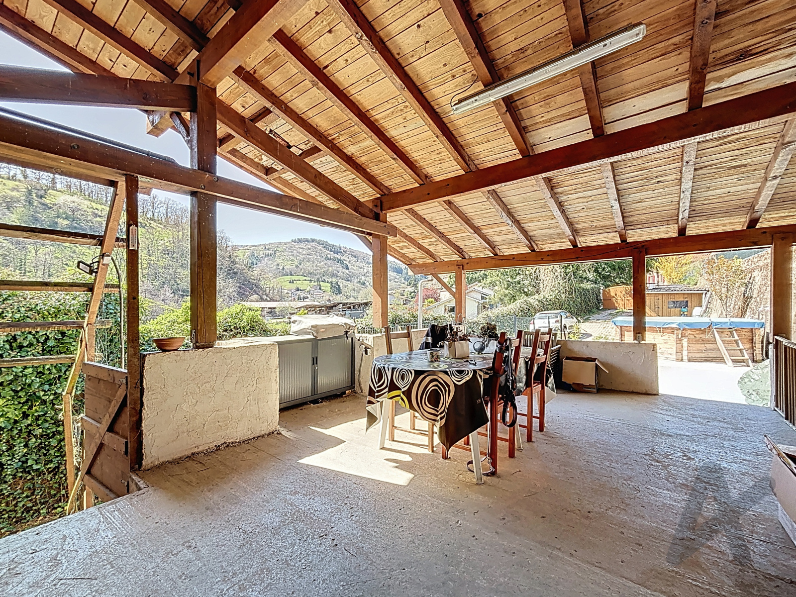 Une grande terrasse couverte donne sur un jardin clos et calme.