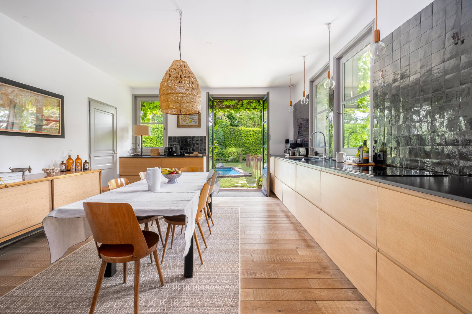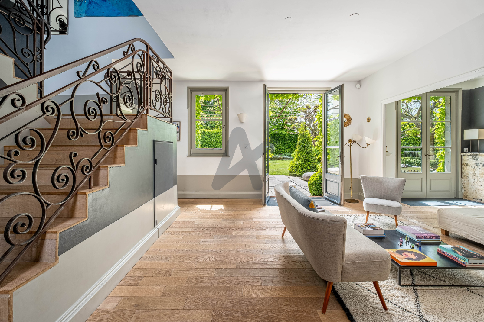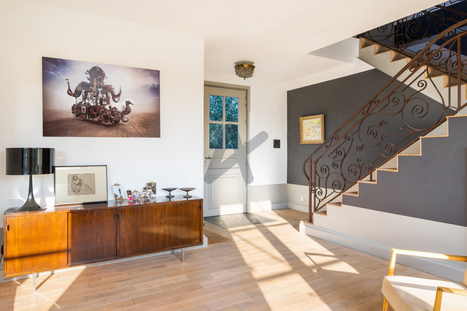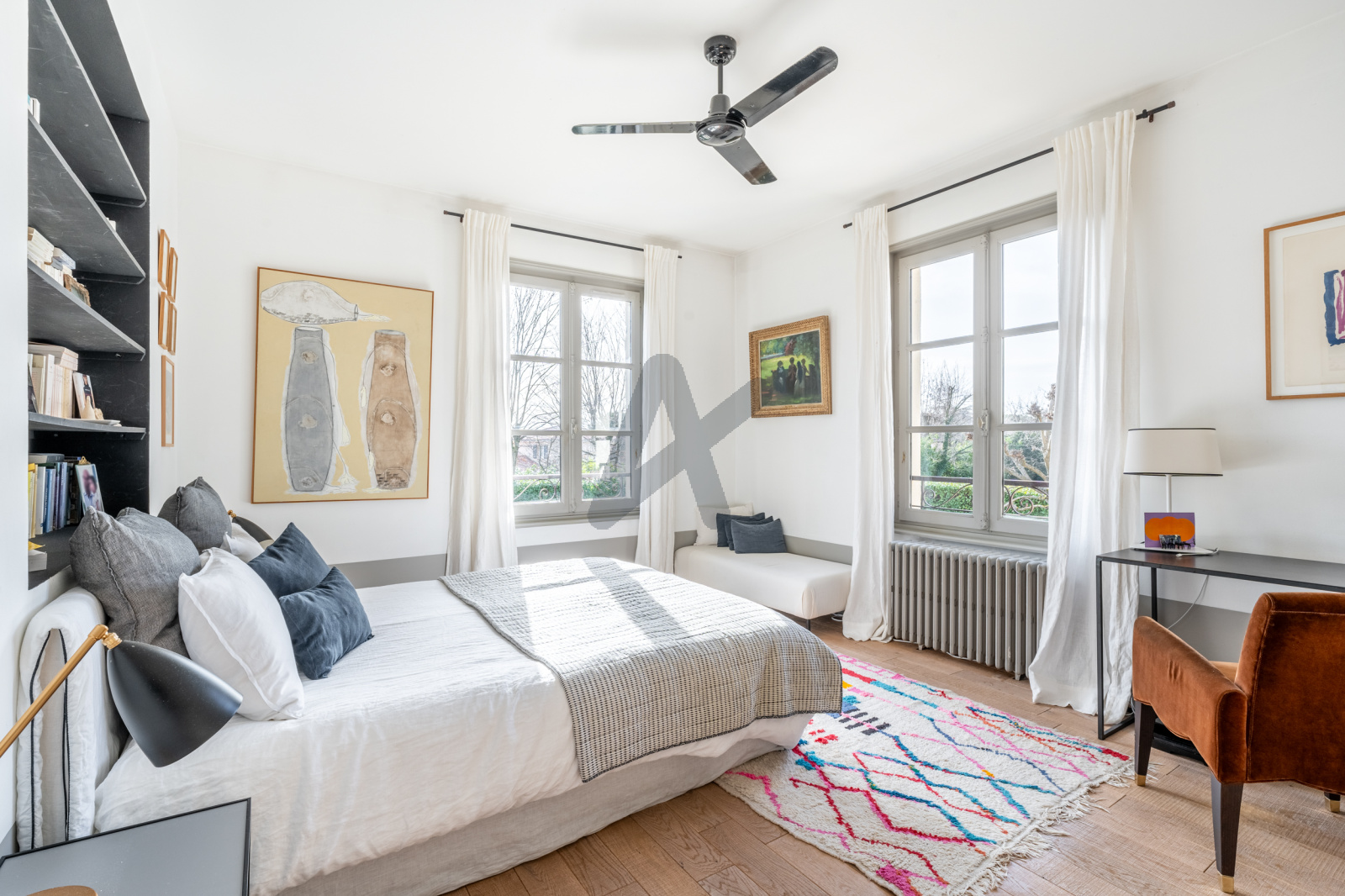 Bastide exceptionnelle à Sant-Didier au Mont d'Or, en impasse, au calme, charme et caractère pour cette superbe maison d'environ 283 m² habitables environ baignée de lumière offrant au rez de chaussée 92 m² de réception séjour et salle à manger en enfilade ouvrant de plain pied sur la terrasse et le jardin, une grande cuisine familiale avec office attenant. Une chambre d'amis /salon TV + salle d'eau. A l'étage un large couloir dessert 5 chambres dont la suite parentale avec dressing et salle de bains, ainsi que 4 chambres,1 salle de bains et 1 salle d'eau. Vous serez séduits par l'authenticité des matériaux (parquet chêne massif, cheminée en pierre...) ainsi que par le confort, la qualité des prestations, la décoration soignée et intemporelle. Le jardin clos et paysager de 1 260 m² exposé plein sud offre une très belle terrasse à vivre de 100 m² avec pergola, fontaine ainsi qu'une piscine bassin parfaitement nichée dans la verdure. Nombreux rangements, état irréprochable, 1 garage double + parking extérieur, bus à 50 mètres. Maison coup de coeur à découvrir.