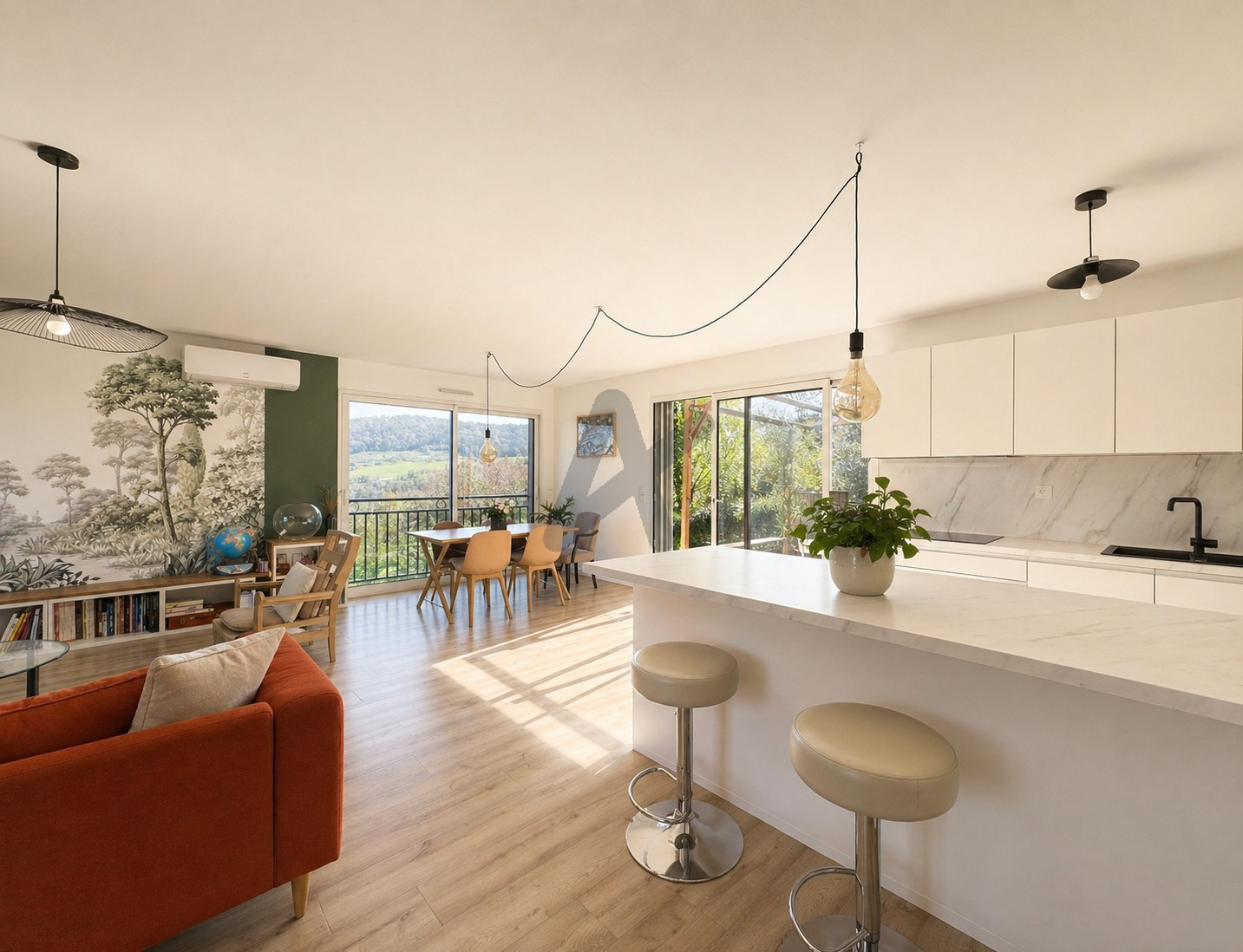 Coup de cœur assuré pour la grande pièce de vie très lumineuse, bénéficiant d’une vue imprenable sur la nature et le village. Elle ouvre directement sur le jardin et comprend une cuisine équipée ouverte, fonctionnelle et conviviale.