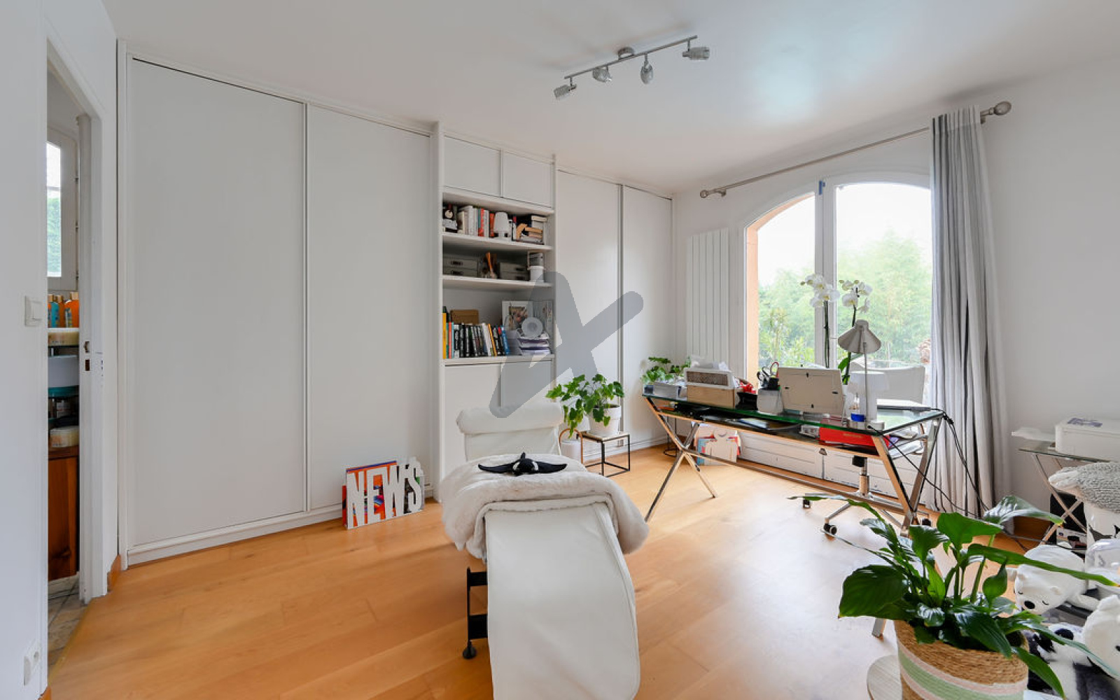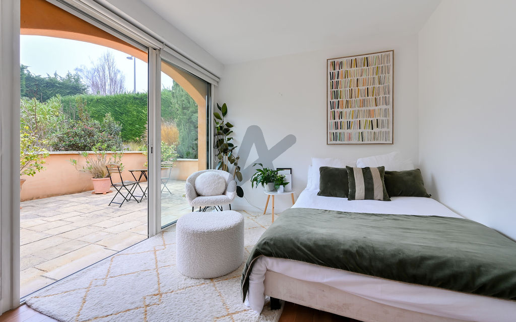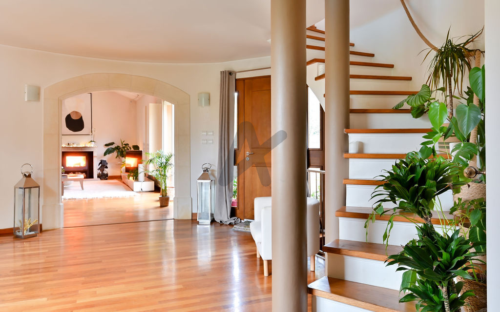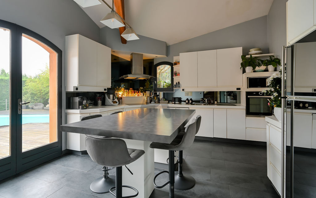 La cuisine fermée, fonctionnelle et parfaitement intégrée, communique harmonieusement avec l’entrée, le séjour et l’extérieur, facilitant la circulation au quotidien. Un vestiaire et des toilettes invités complètent l’espace jour.