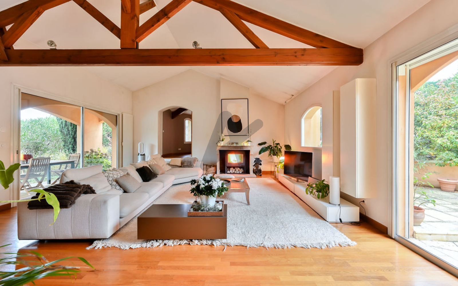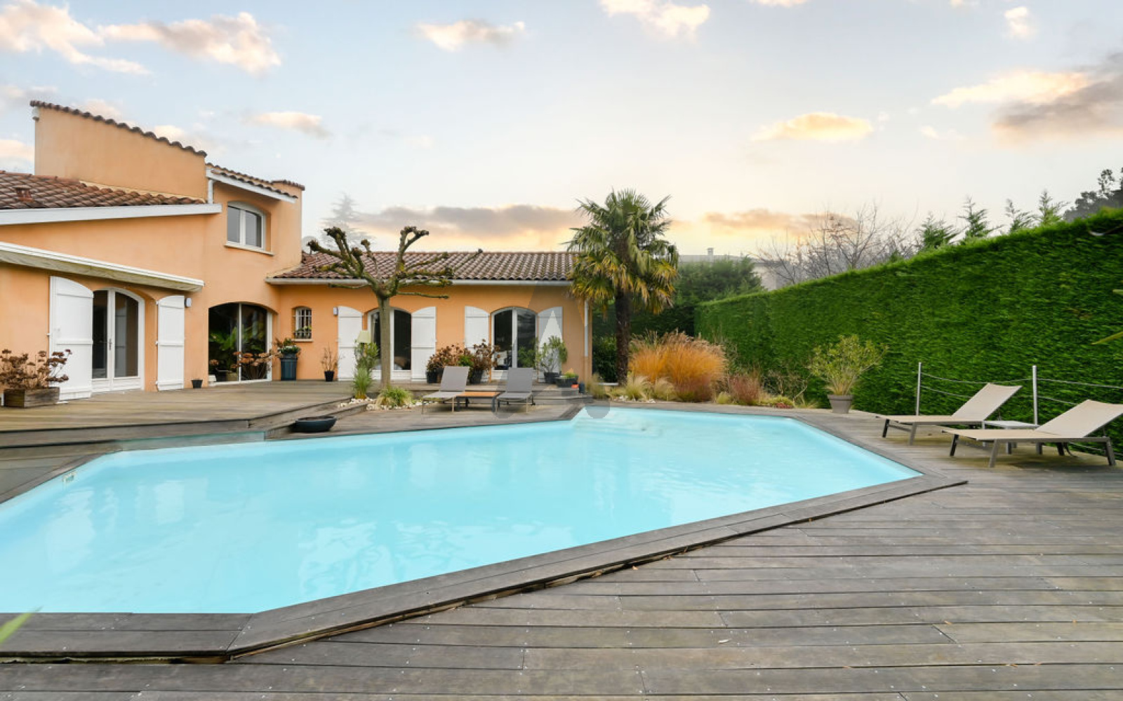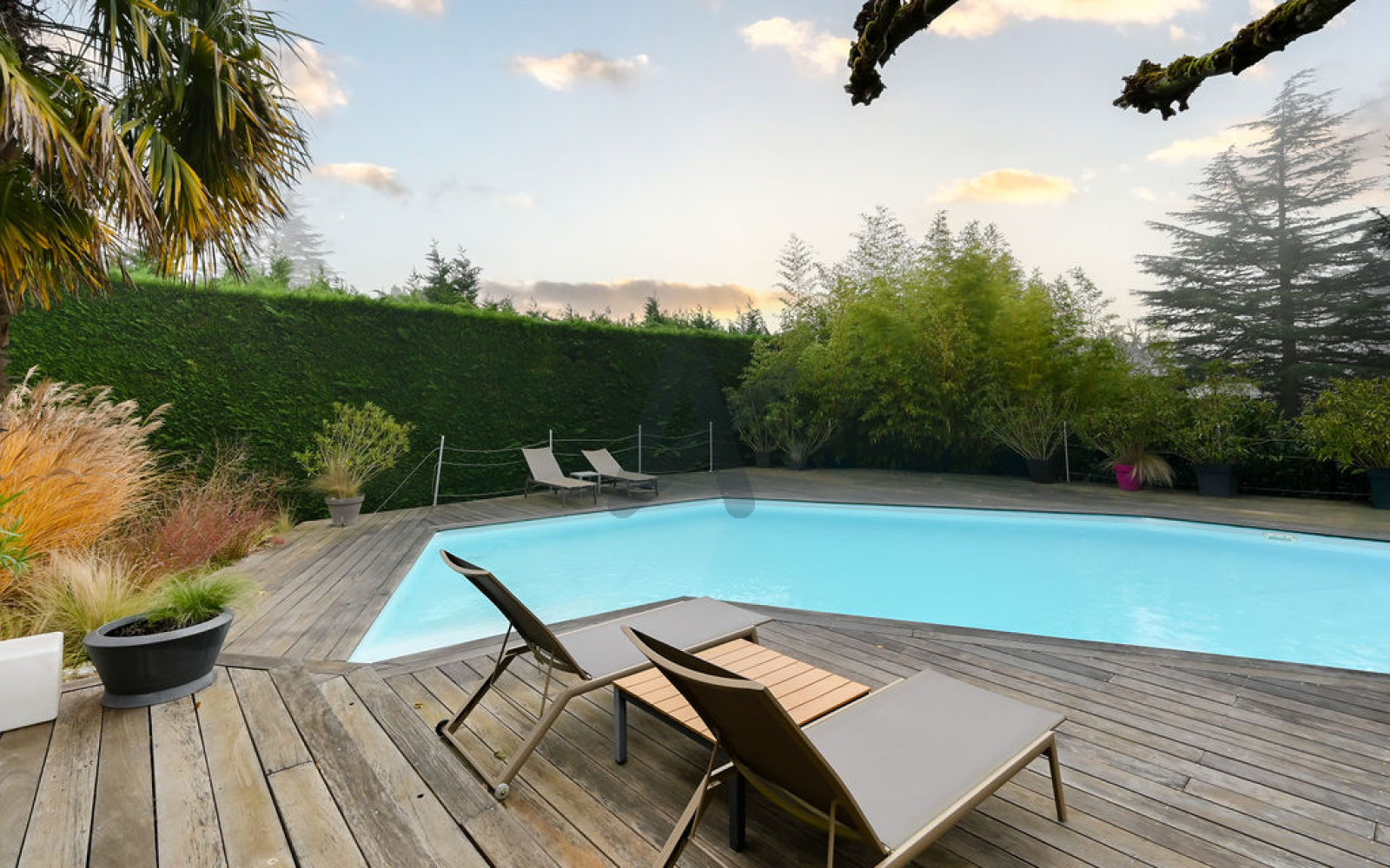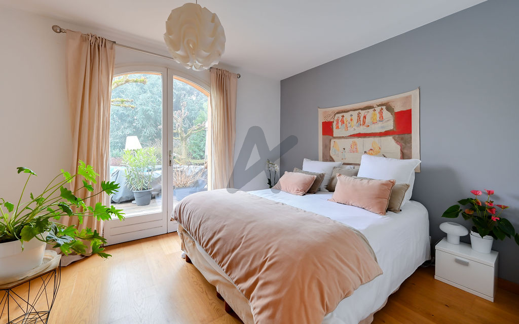 À l’extérieur, le jardin paysagé, intime et soigneusement aménagé, accueille une piscine chauffée, une élégante terrasse en bois et un terrain de pétanque, invitant à la détente et à la convivialité.