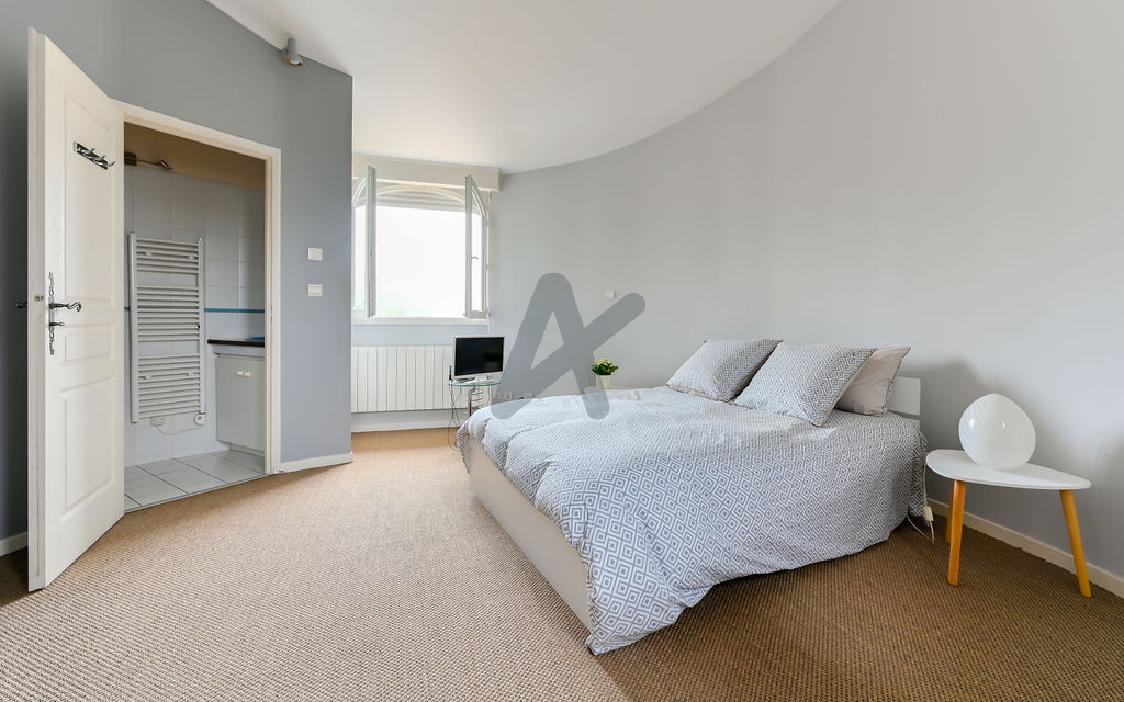 À l’étage, nichée dans la tour, une chambre indépendante avec salle d’eau offre un lieu idéal pour recevoir famille ou invités.
