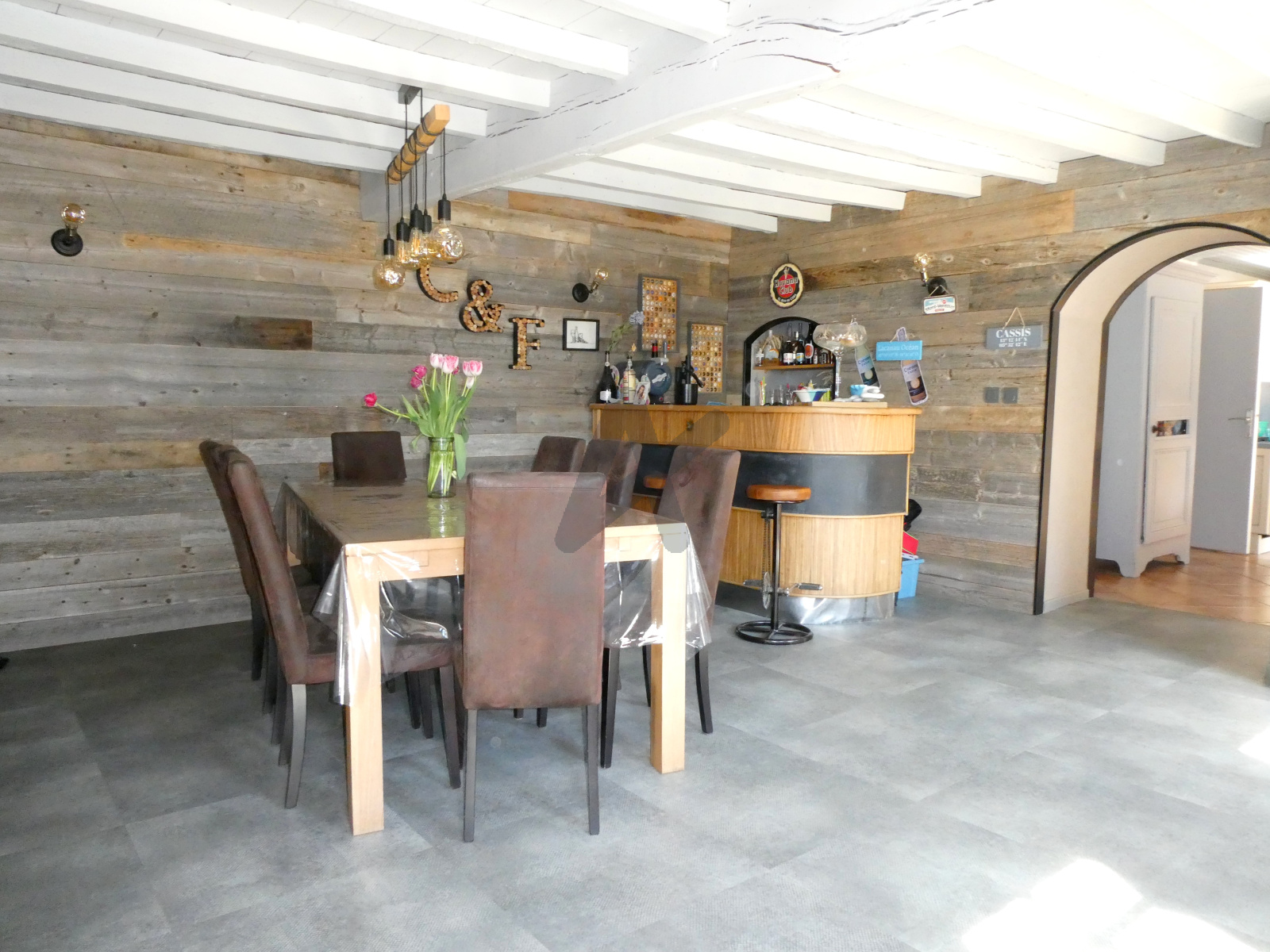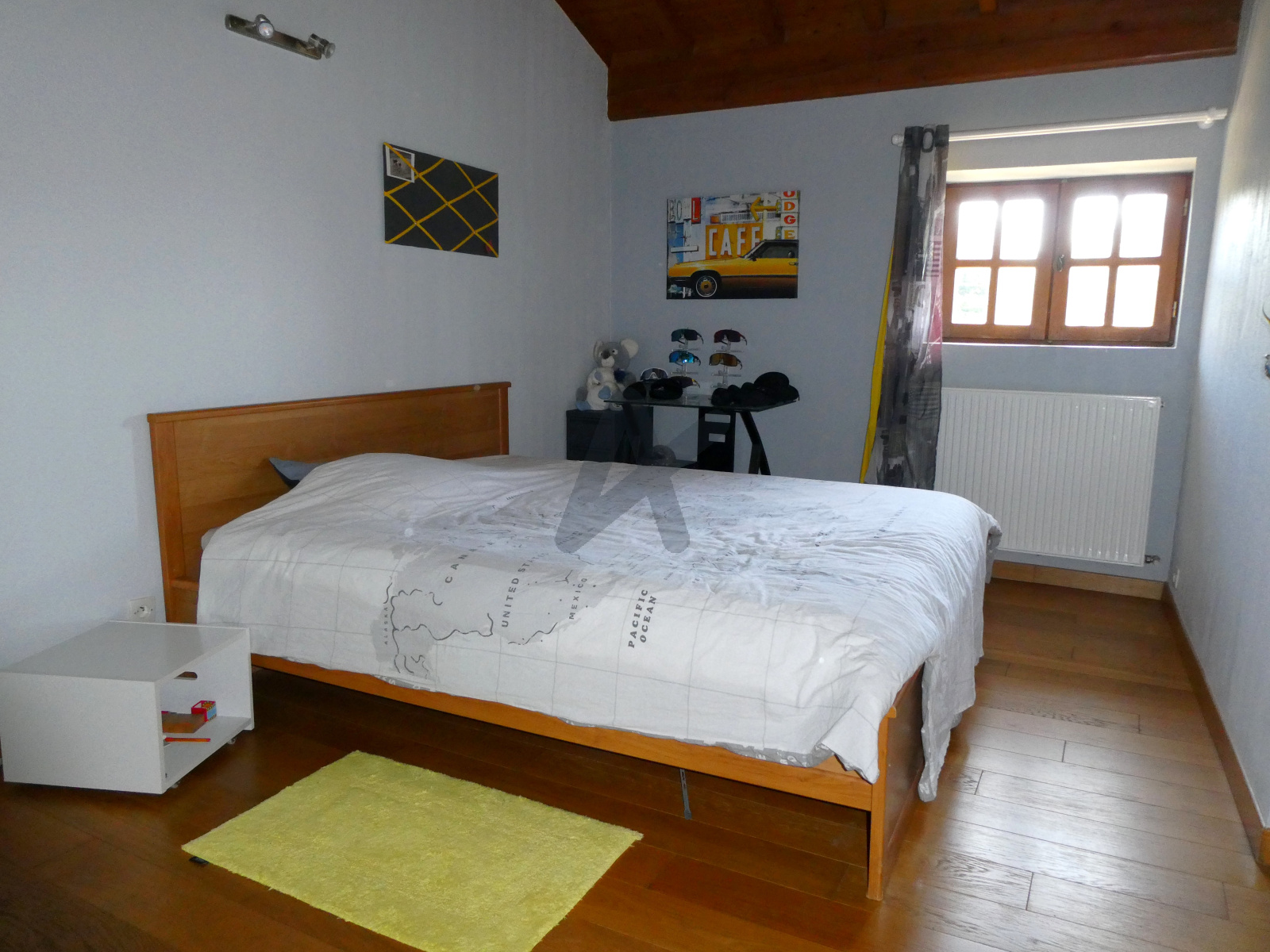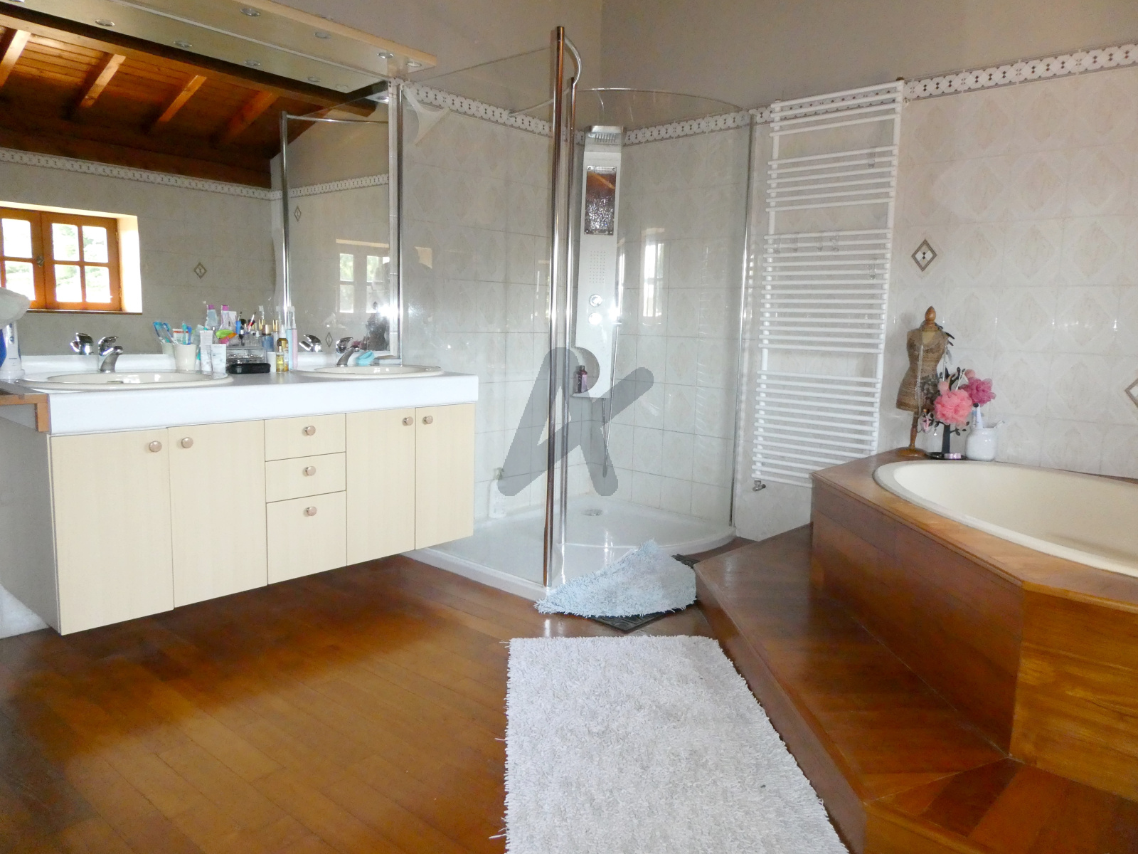 A l'étage : 3 chambres dont une avec dressing, une immense salle de bains, WC et dégagement. Vous disposerez également d'un garage fermé, d'une belle cave voutée, chaufferie ainsi que d'un hangar donnant sur une cour fermée et 1100 m² de terrain attenant.
