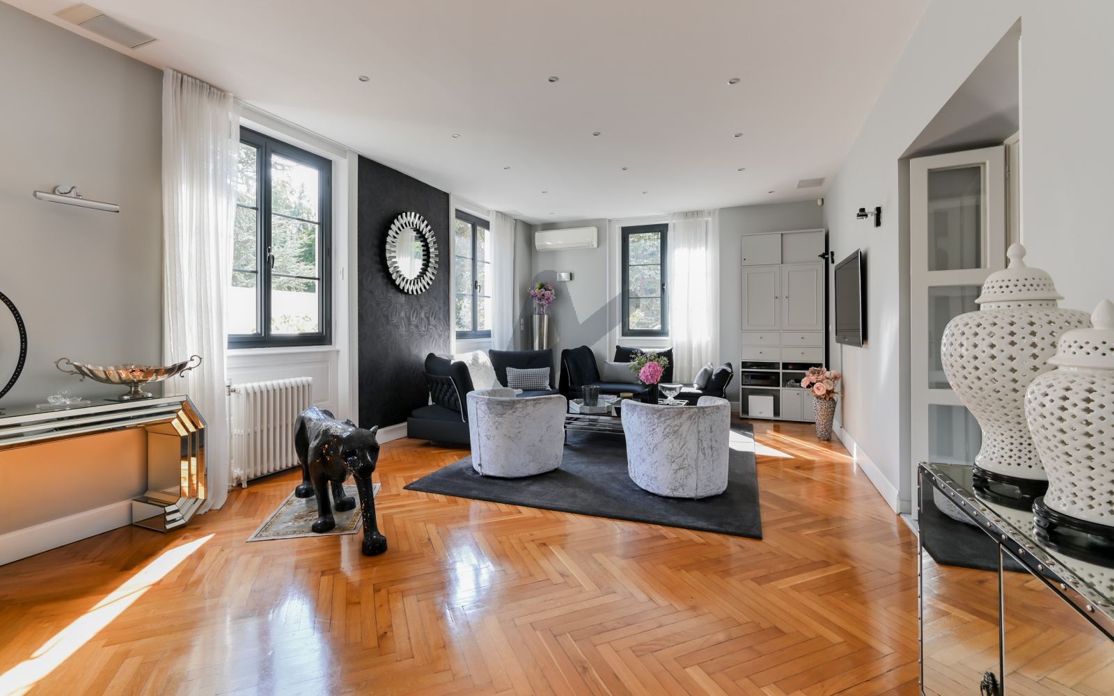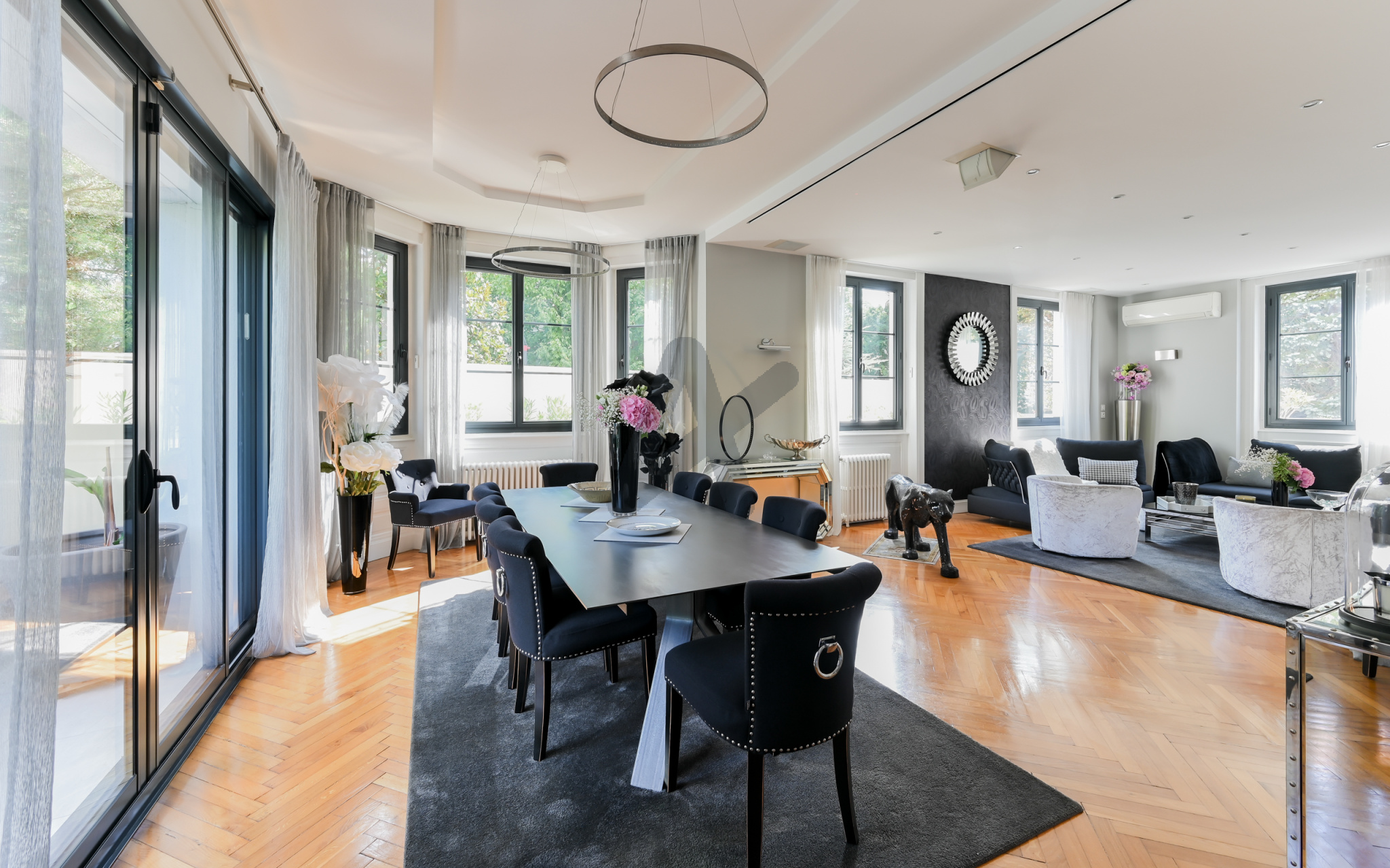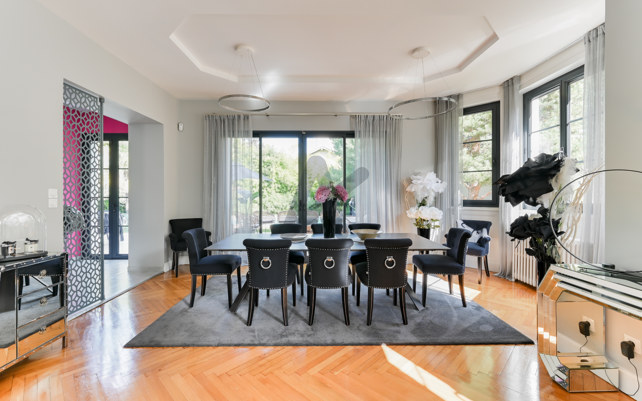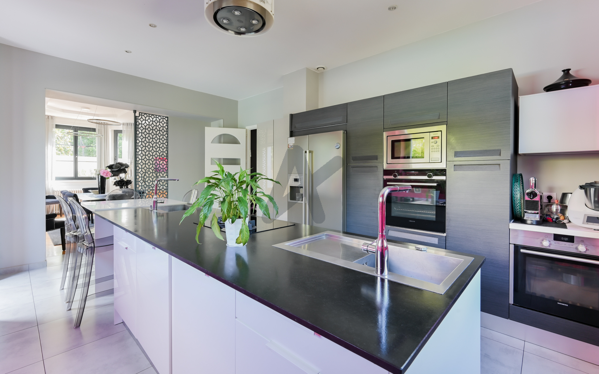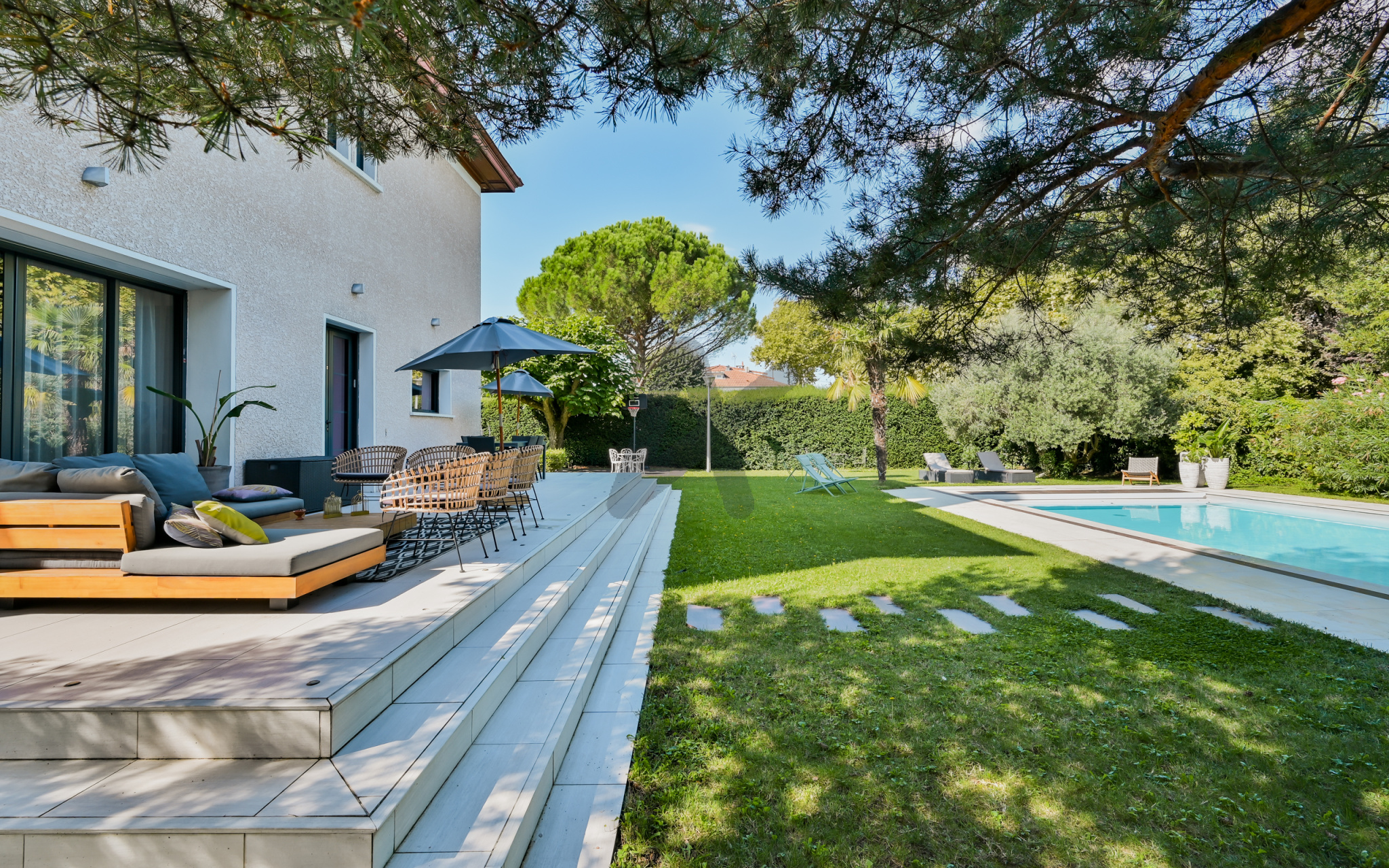 BRON-Mairie, secteur hotel de ville, dans rue calme, quartier prisé et résidentiel à proximité de toutes les commodités, maison ancienne de caractère entièrement rénovée dans les règles de l'art. Les 241 m2 habitables se déploient sur 3 niveaux. Au rez de chaussée, un vaste hall d'entrée dessert une double réception lumineuse avec son bow-window typique des années 30,une très belle cuisine équipée, le tout ouvrant sur une superbe terrasse aménagée. Une élégante montée d'escaliers en chêne dessert les étages supérieurs avec 4 chambres, 3 salles de bains, dont une suite avec dressing et salle de douche privatifs et un loft de 64 m2 avec sanitaires pouvant aisément accueillir des chambres supplémentaires. Maison cossue aux prestations soignées: entièrement climatisée, double vitrage,parquets chêne, belle hauteur sous-plafond, nombreux rangements et état irréprochable.Superbe jardin paysager plat et clos de 1300 m2 avec arrosage automatique, abritant une piscine de 5X10 mètres au sel, chauffée et sécurisée par un volet roulant. Sous-sol complet de 84 m2 avec salle de jeux, lingerie, chaufferie et pièce de rangement. Garage double et garage simple fermés, grand parking dans la cour. DPE (C).Les honoraires sont à la charge du vendeur. Bien rare à découvrir chez ARLIM PRESTIGE LAFAYETTE contact Riva MALCI 06 01 01 38 61