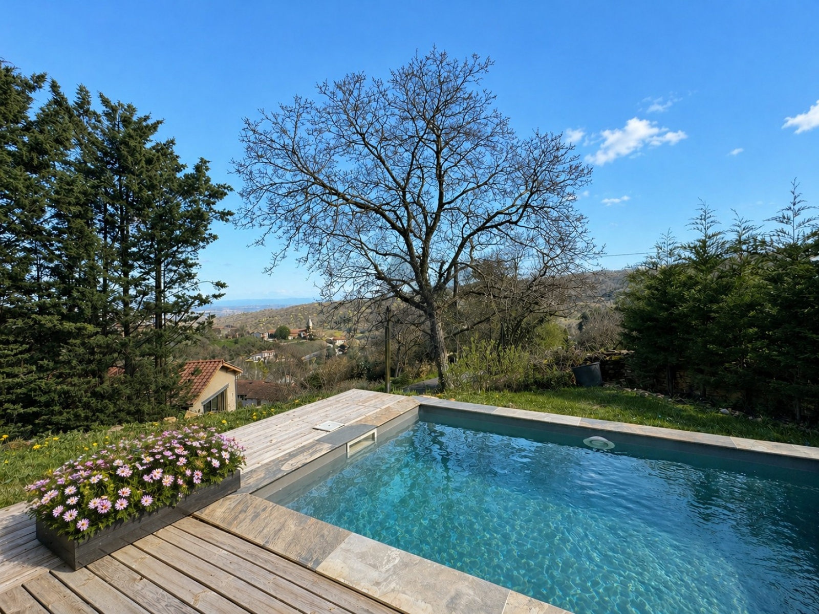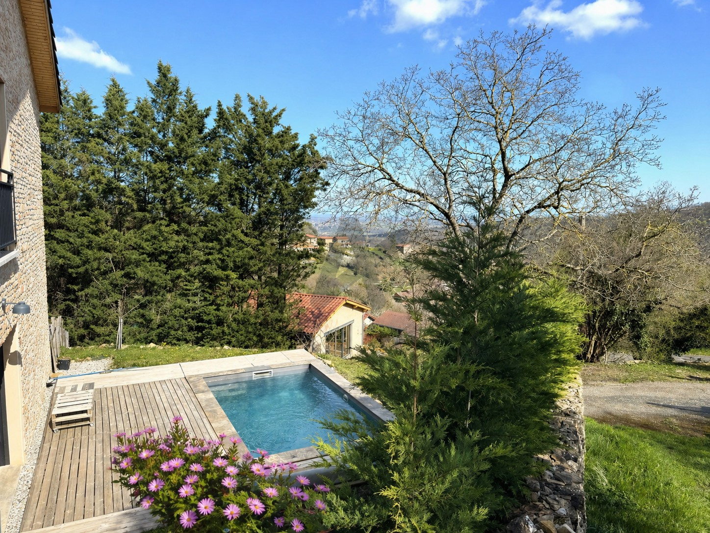 Le jardin accueille une piscine chauffée avec nage à contre-courant.