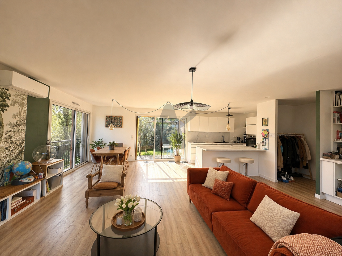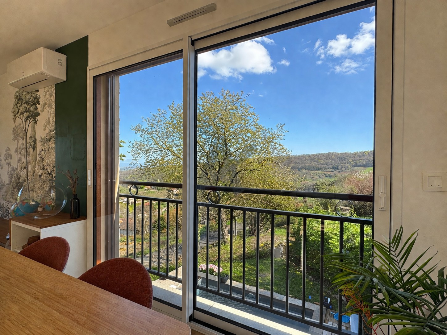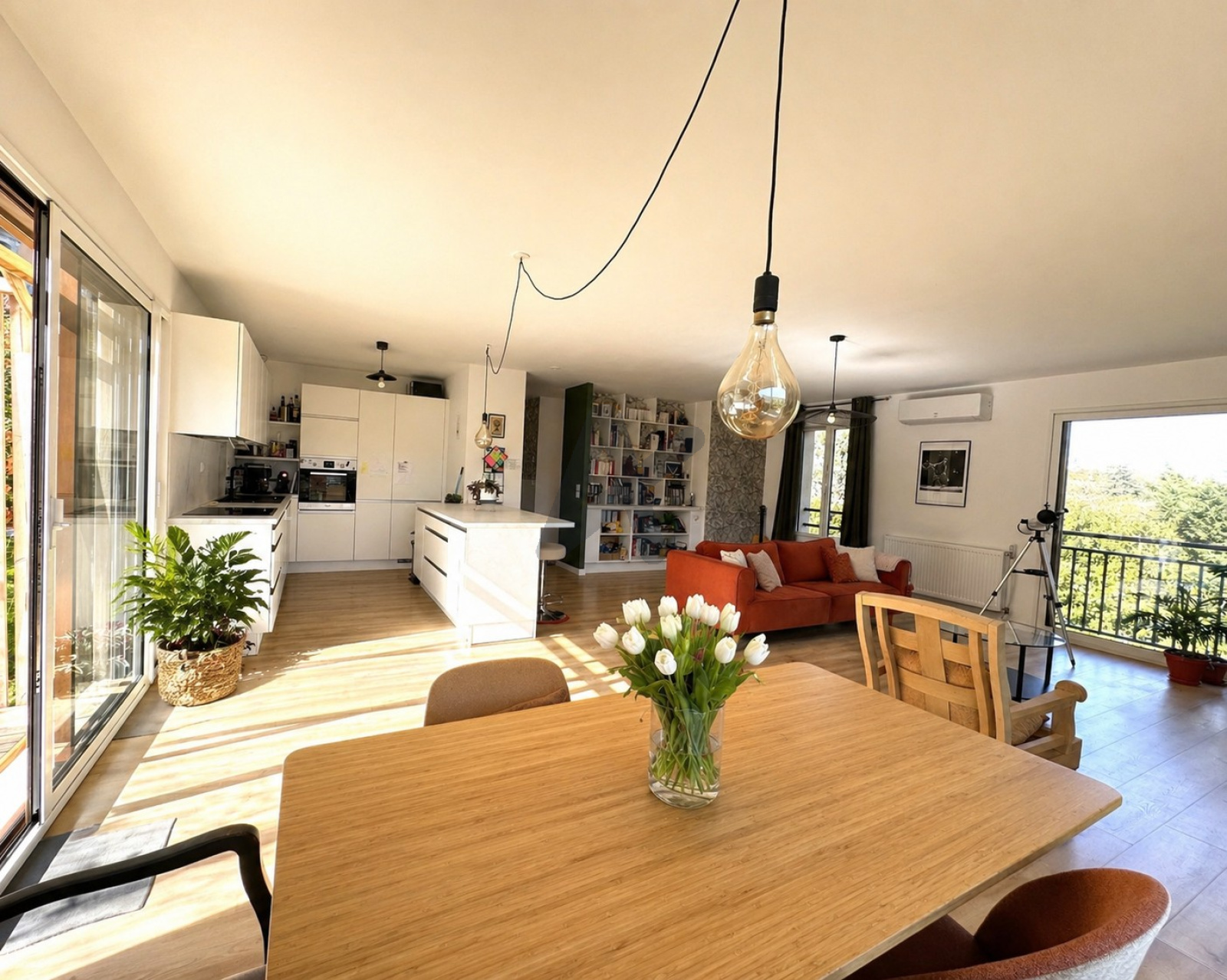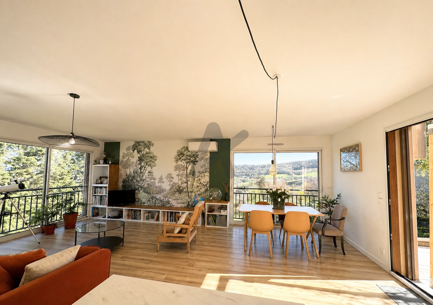 Coup de cœur assuré pour la grande pièce de vie très lumineuse, bénéficiant d’une vue imprenable sur la nature et le village. Elle ouvre directement sur le jardin et comprend une cuisine équipée ouverte, fonctionnelle et conviviale.