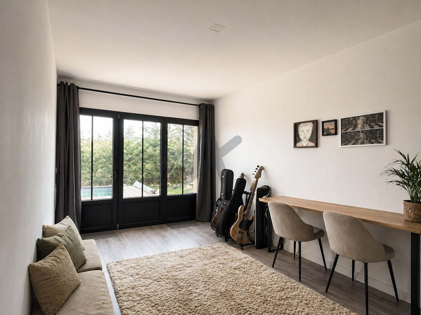 La maison dispose également d’une pièce avec grande verrière pouvant faire office de salle de jeux, bureau, chambre d’appoint ou espace loisirs.
