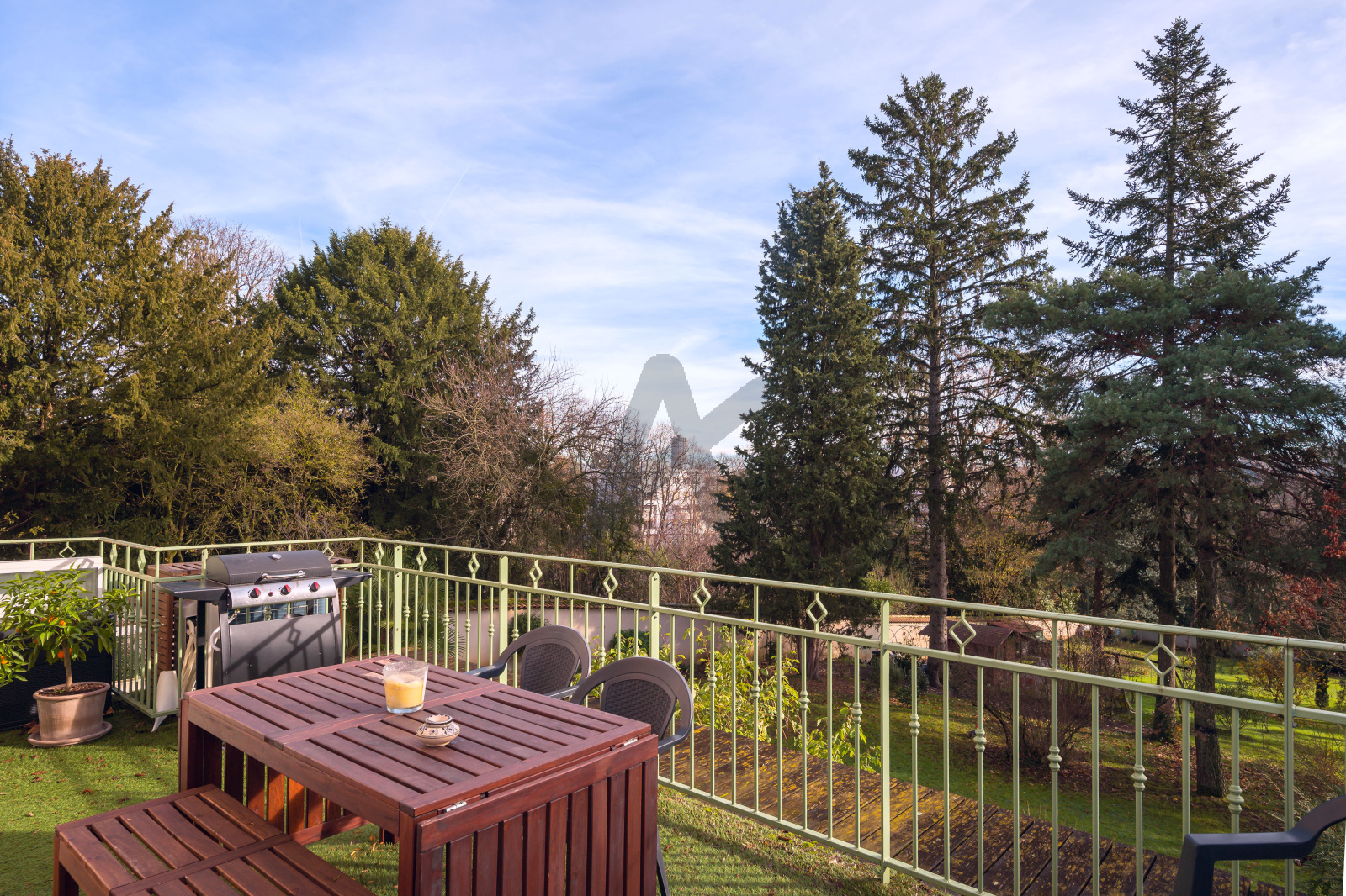 Il bénéficie d'une belle terrasse avec une vue dégagée sur le parc et les arbres centenaires, d'un jardin de 500m2 à usage privatif, ainsi que d'un garage (avec prise éléctrique) et de 2 places de stationnement.