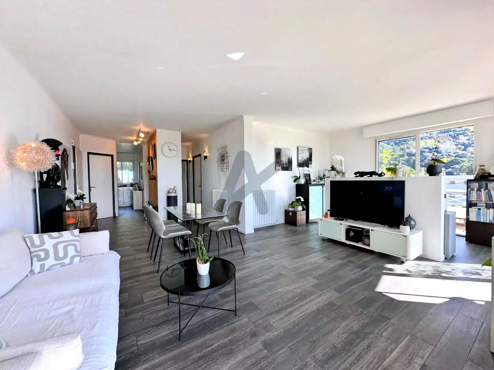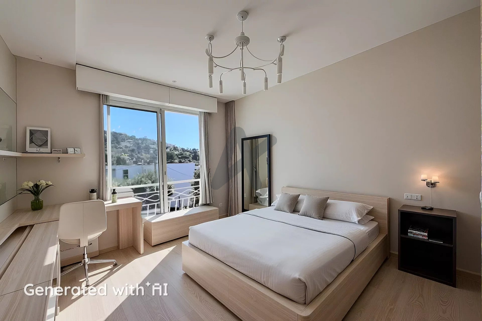 Il est composé d'une entrée avec rangement qui s'ouvre directement sur un double salon avec une terrasse d'angle plongeant sur la verdure, la mer et l'Esterel, deux grandes chambres avec placards intégrés et une seconde terrasse d'angle, une salle de douche, une cuisine et un WC indépendant.