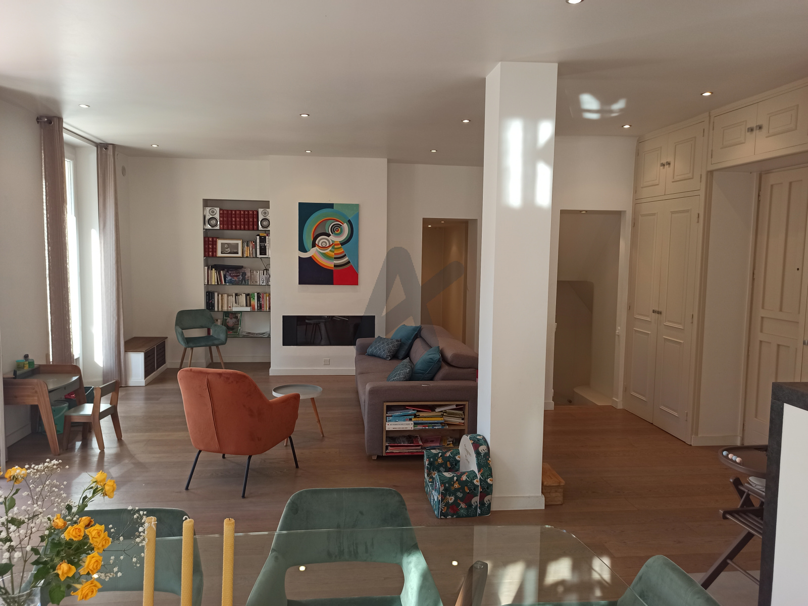 Comme dans une maison, l'appartement se compose d'une belle pièce à vivre de 50m² avec cuisine équipée s'ouvrant sur la terrasse, un WC invité. En rez-de-jardin une chambre de maître de 24m² avec sa salle de bain, une seconde chambre avec sa salle de douche et ses WC, une petite chambre enfant,un bureau et des WC indépendants.