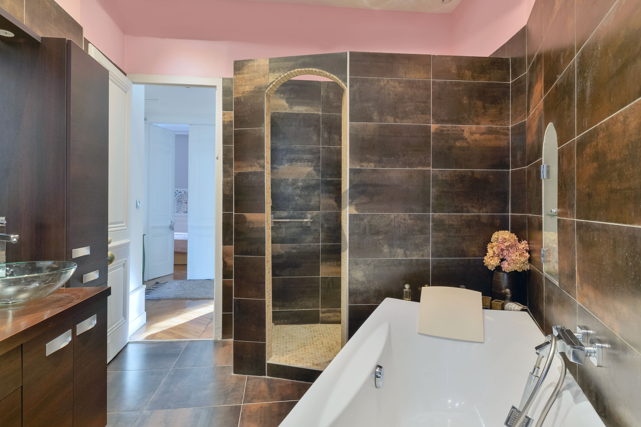 La partie nuit se compose de deux chambres spacieuses, dont une suite disposant d'un dressing intégré, la salle de bain, dotée d'une baignoire et d'une douche, complète l'ensemble avec sobriété. La cahmbre parentale donne sur une cour privée arborée, au calme absolu.