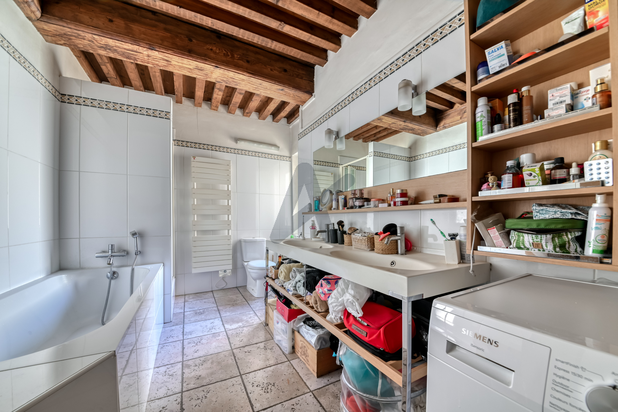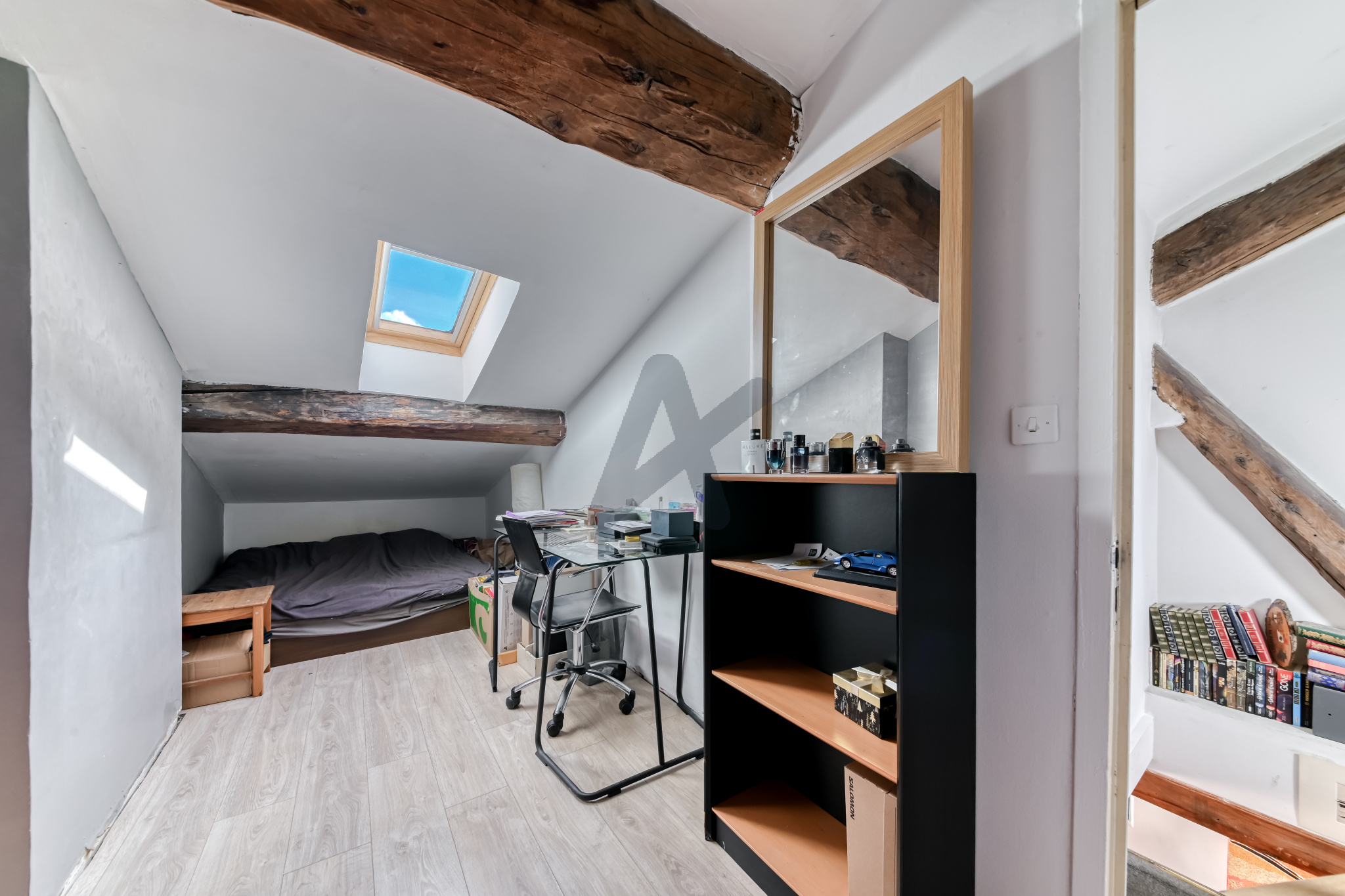 Le niveau duplex, accessible depuis le salon par un escalier en bois propose actuellement 2 chambres respectivement de 12 m2 et 10 m2 au sol, chacune éclairée par un velux. Ces deux pièces pourront être facilement réunies.