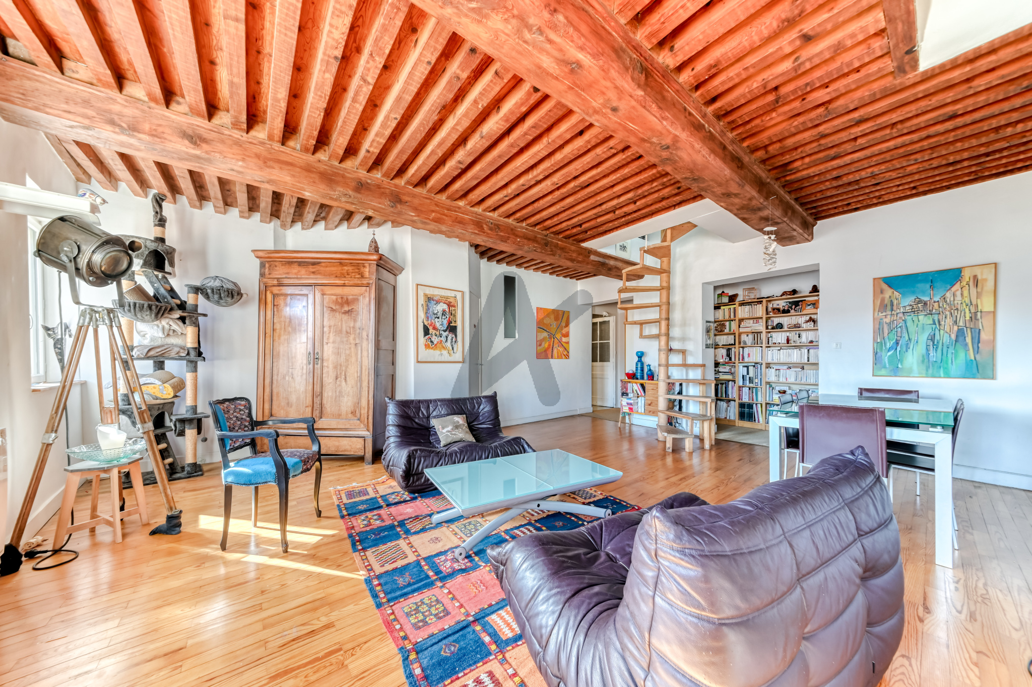 Exclusivité - Bas des pentes de la Croix-Rousse, à proximité du métro Croix-Paquet et de laplace du Forez, très bel appartement 5 pièces duplex en dernier étage de 113 m2 Loi carrez et 128 m2 au sol sur une copropriété sécurisée aux parties communes réhabilitées (façade et montée d'escalier).