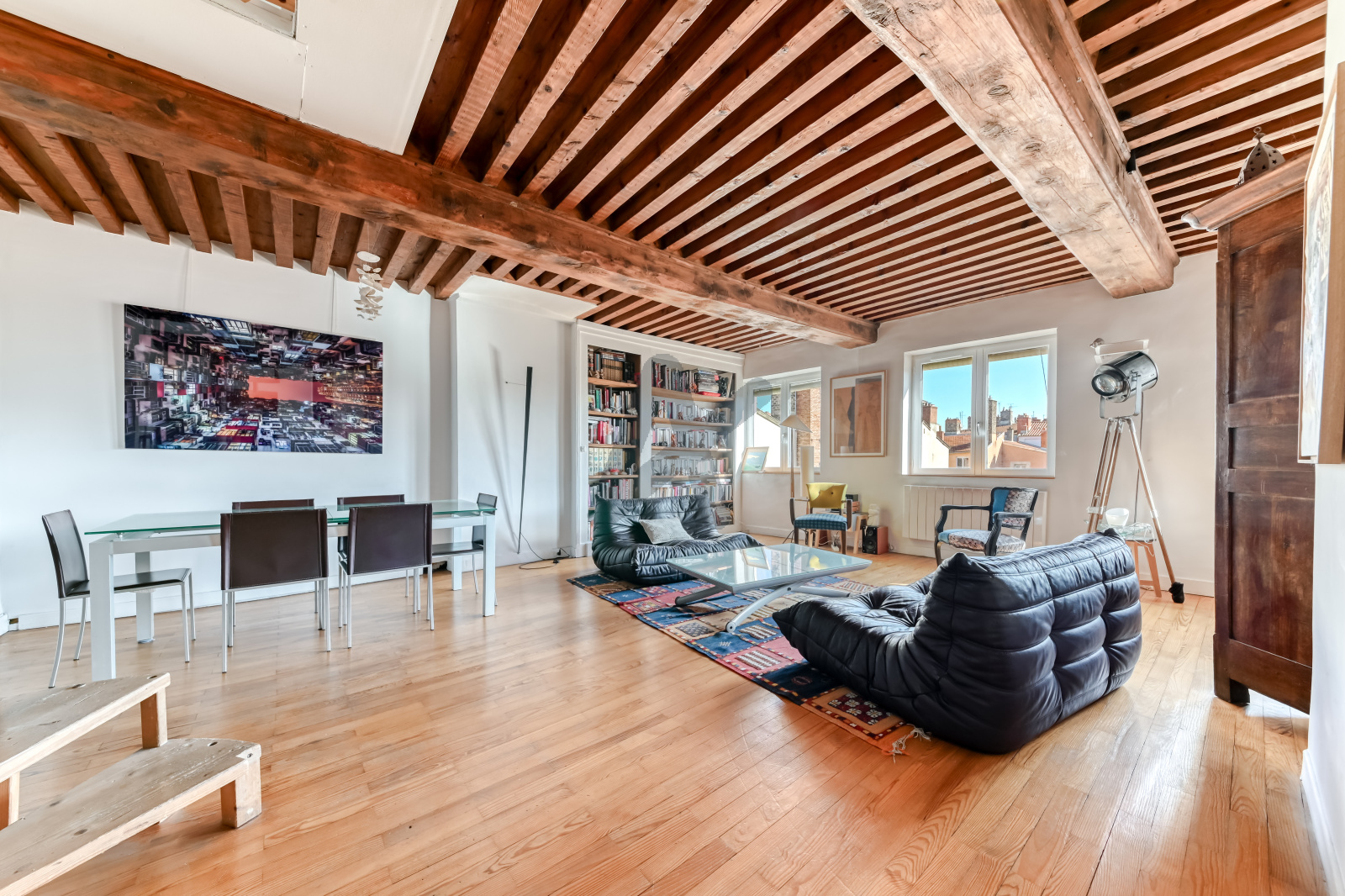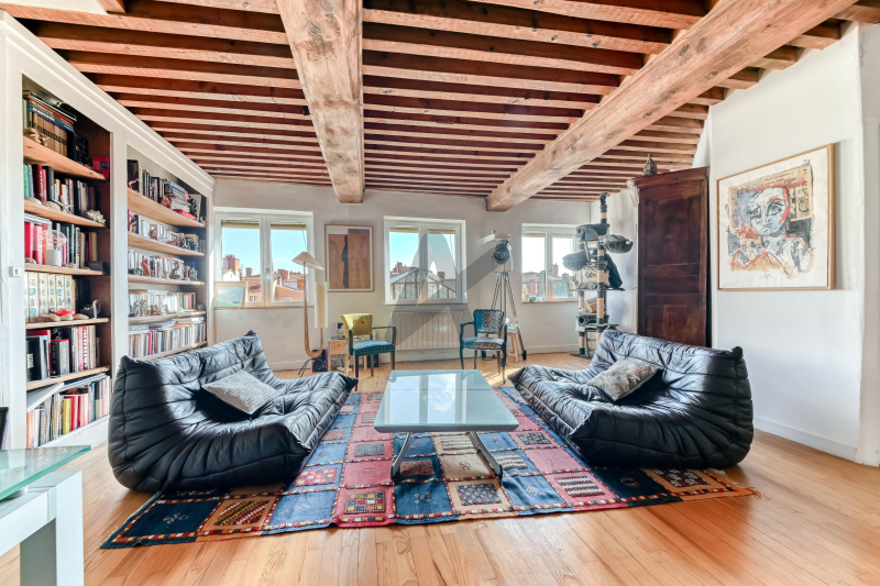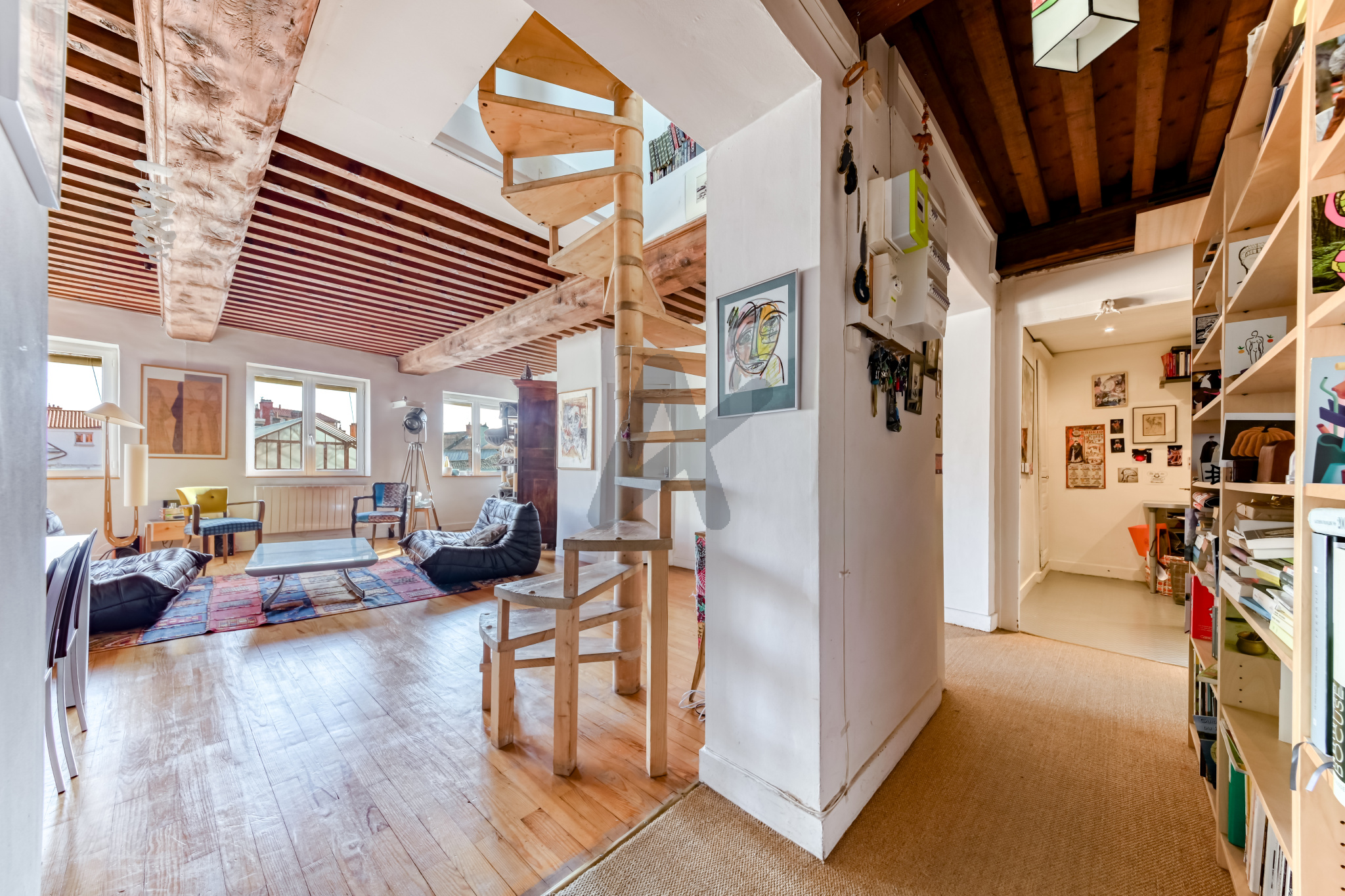 Exclusivité - Bas des pentes de la Croix-Rousse, à proximité du métro Croix-Paquet et de laplace du Forez, très bel appartement 5 pièces duplex en dernier étage de 113 m2 Loi carrez et 128 m2 au sol sur une copropriété sécurisée aux parties communes réhabilitées (façade et montée d'escalier).