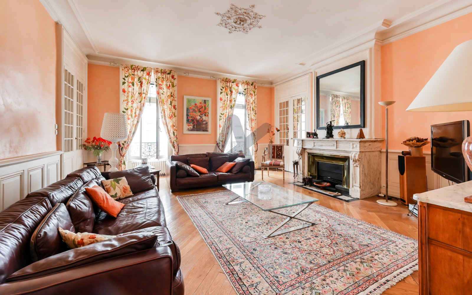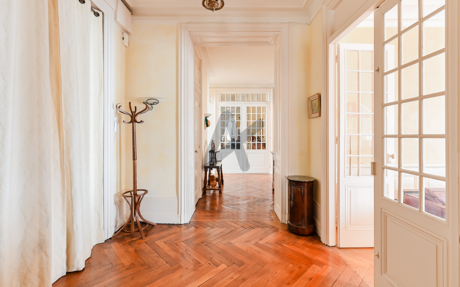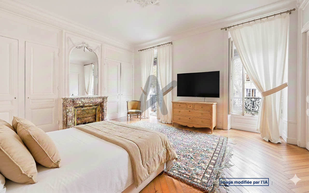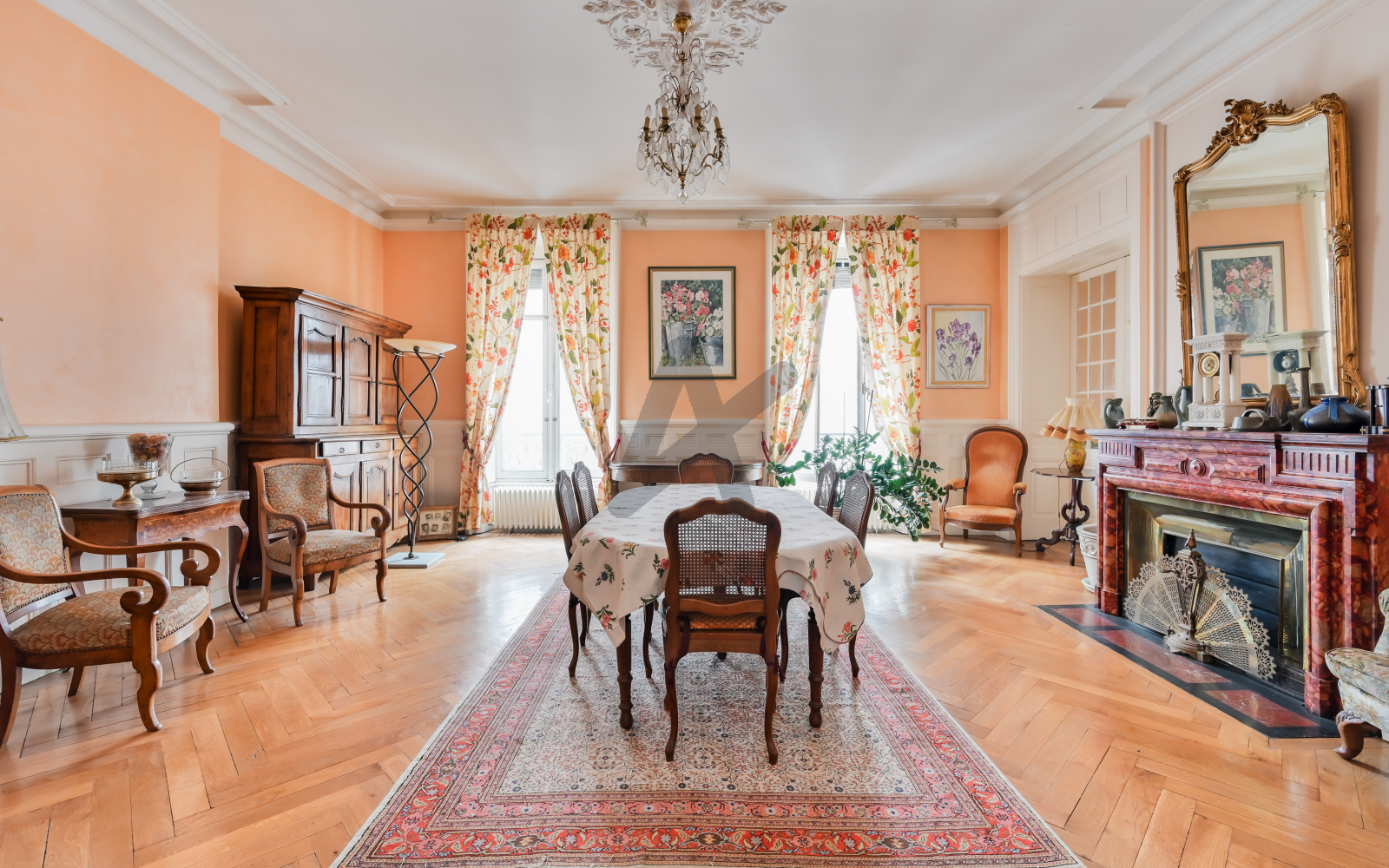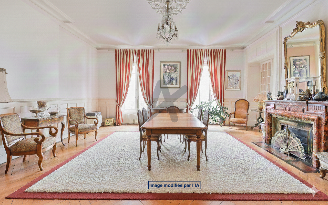 L’entrée galerie met en valeur le charme de l’ancien : parquet d’époque, moulures, cheminées, belle hauteur sous plafond. Deux salons en enfilade forment un espace de réception lumineux, idéal pour une résidence familiale haut de gamme ou un appartement de prestige.