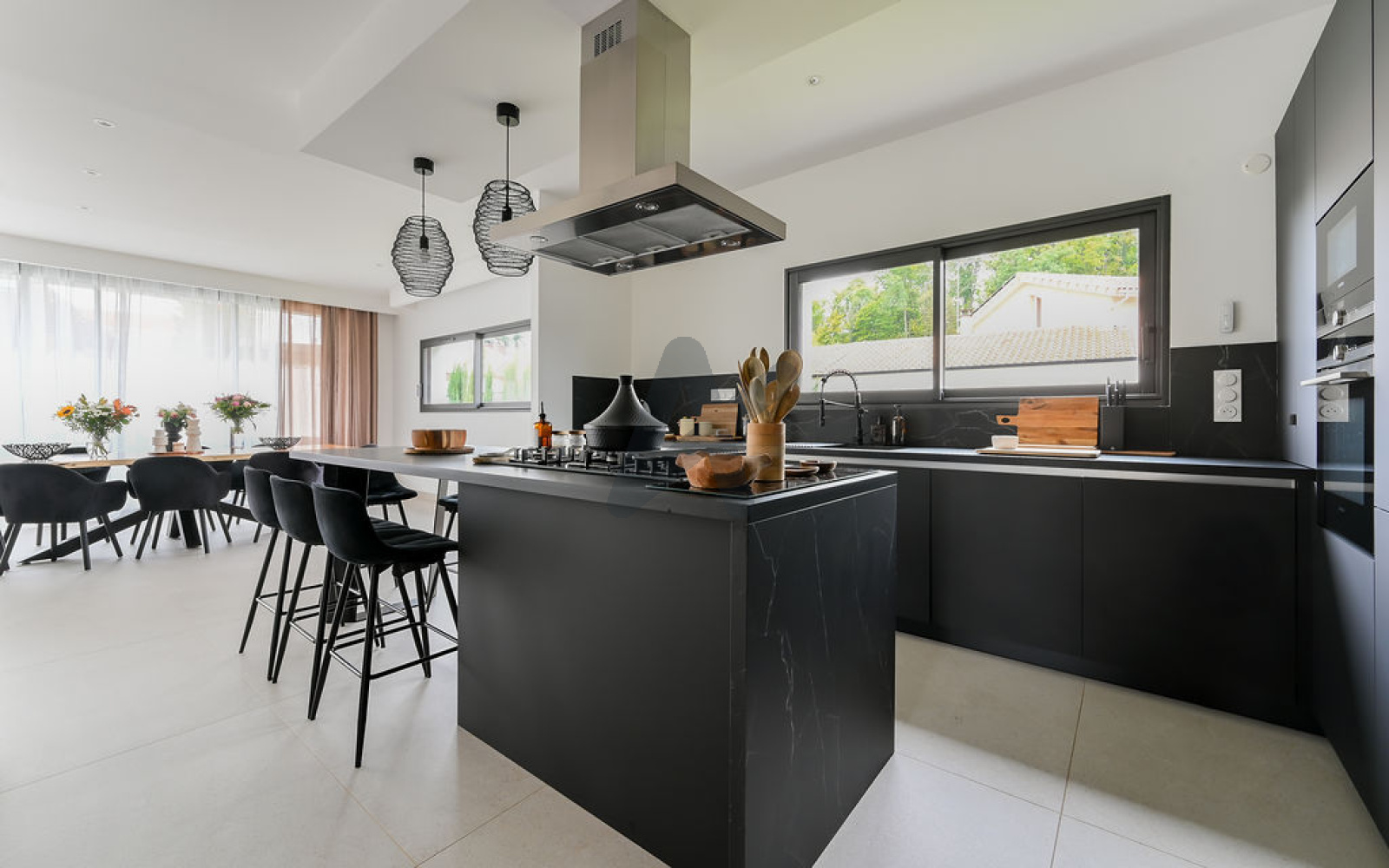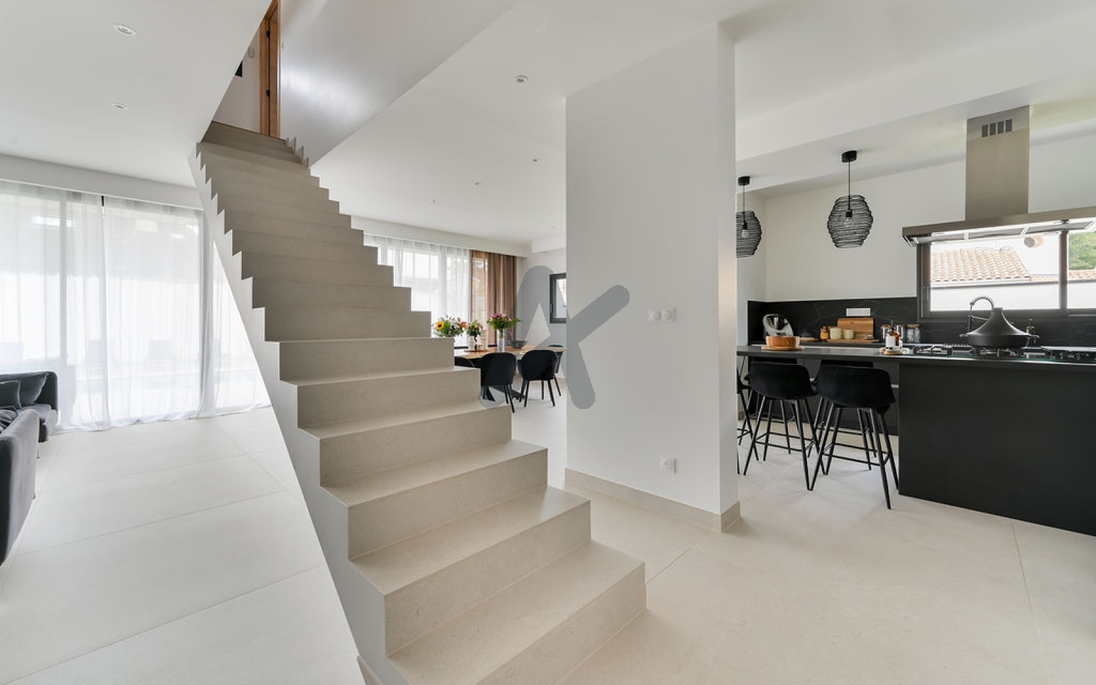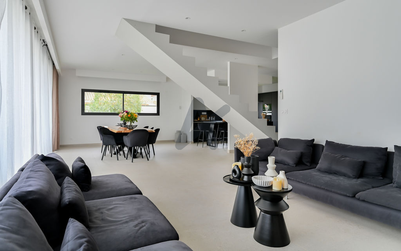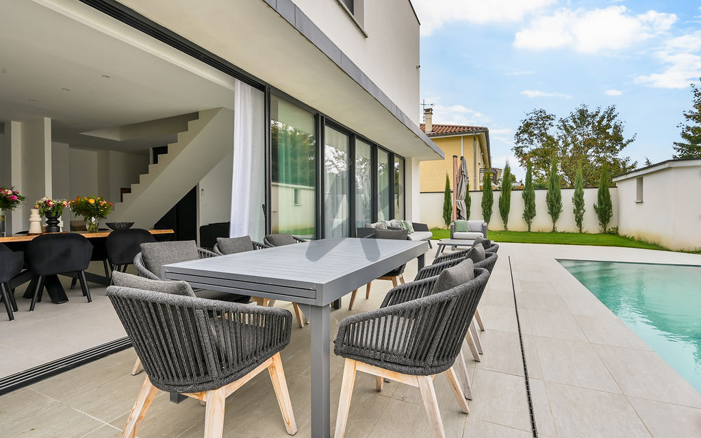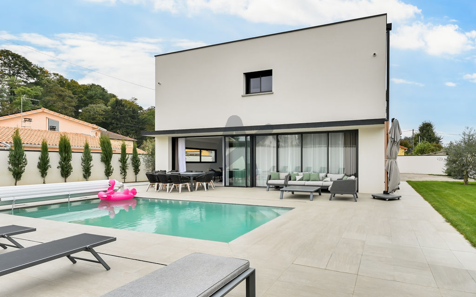 MEYZIEU, rare, secteur calme et résidentiel prisé, centre village , proche écoles, transports et commerces, belle maison contemporaine d' environ 200 m2 habitables sur un terrain de 610 m2 avec piscine exposée plein sud. Elle se compose d' une entrée, d' une très belle pièce de vie lumineuse de 60 m2 environ donnant sur terrasse et piscine , cuisine USA entièrement équipée avec arrière cuisine et buanderie, toilettes, à l' étage, une suite parentale et 4 autres chambres avec parquet et placards, une salle de bains, toilettes, un coin bureau. Belles prestations, belle hauteur sous plafond, baies pièce de vie entièrement rétractables, climatisation, vide sanitaire.