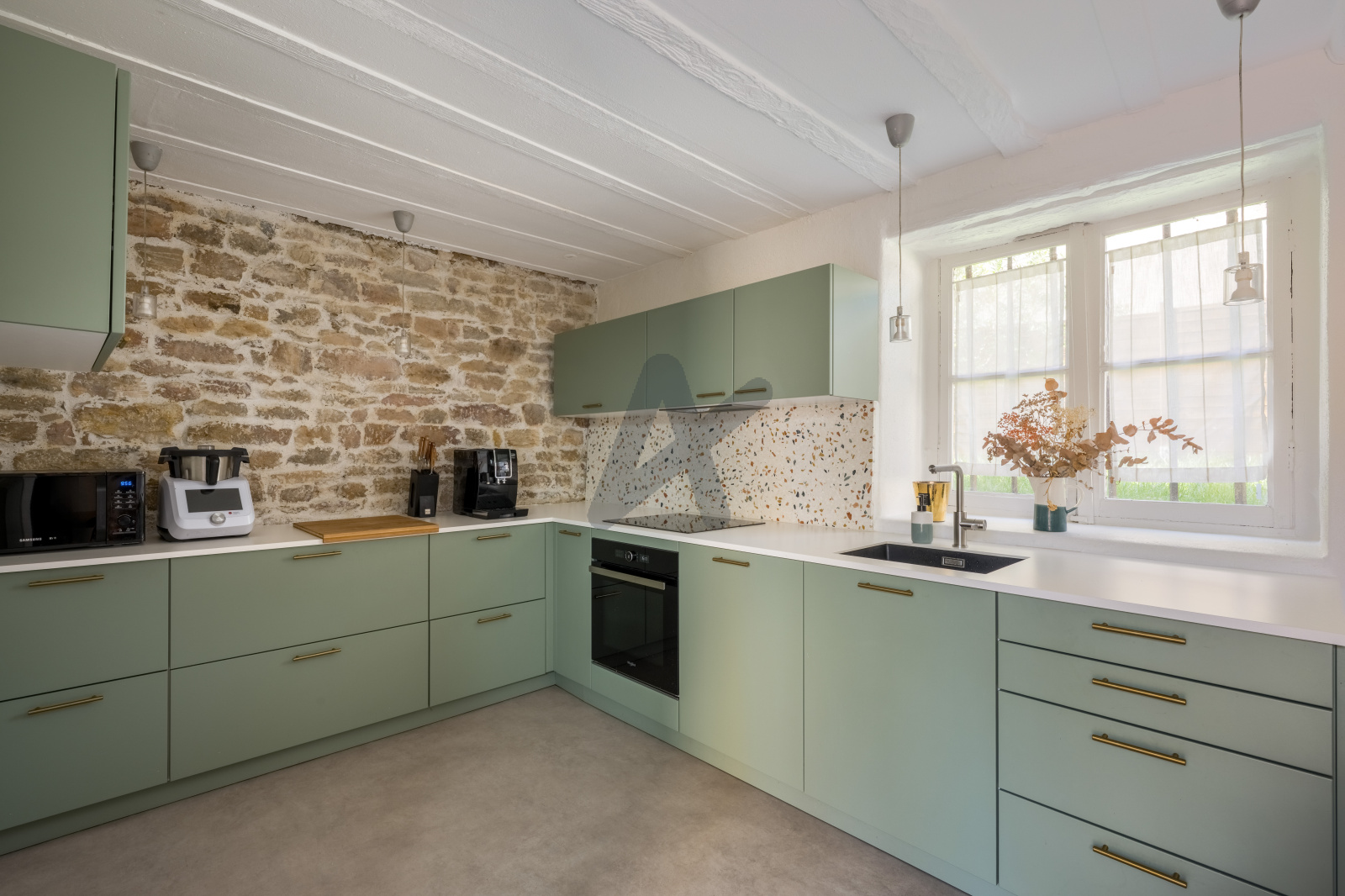 Le rez-de-chaussée dessert une entrée et une cuisine équipée qui communique avec la salle à manger. Le salon, possède de très beaux éléments anciens dont le sol et la cheminée qui en font une pièce vraiment agréable. Une buanderie avec espace cellier complète ce niveau.