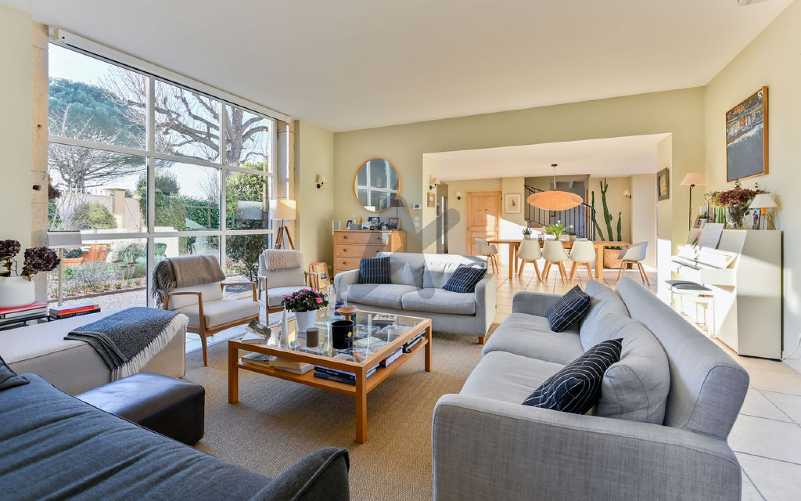 Chasselay - Maison de famille en pierres dorées exposée est-ouest du XIXème siècle mise en valeur par une rénovation contemporaine et un jardin paysager.