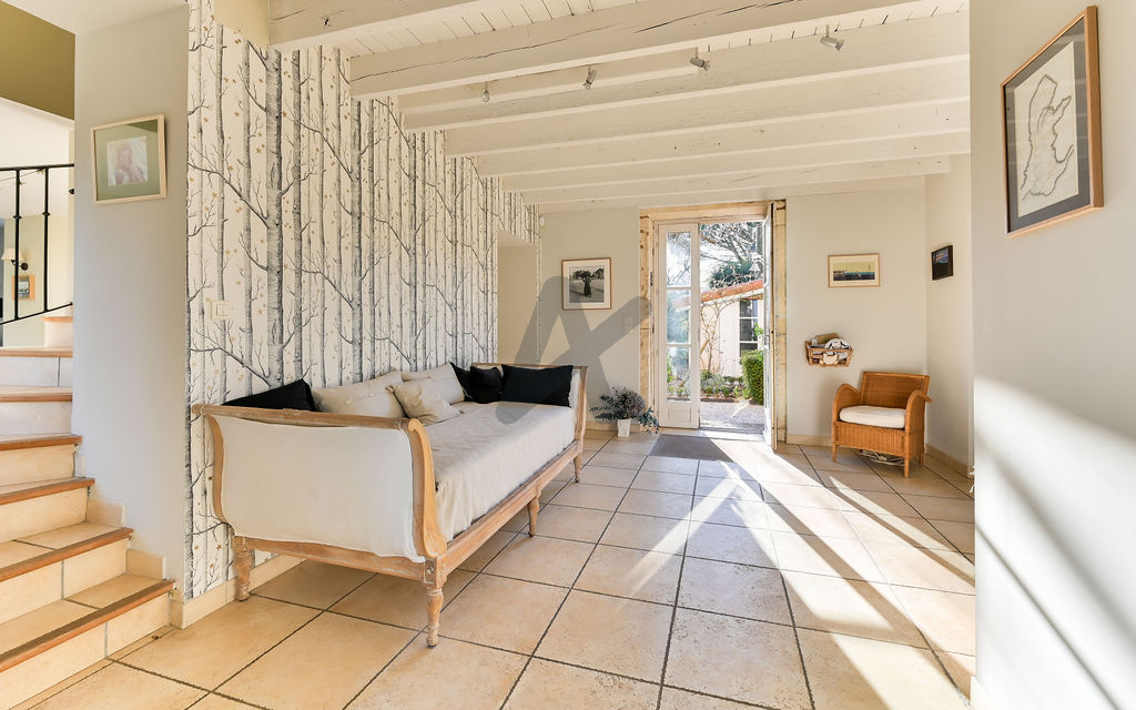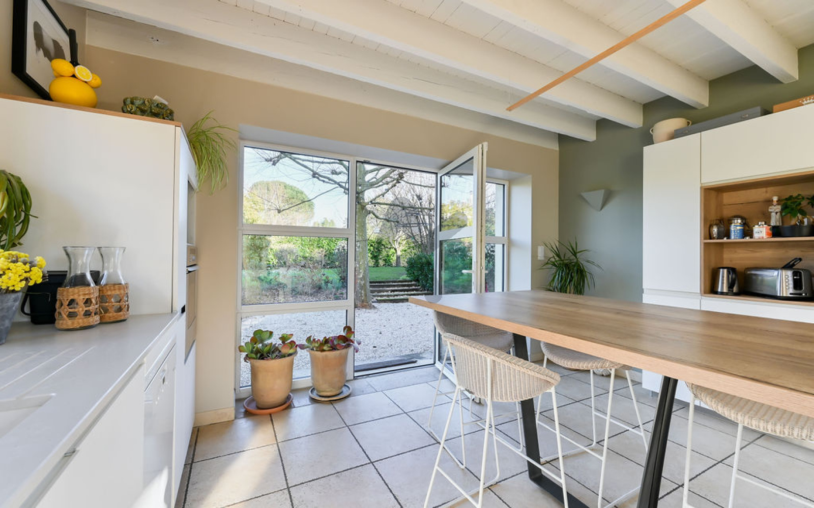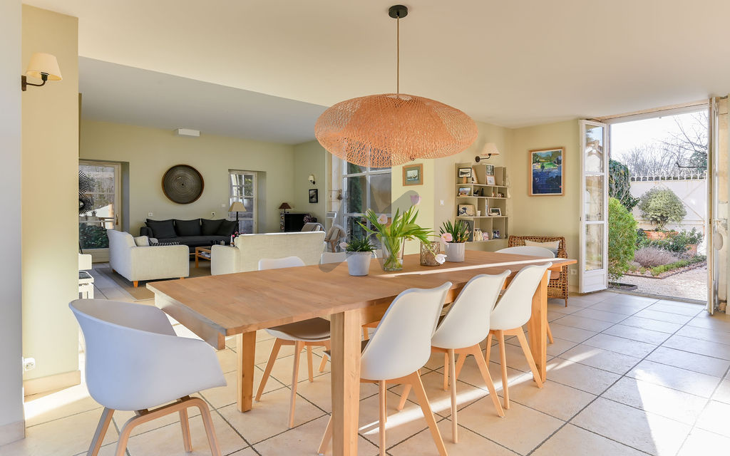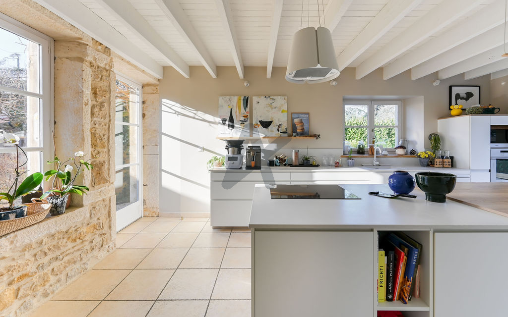 À l’intérieur, la rénovation mêle subtilement pierres apparentes, volumes généreux et baies vitrées, offrant une très belle luminosité et une sensation d’espace. Le rez de chaussé se compose d'une vaste entrée avec rangements, d'une cuisine familiale contemporaine, ouverte sur la terrasse et le jardin et d'un séjour-salle à manger chaleureux, baigné de lumière.