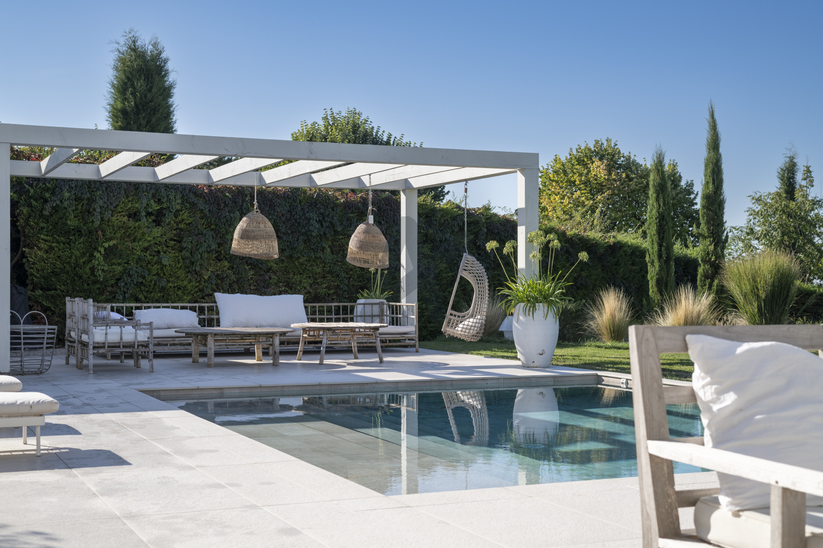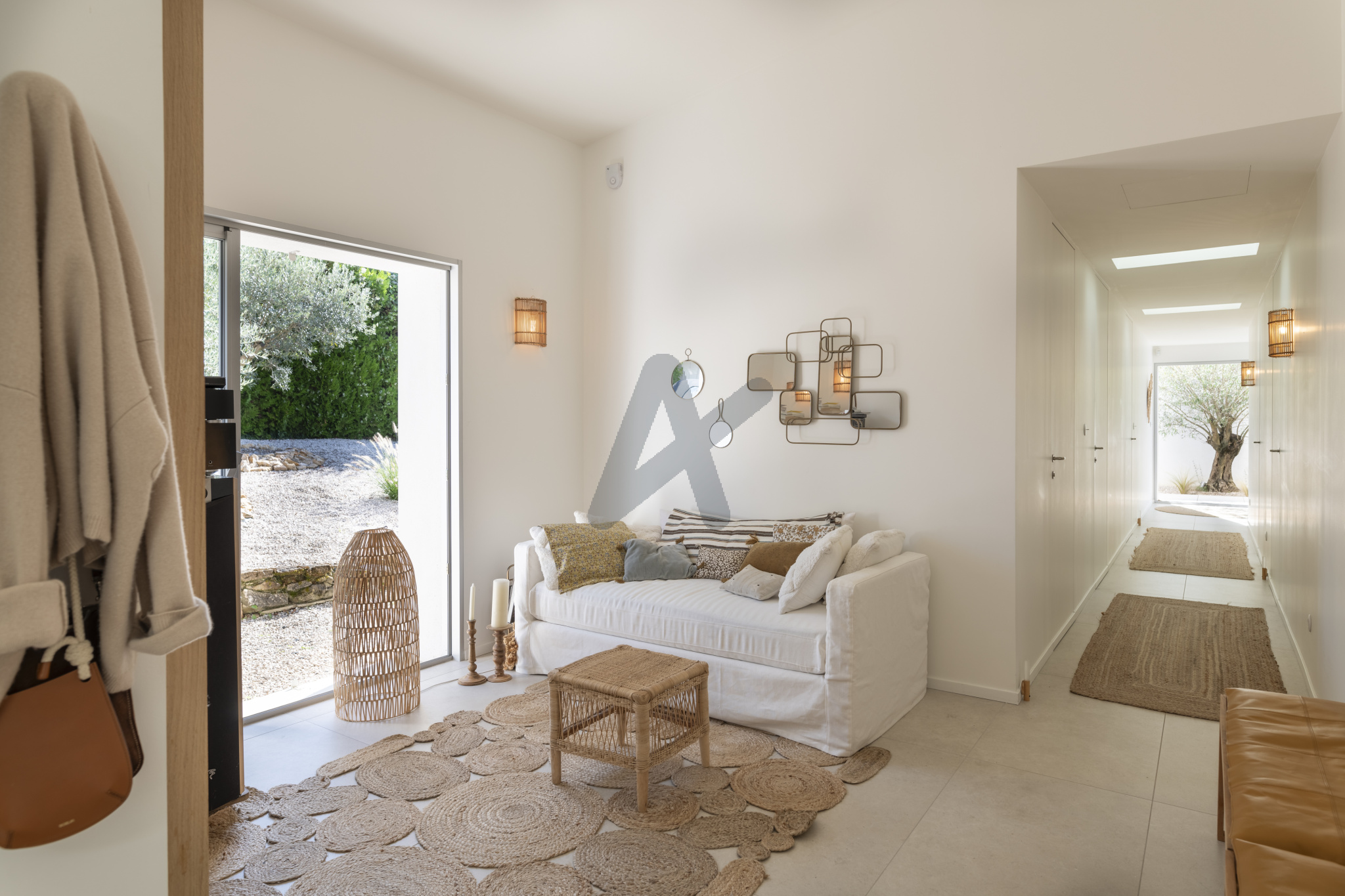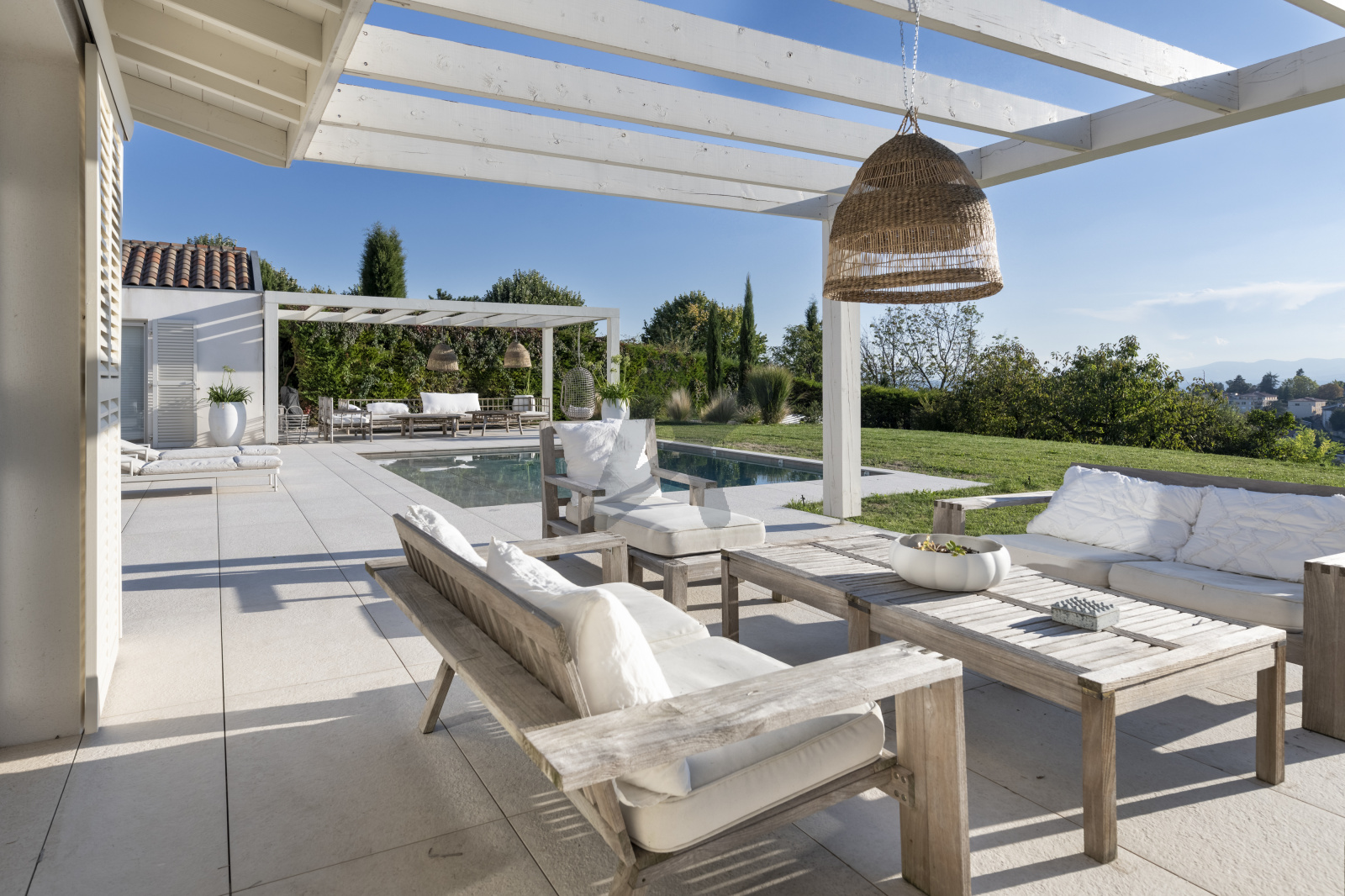 Le jardin clos et sans aucun vis à vis, avec une très belle vue dégagée, est paysager et très facile d'entretien avec sa végétation méditerannéene et son arrosage automatique. La piscine est au sel, chauffée et sécurisée.