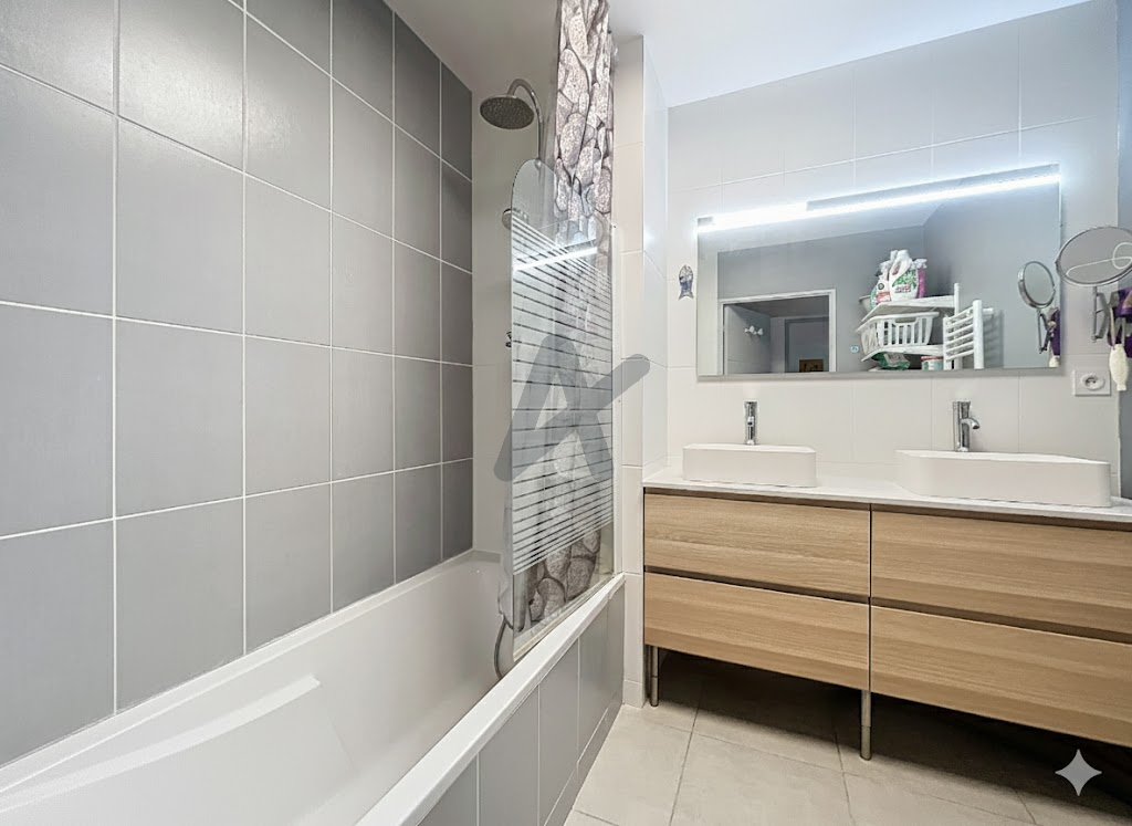 L’entrée comprend un grand placard de rangement. La partie nuit se compose de trois chambres dont deux disposent d’un placard mural, d’un toilette séparé et d’une belle salle de bains avec double vasque et un espace prévu pour la machine à laver.