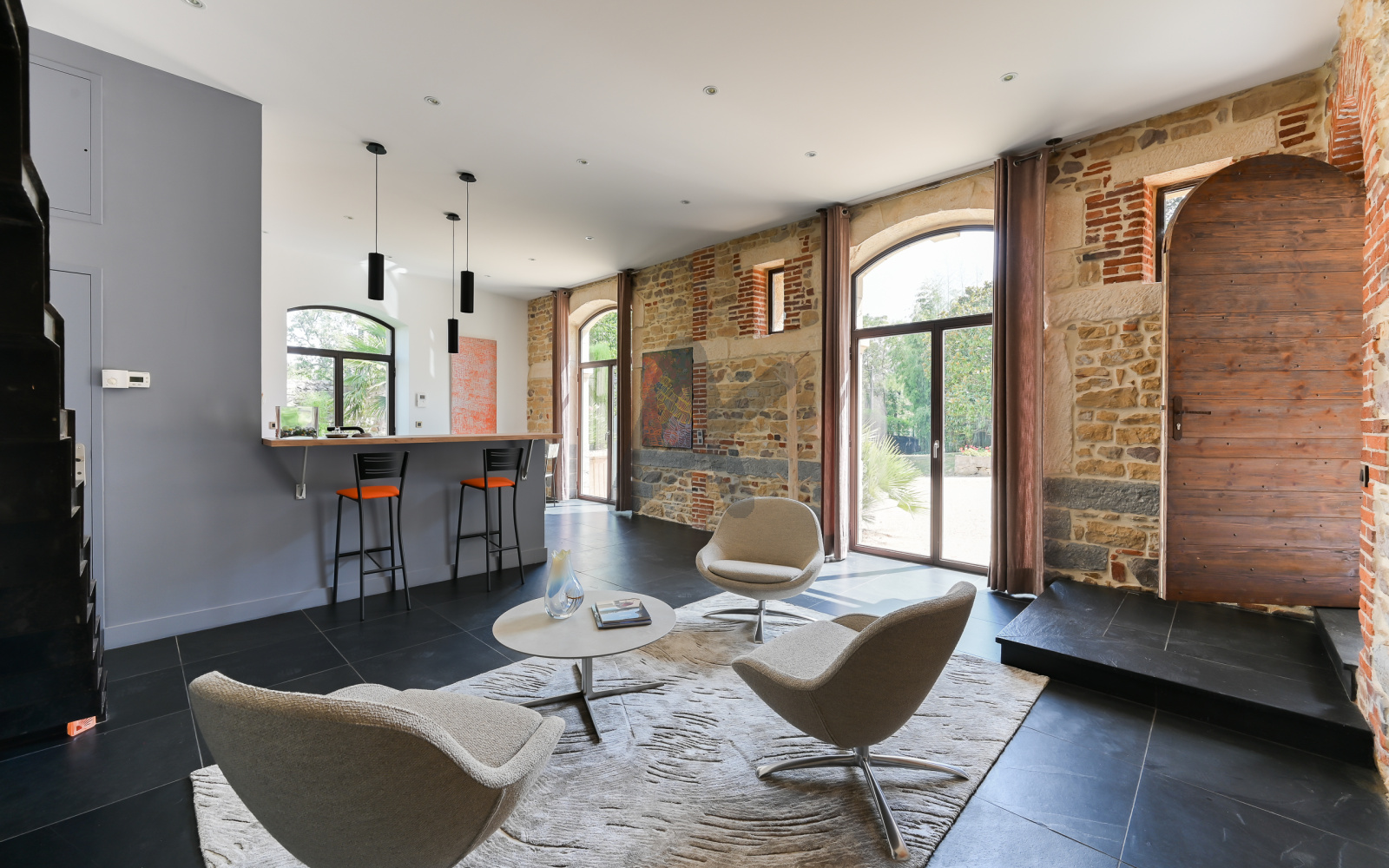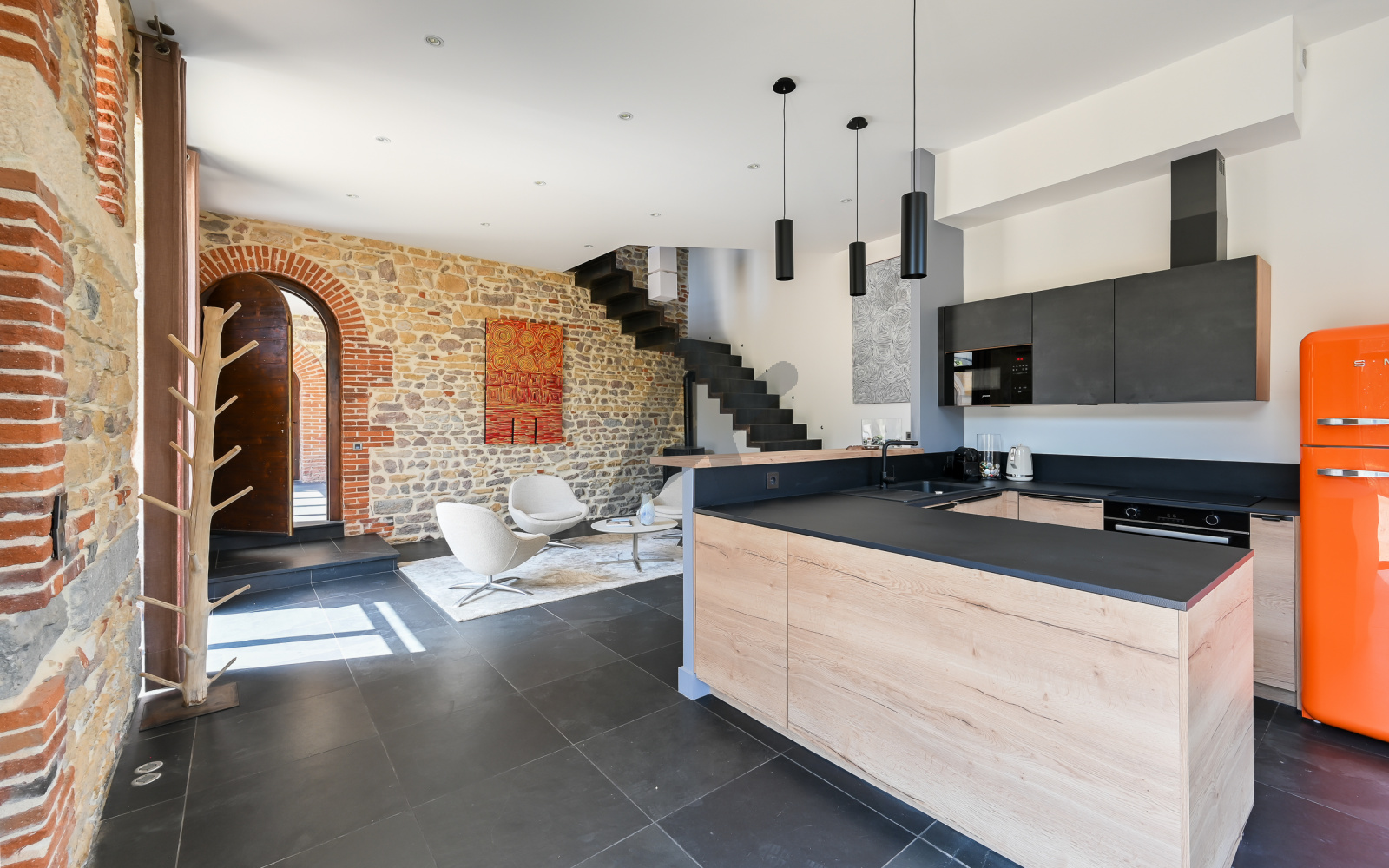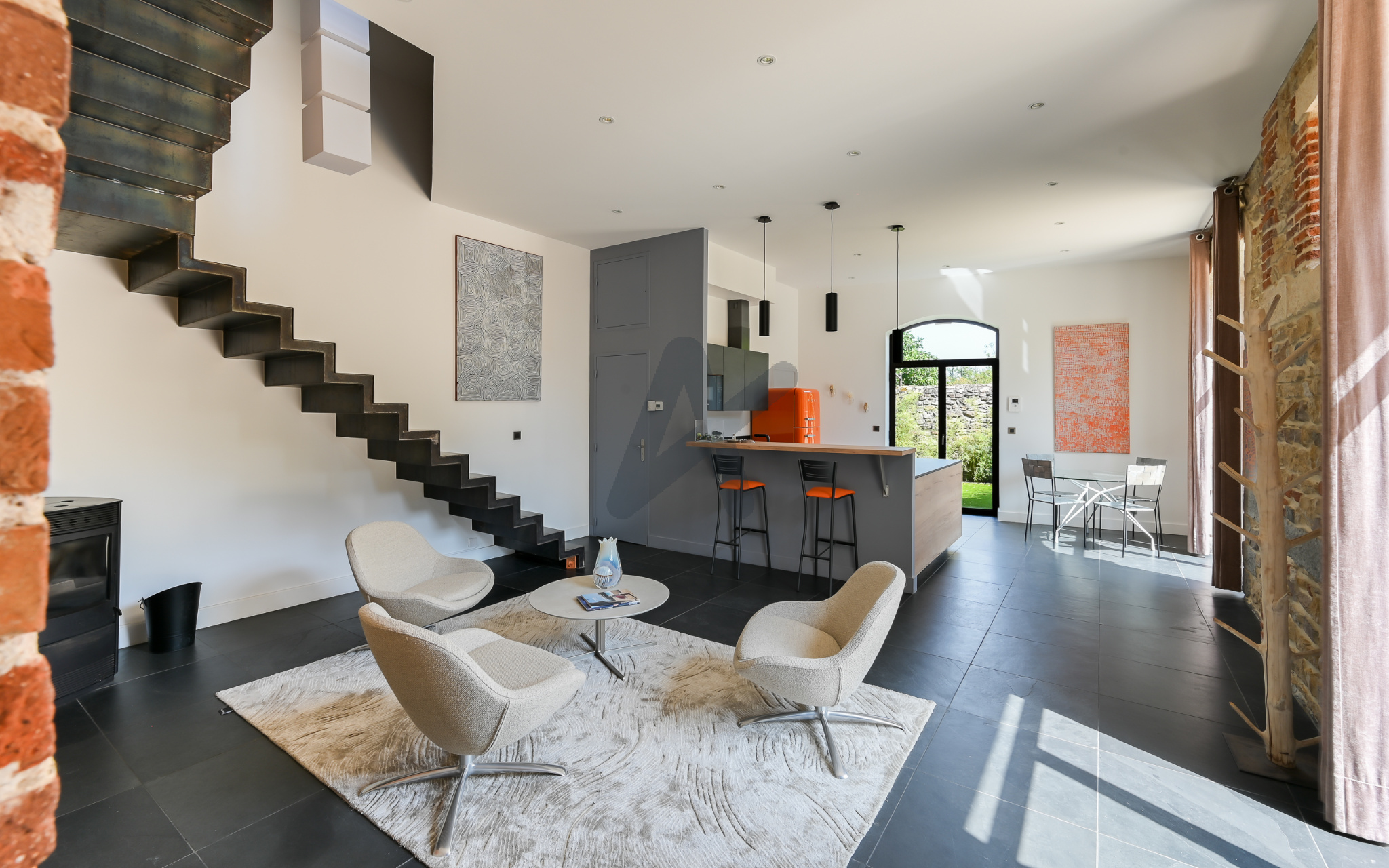 Les anciennes écuries, entièrement réhabilitées en maison indépendante de 120 m², proposent une entrée, une pièce de vie avec cuisine ouverte, deux chambres à l’étage et une salle d’eau. Un garage complète cet ensemble.