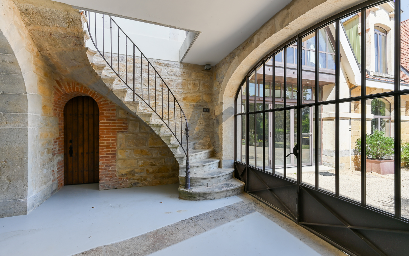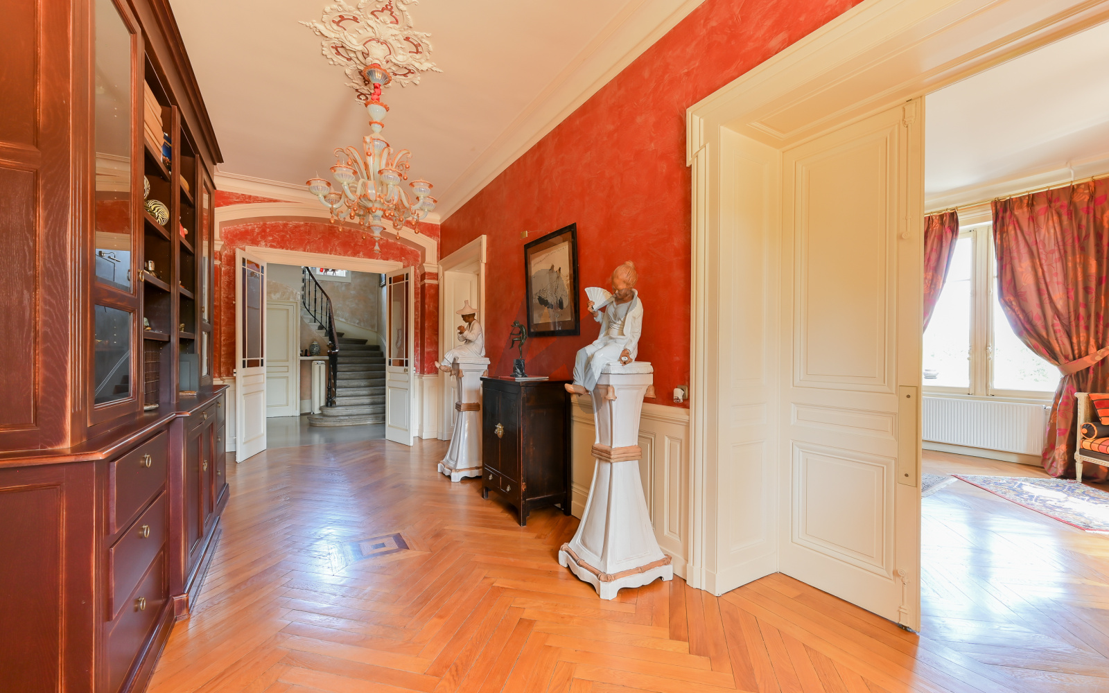 La demeure principale, une authentique maison de maître de 463 m², offre des volumes remarquables et une distribution classique, pensée pour la vie familiale comme pour la réception. Dès l’entrée, les espaces de vie s’enchaînent avec fluidité : salon, salle à manger, cuisine, bureau, buanderie, ainsi qu’une chambre avec salle de bains en rez-de-chaussée.
