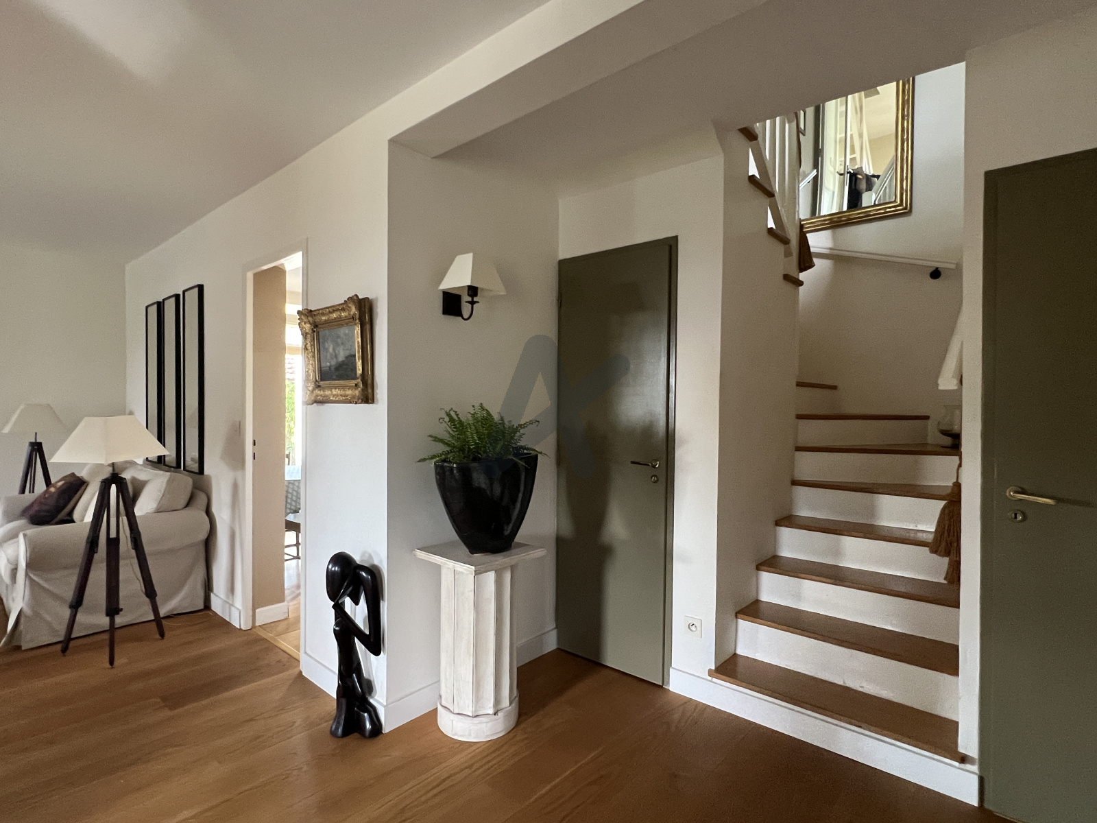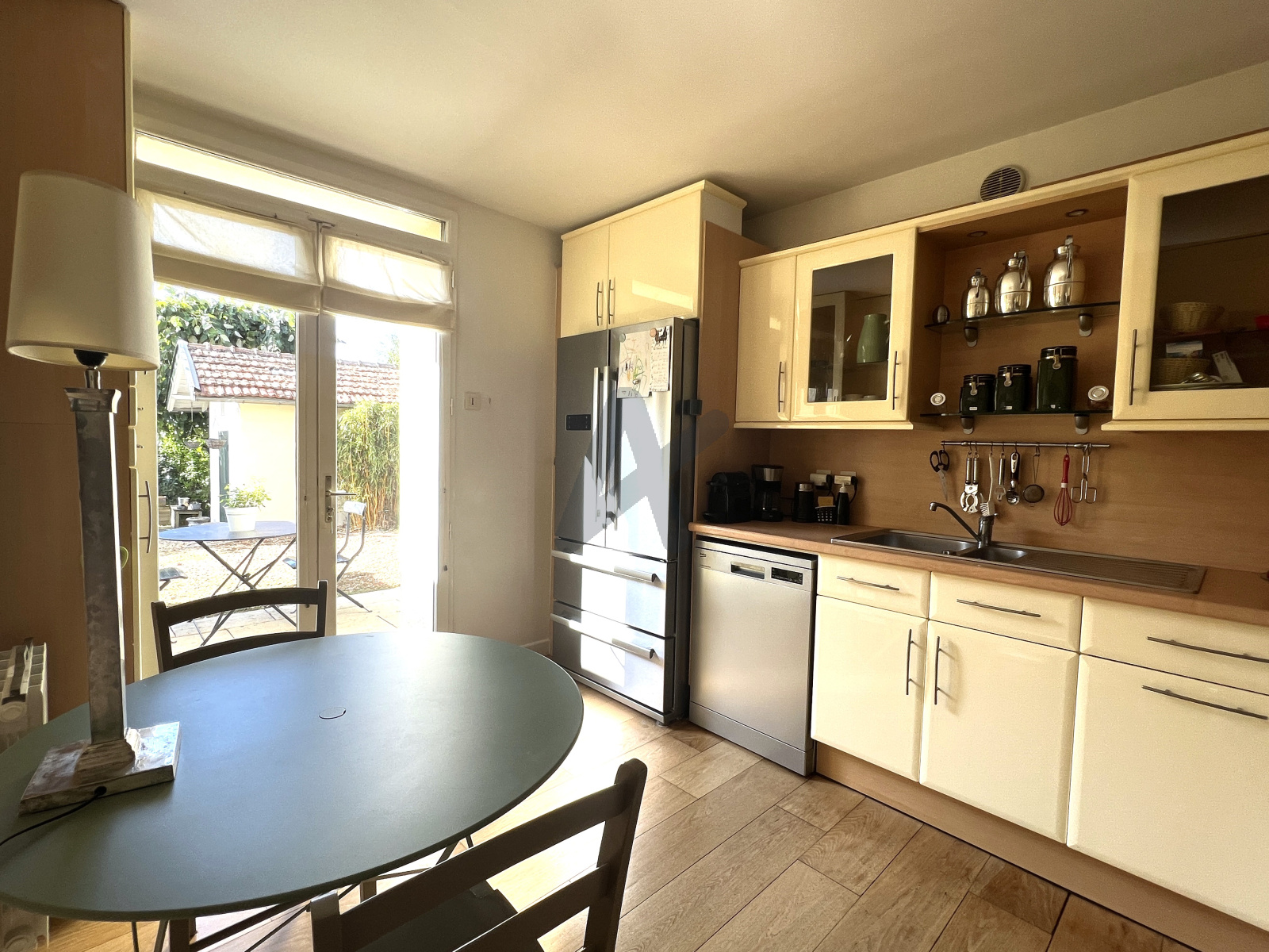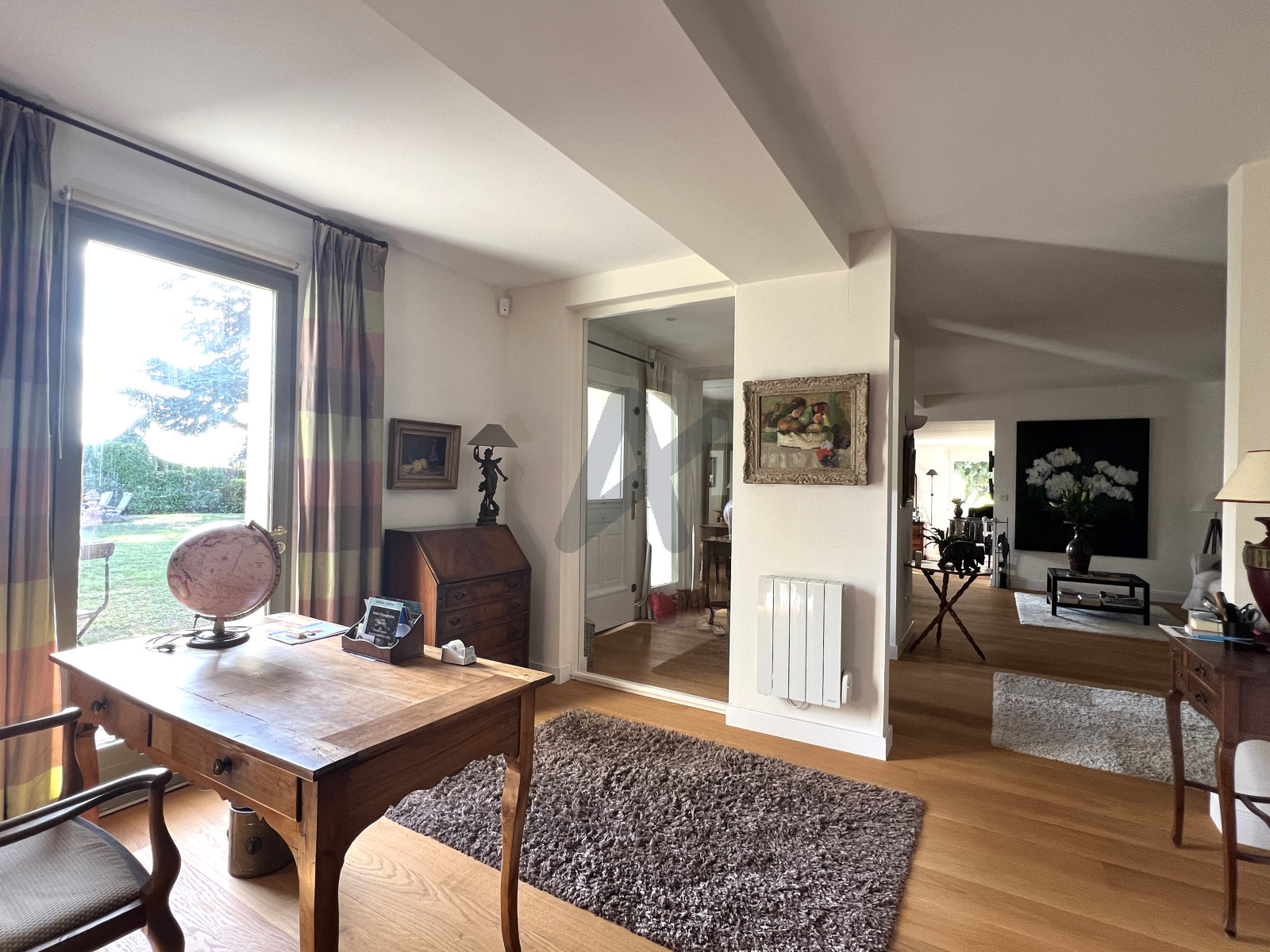 SOUS COMPROMIS Cour de coeur pour cette maison de charme , au CALME, sur son beau terrain plat et arboré de 1643 m2 . SANS VIS-A-VIS, exposée SUD et OUEST, la maison se compose d'une entrée,vestiaires, une grande piece de vie lumineuse avec salon , salle à manger ,un bureau bibliotheque, une cuisine , le tout ouvert directement sur le jardin et la terrasse . A l'étage , une suite parents avec dressing, salle de bains et balcon, 2 chambres , une salle de bains et toilettes . Combles aménagées pour une chambre supplémentaire .