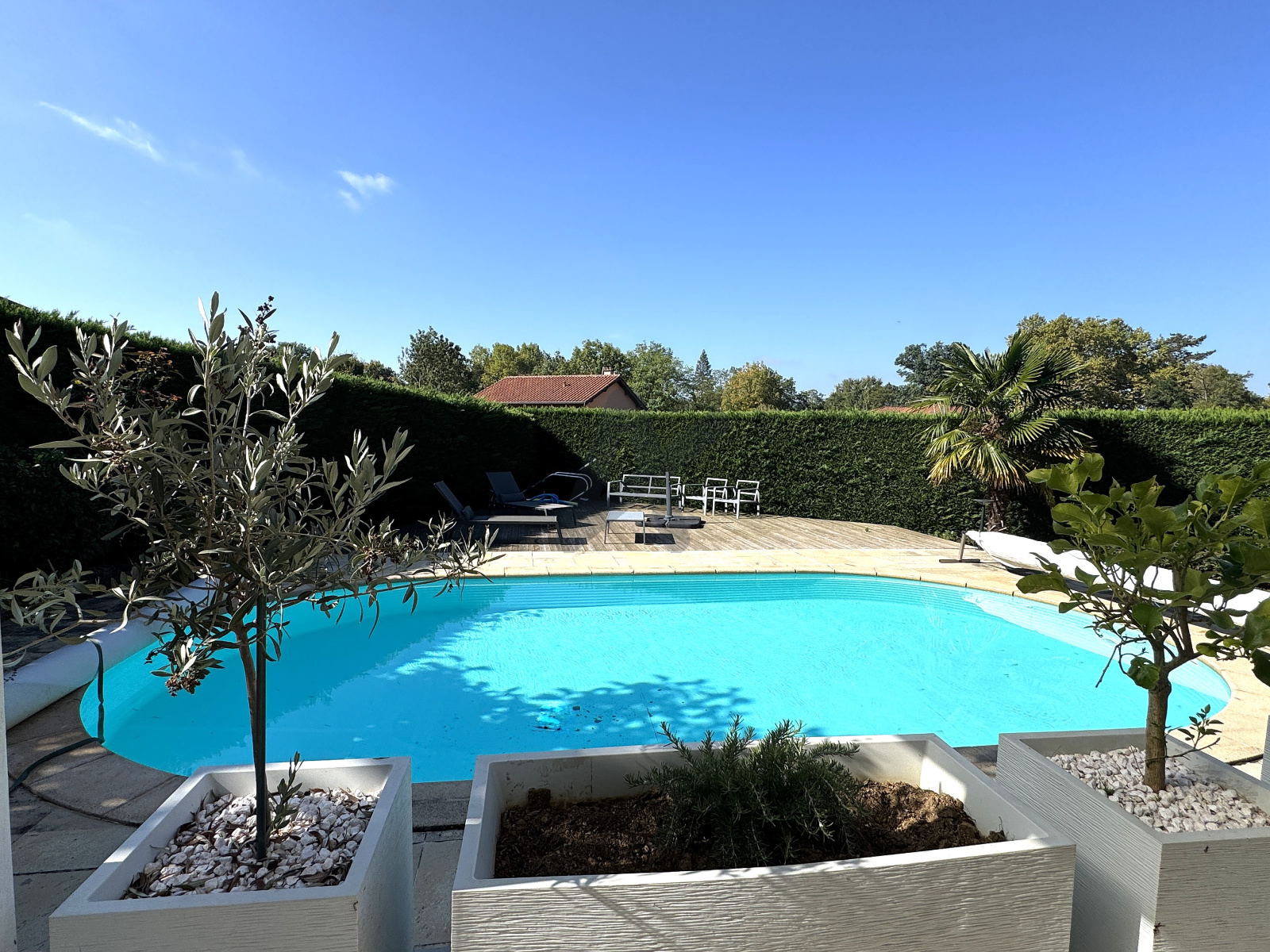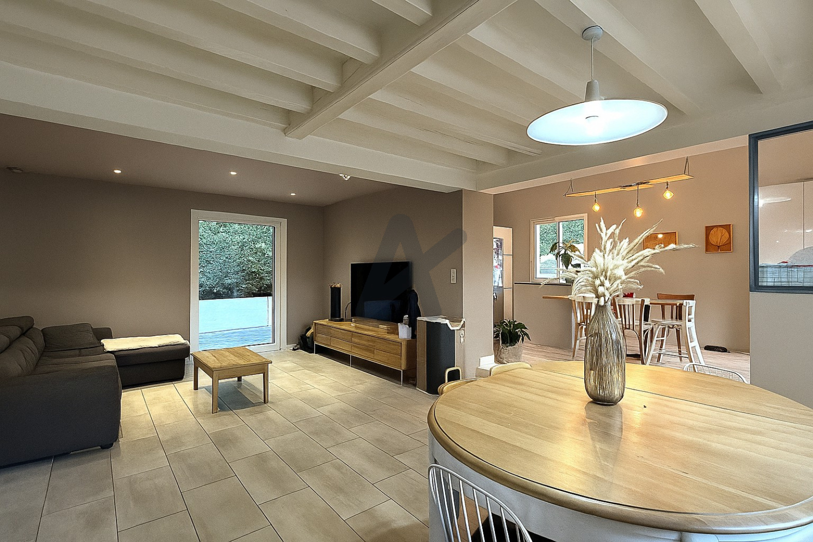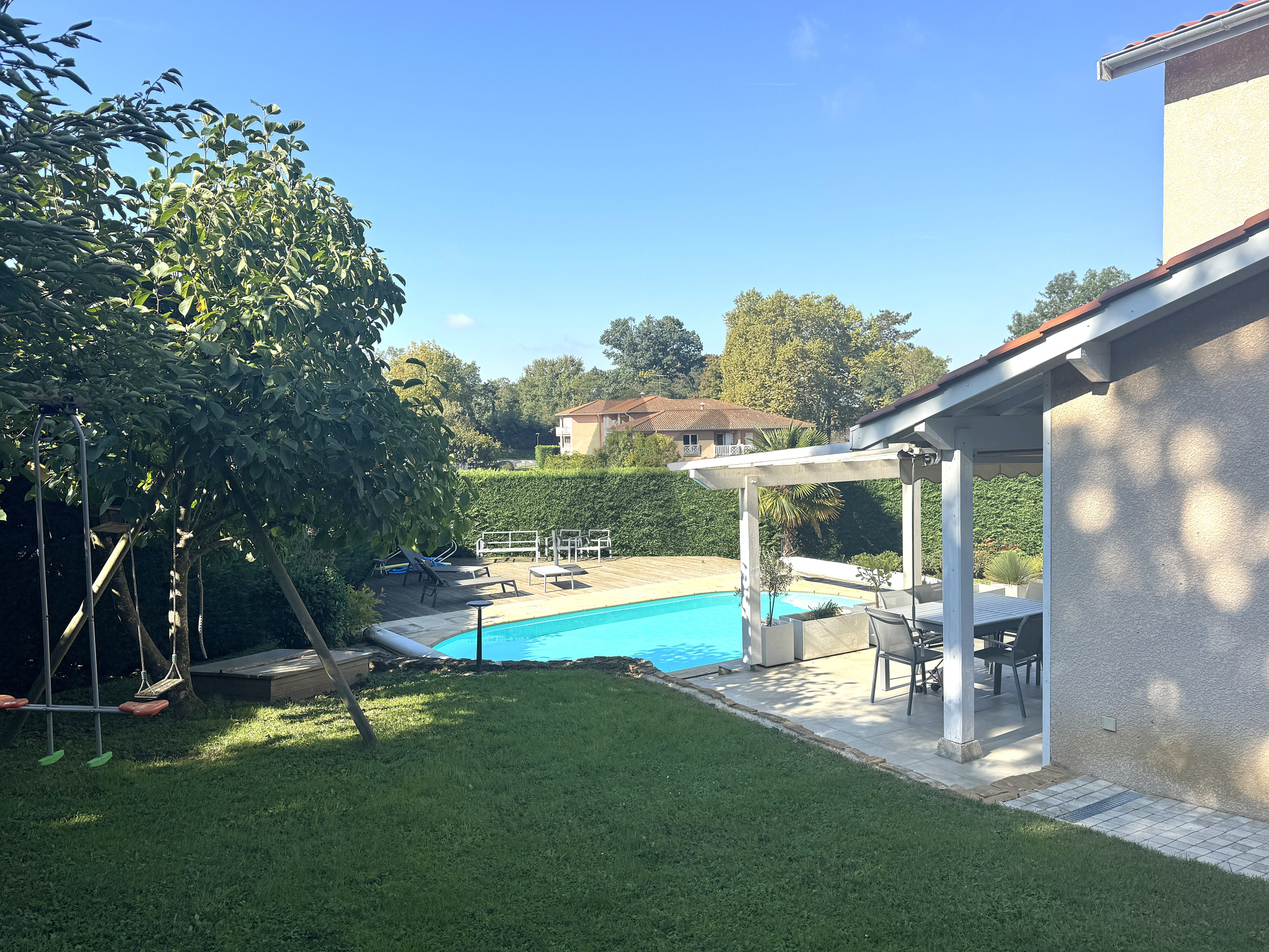 Le rez-de-chaussée accueille une vaste pièce de vie lumineuse d’environ 50 m², comprenant une cuisine ouverte et conviviale donnant sur la terrasse et le jardin. L’extérieur invite à la détente avec sa piscine chauffée par pompe à chaleur. Une salle de jeux ou salle TV, pouvant être aménagée en chambre supplémentaire, complète ce niveau.