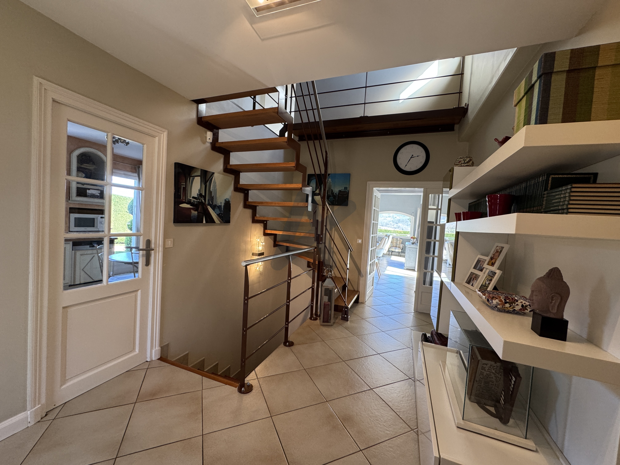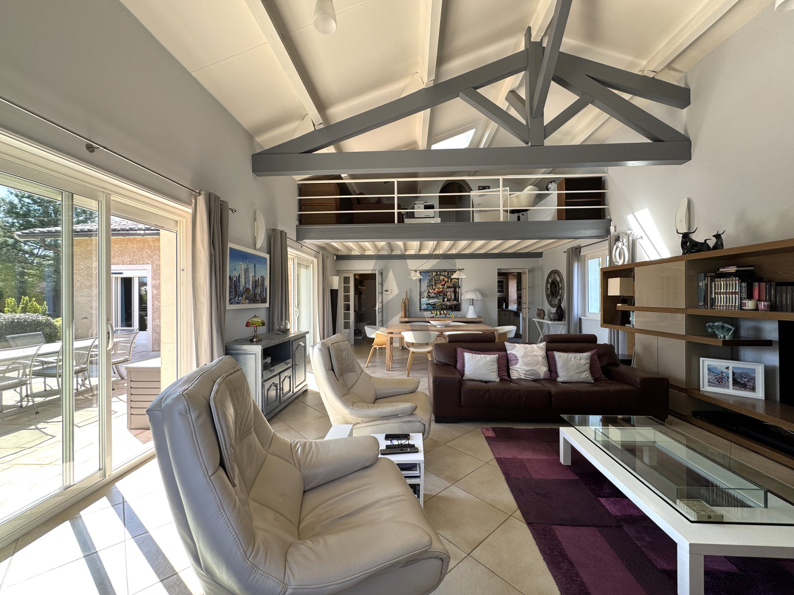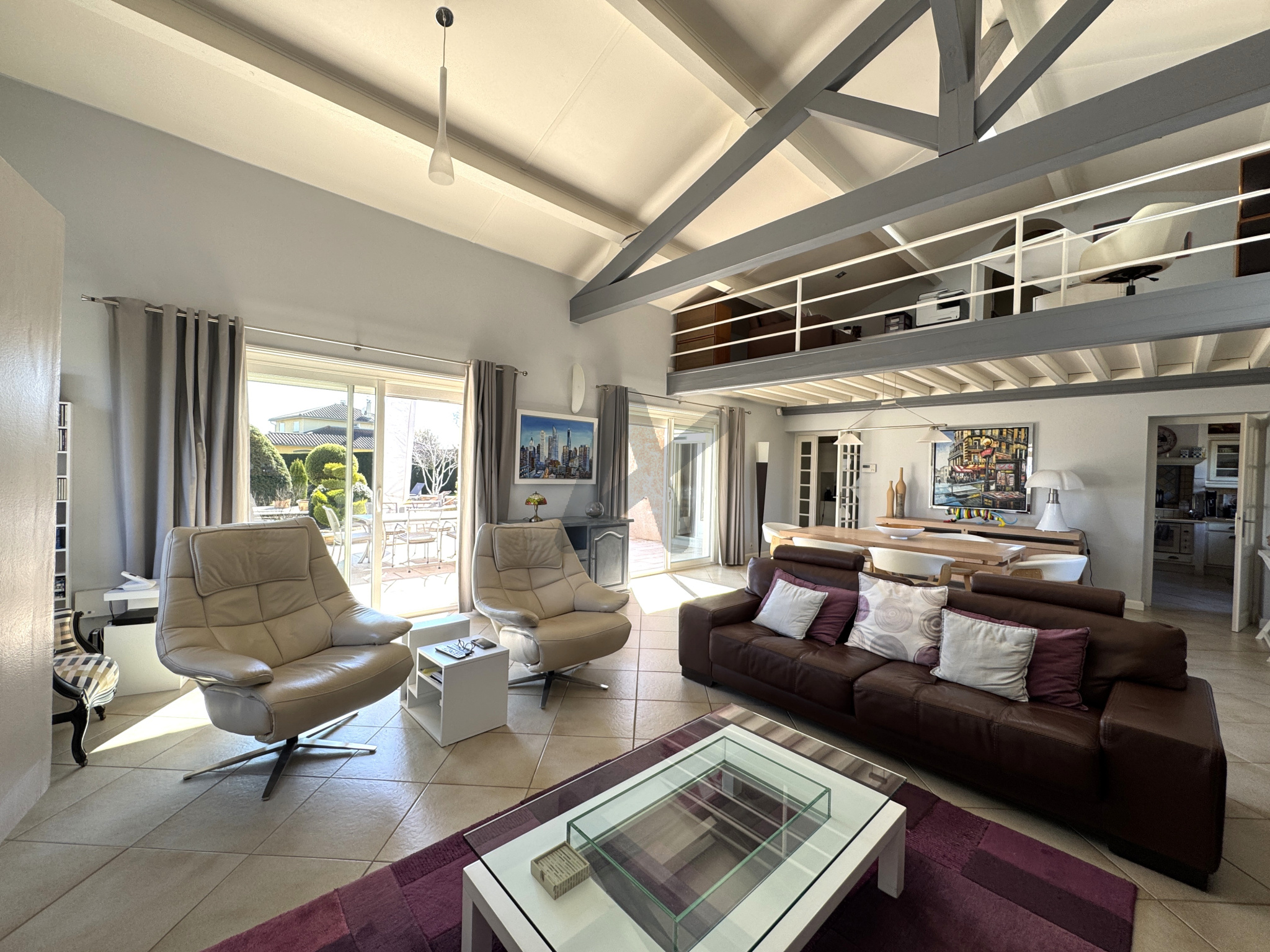Elle se compose d’une entrée, d’une vaste pièce de vie tres lumineuse d’environ 50 m² largement ouverte sur le jardin, la terrasse et la piscine,une grande mezzanine, une cuisine, une buanderie, trois chambres, une grande salle de bains et des toilettes.