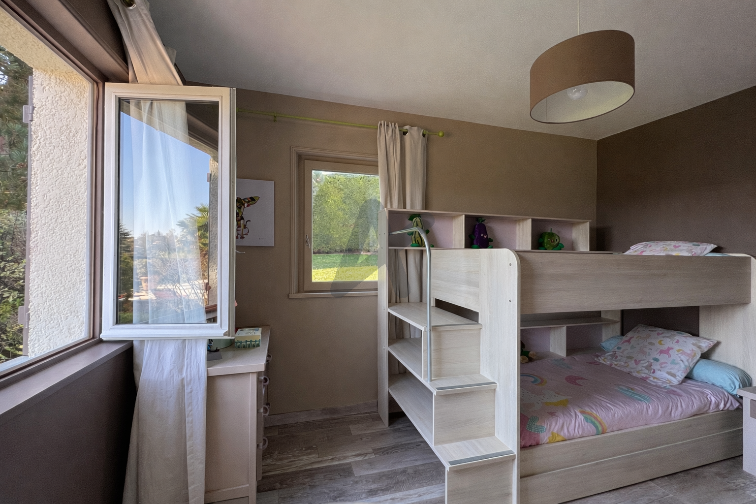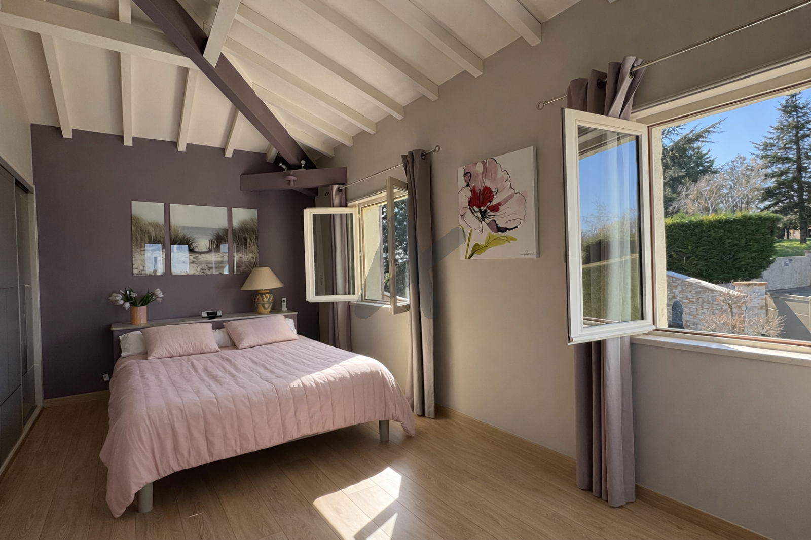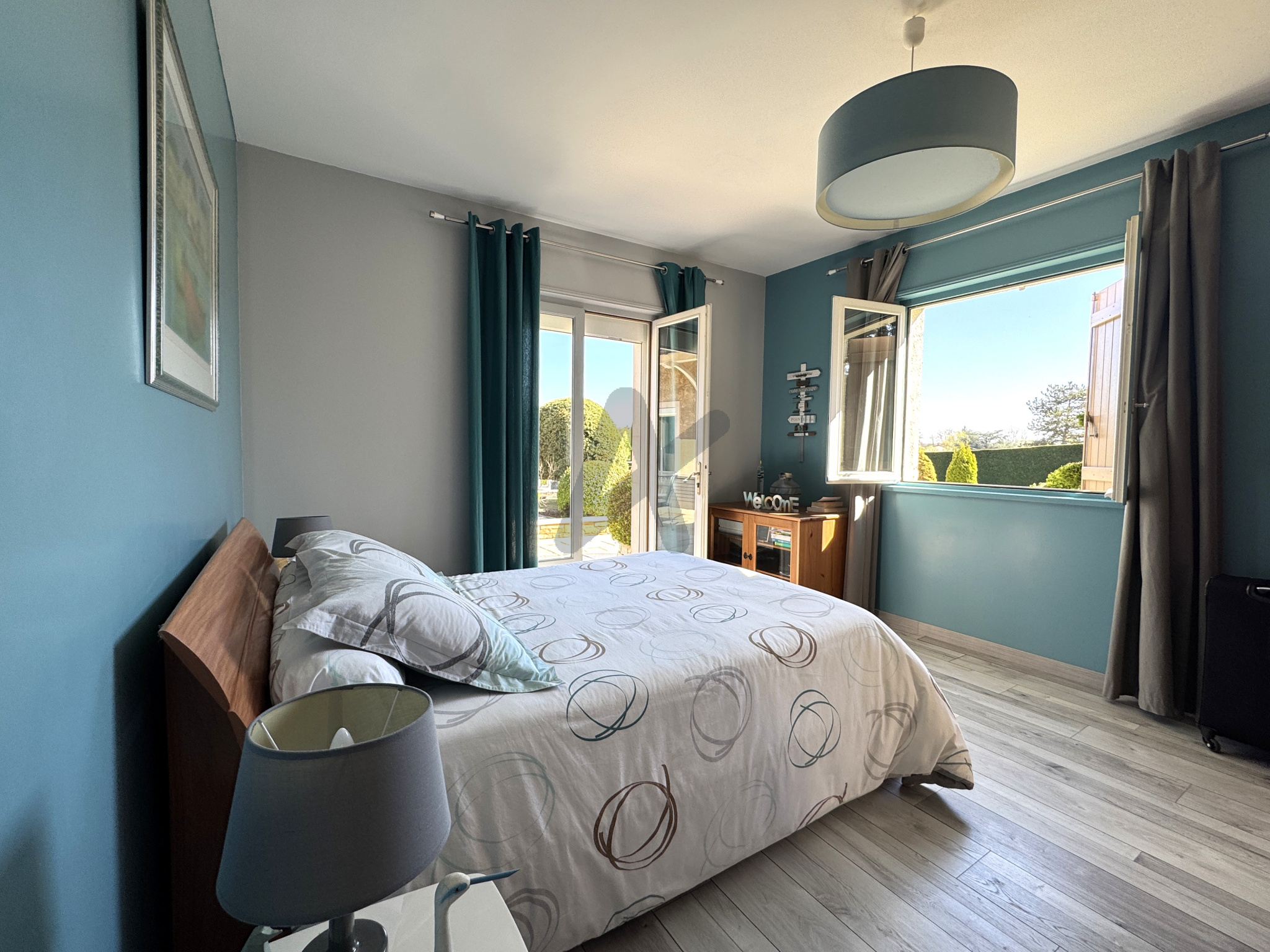 À l’étage, une suite parentale spacieuse avec salle de bains et vue dégagée sur la nature.
