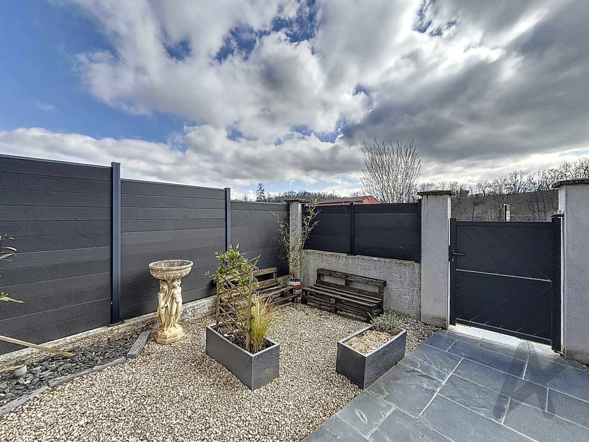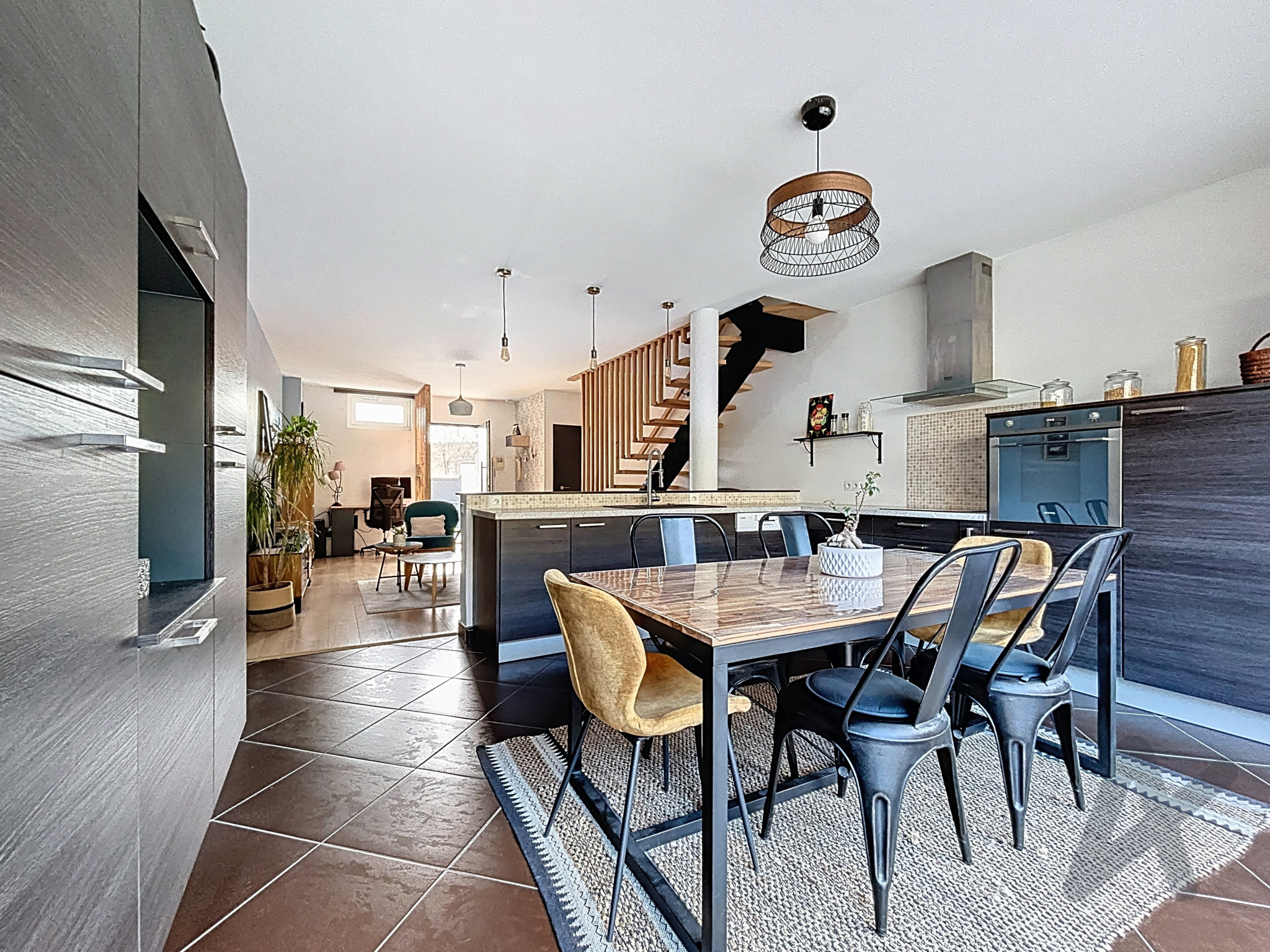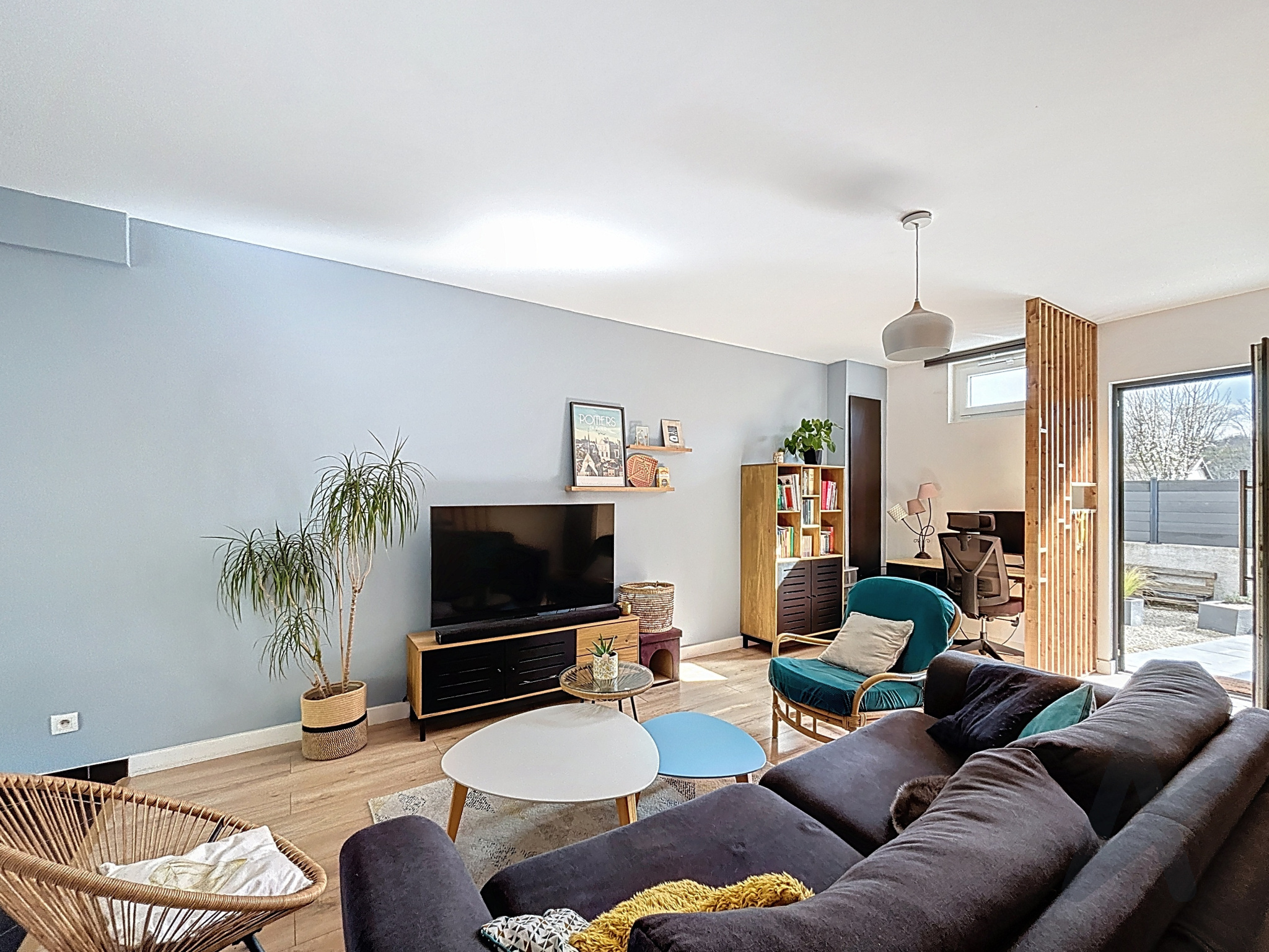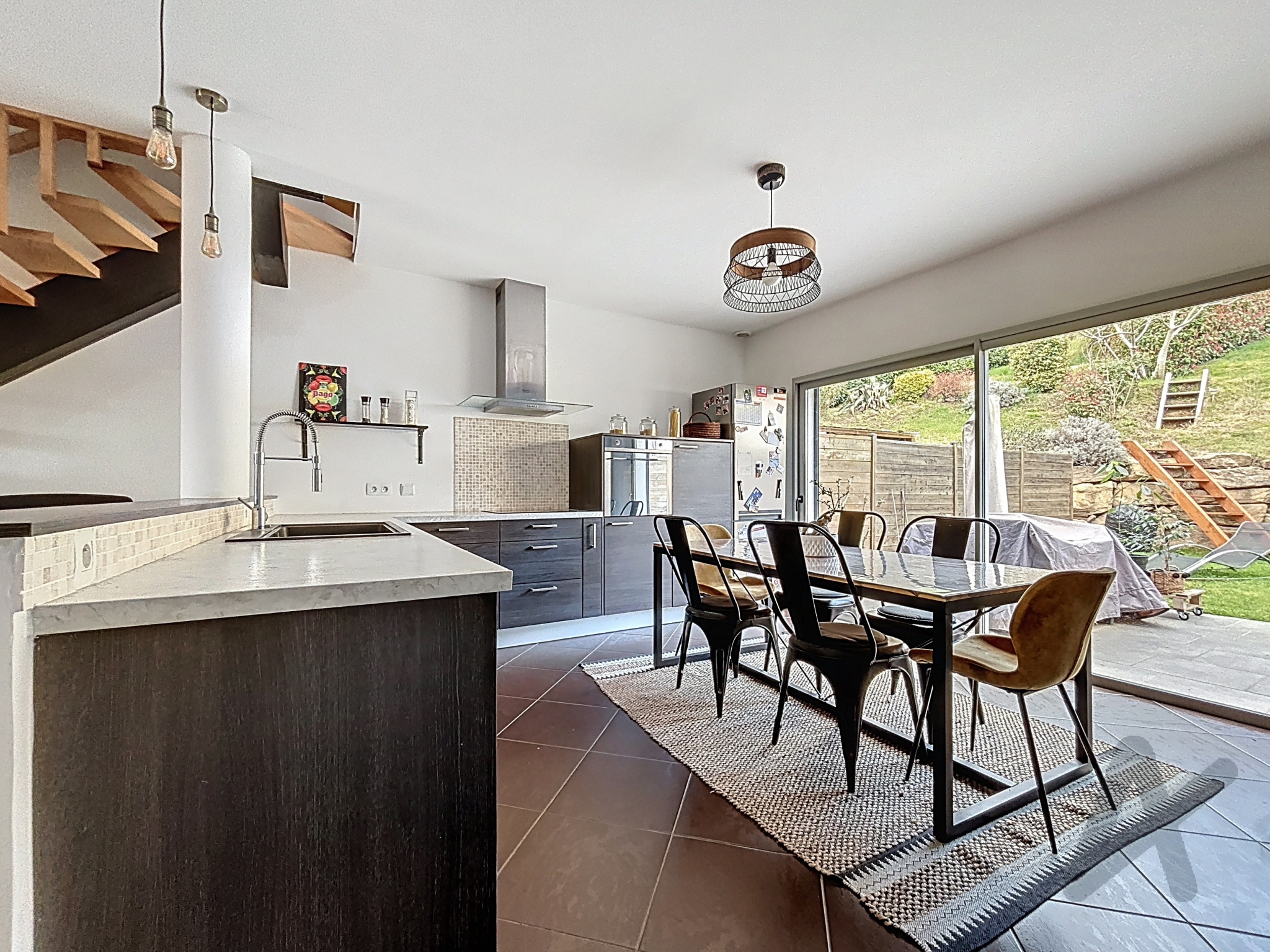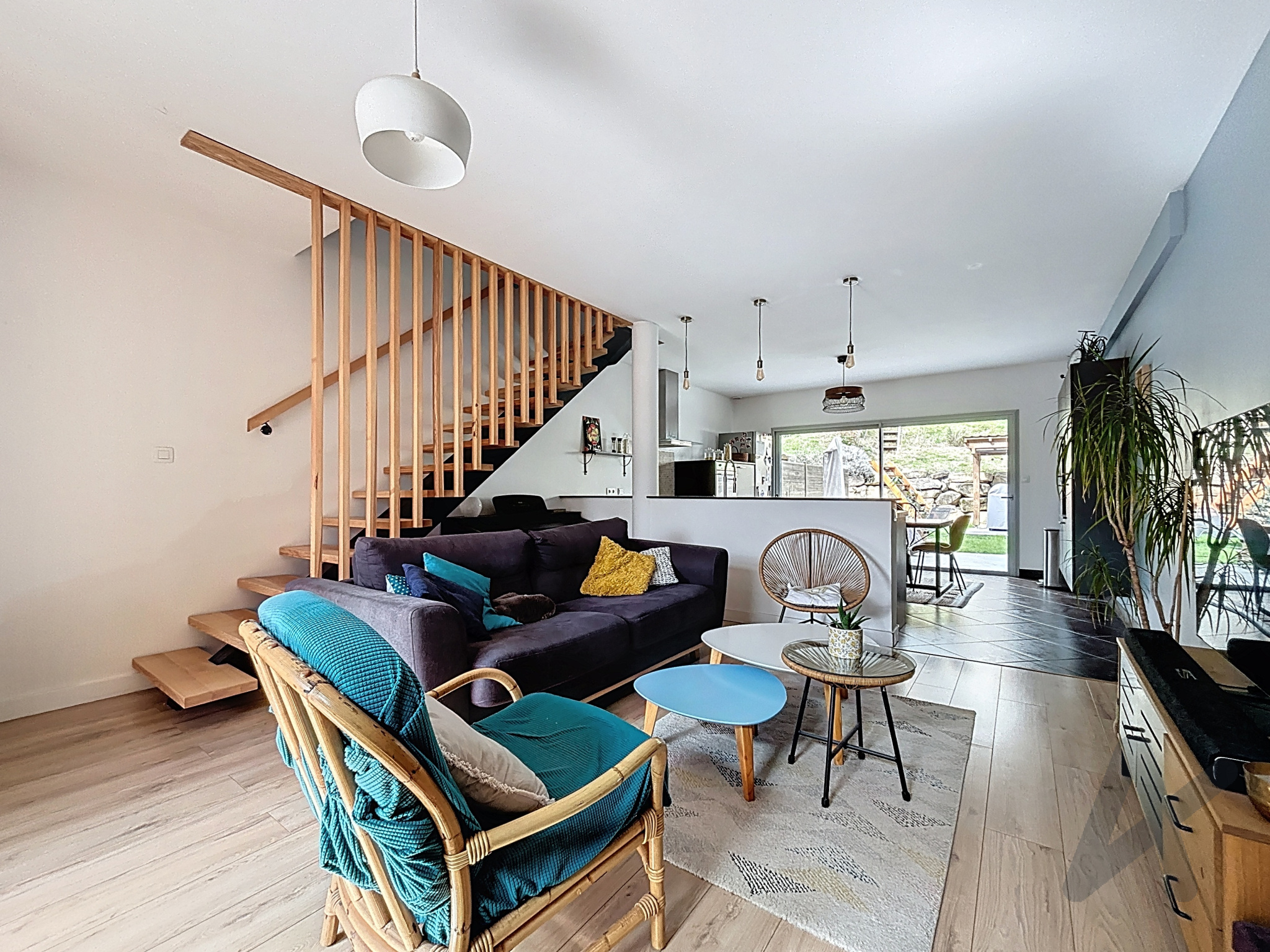 Une pièce de vie de 42 m² avec une cuisine ouverte donne accès à l'extérieur avec un jardin arboré et clôturé d'environ 150 m2, offrant un espace agréable et sécurisé pour profiter des beaux jours.