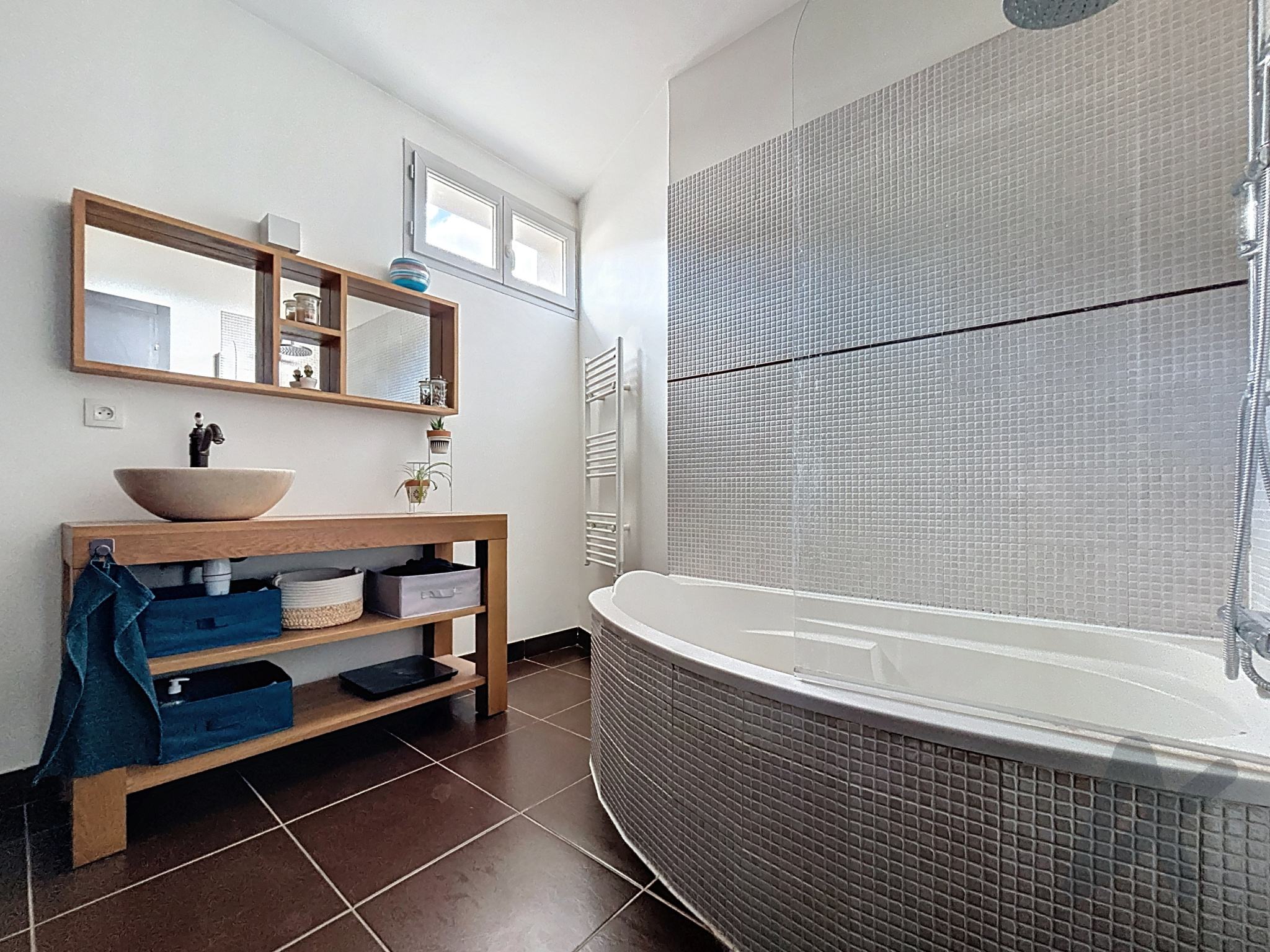 La salle de bains de 6,9 m² est équipée de rangements pour plus de praticité et les WC sont séparés.