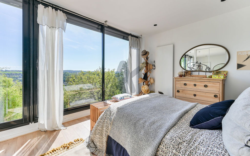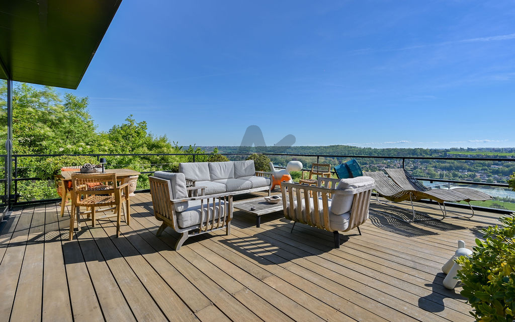Développant une surface habitable d'environ 225 m², la propriété séduit dès les premiers instants par ses volumes et sa luminosité omniprésente. Grâce à son exposition sud-est, les pièces de vie bénéficient d’une lumière naturelle tout au long de la journée et s’ouvrent harmonieusement sur des terrasses offrant une vue panoramique remarquable sur la Saône.