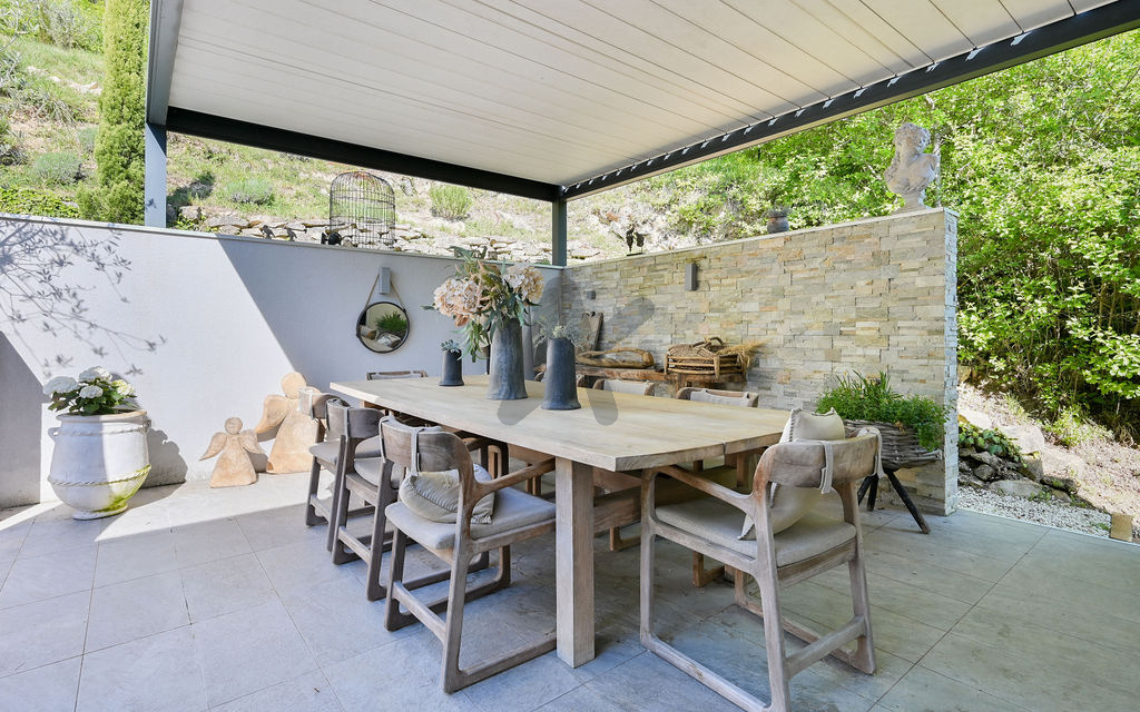 À l’extérieur, le terrain paysager de 4 674 m² constitue un véritable écrin de verdure. La piscine s’intègre parfaitement dans cet environnement calme et préservé, offrant un lieu de détente idéal à l’abri des regards. Deux terrasses permettent de profiter pleinement des différentes ambiances de la journée, tandis qu’un double garage, une cave et plusieurs stationnements extérieurs viennent compléter les prestations.