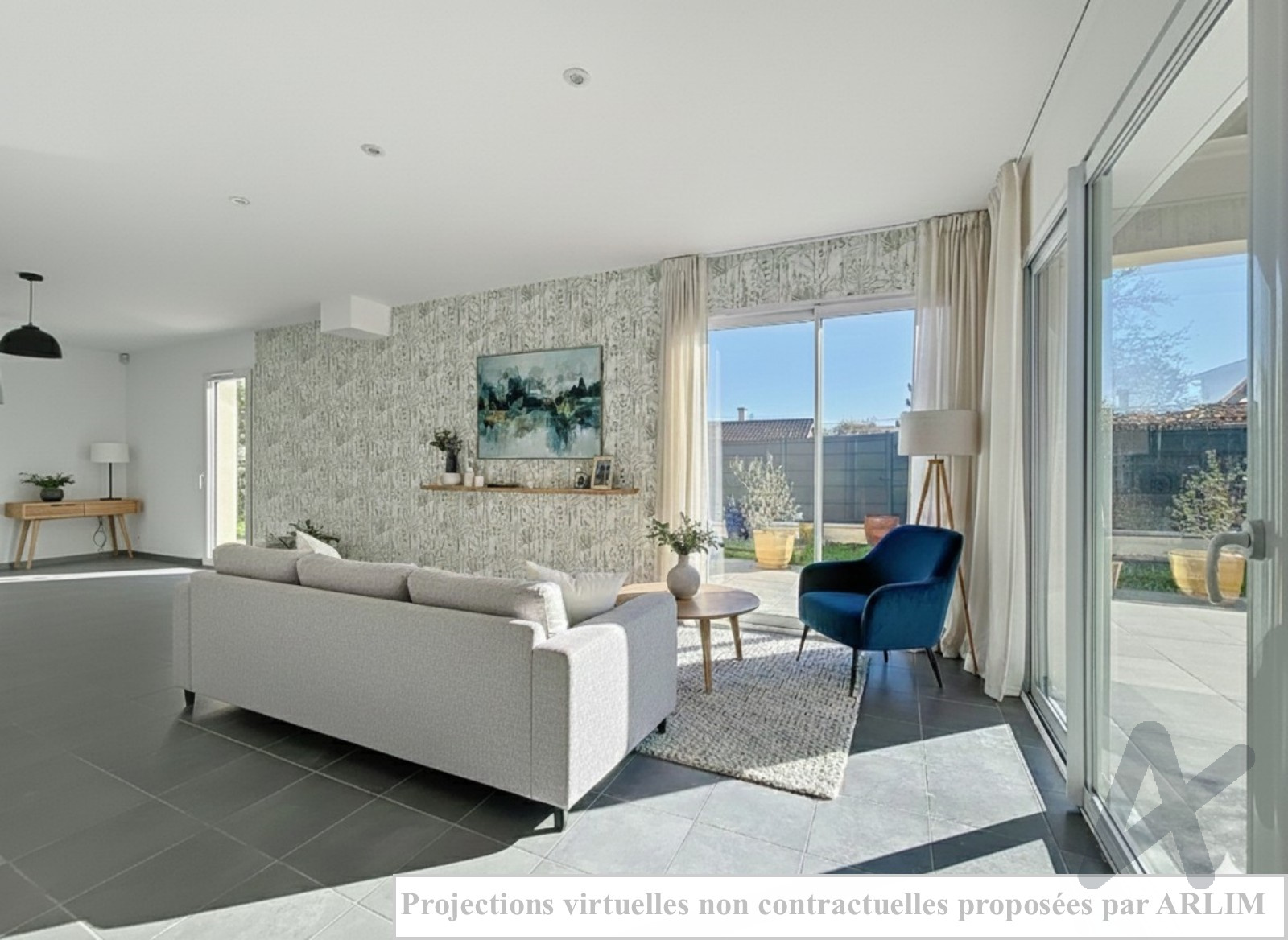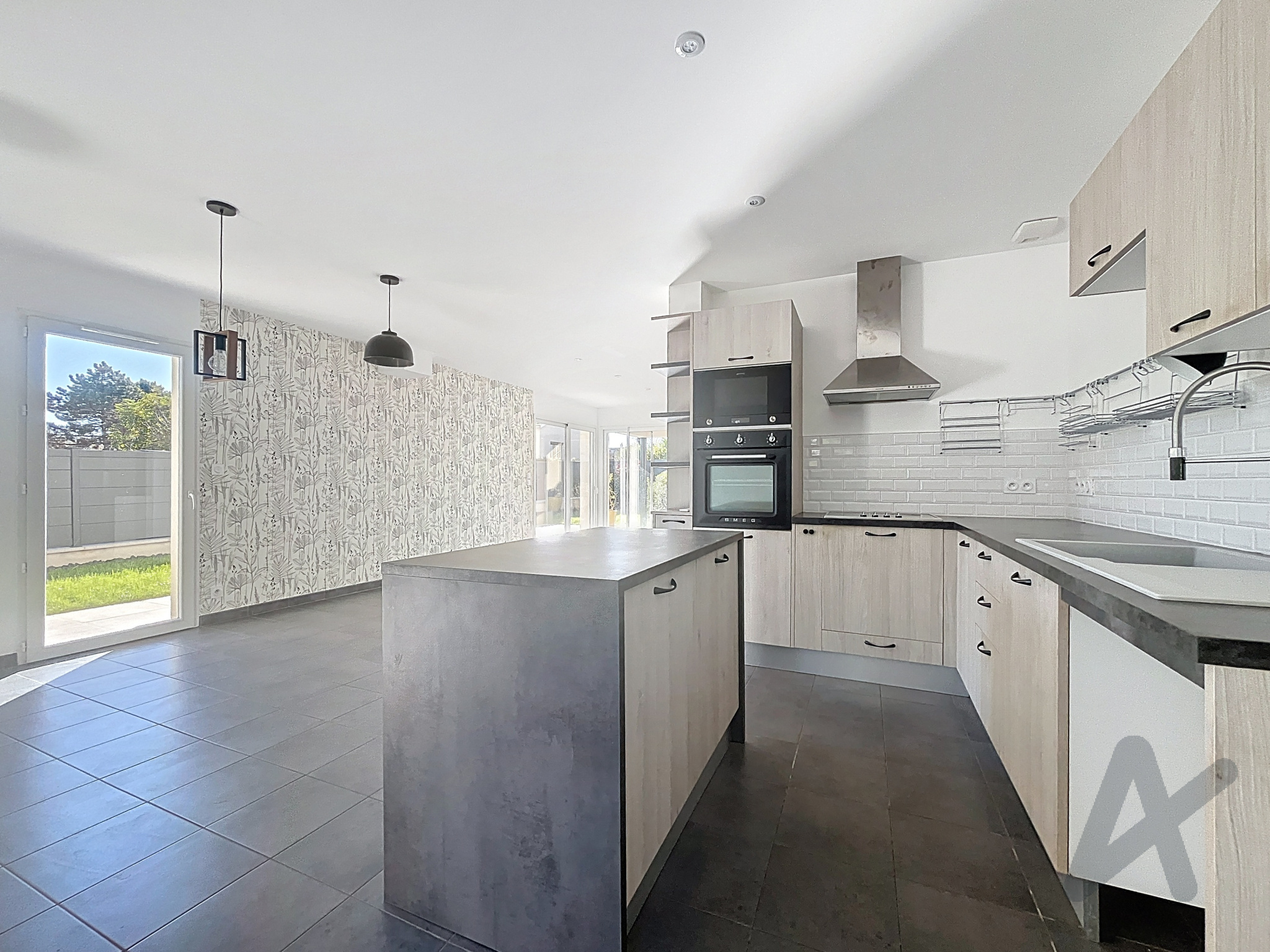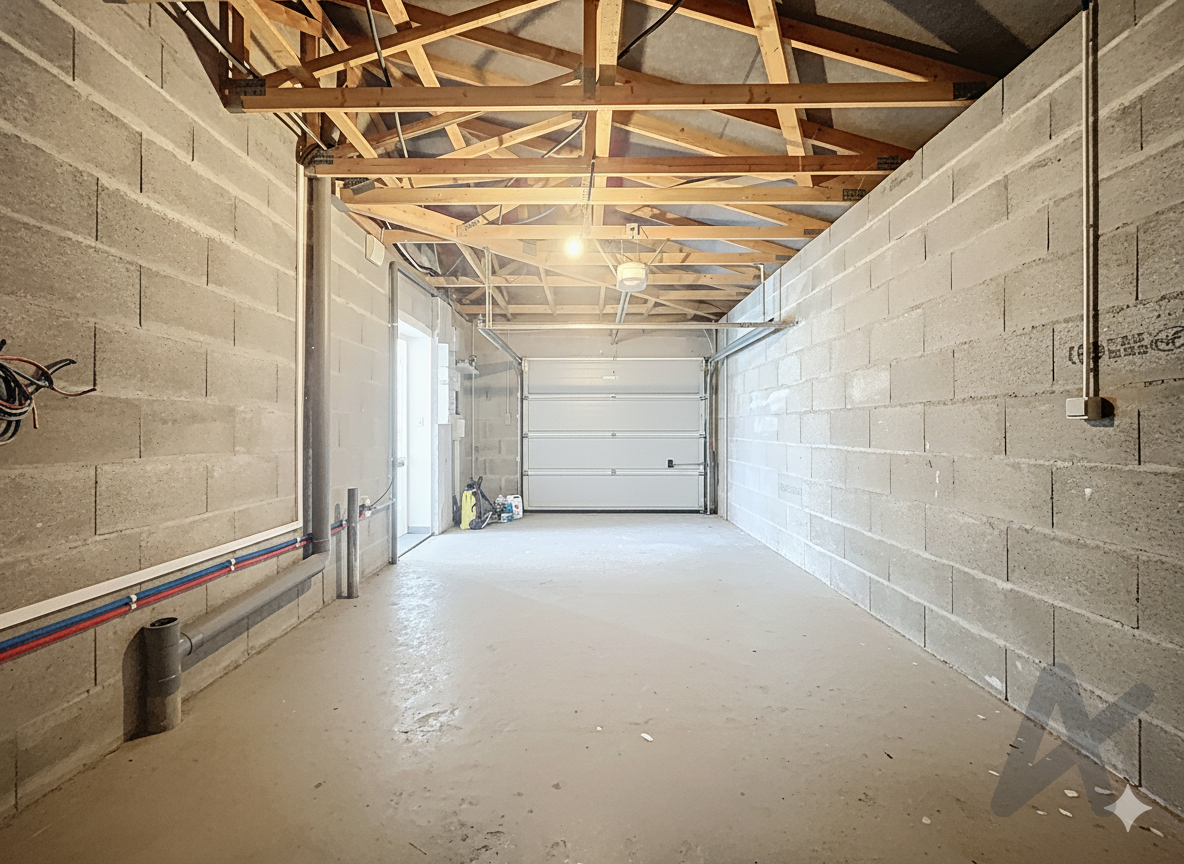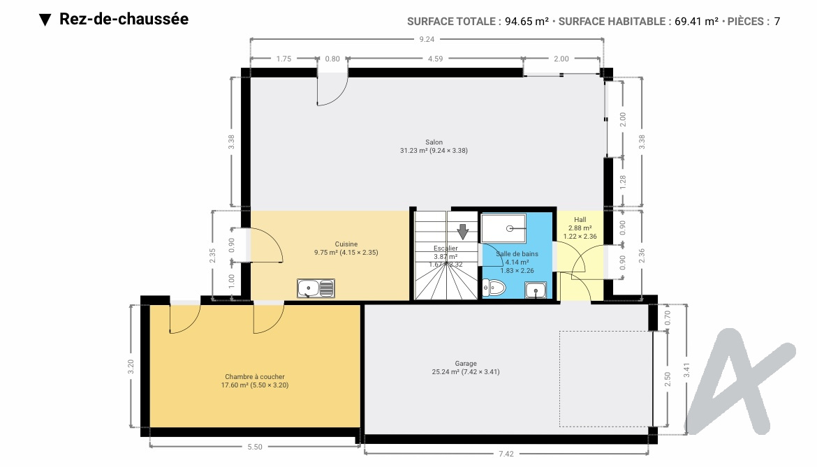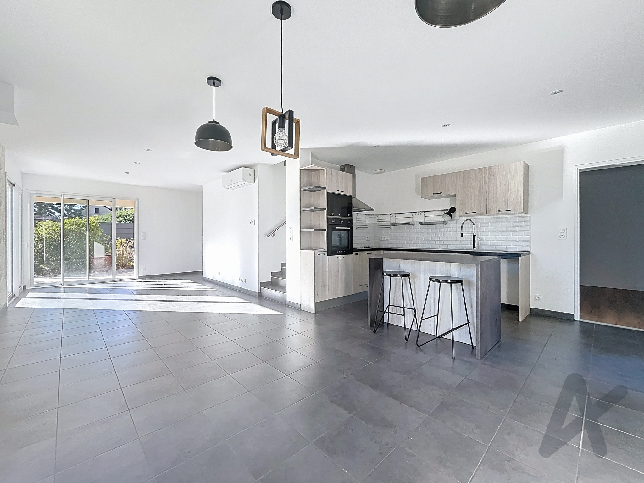 Le rez-de-chaussée se compose d’un grand séjour lumineux ouvrant sur une terrasse carrelée, d’une cuisine équipée, d’une chambre avec accès terrasse et SPA, d’une salle d’eau avec WC et d’un garage de 25 m².