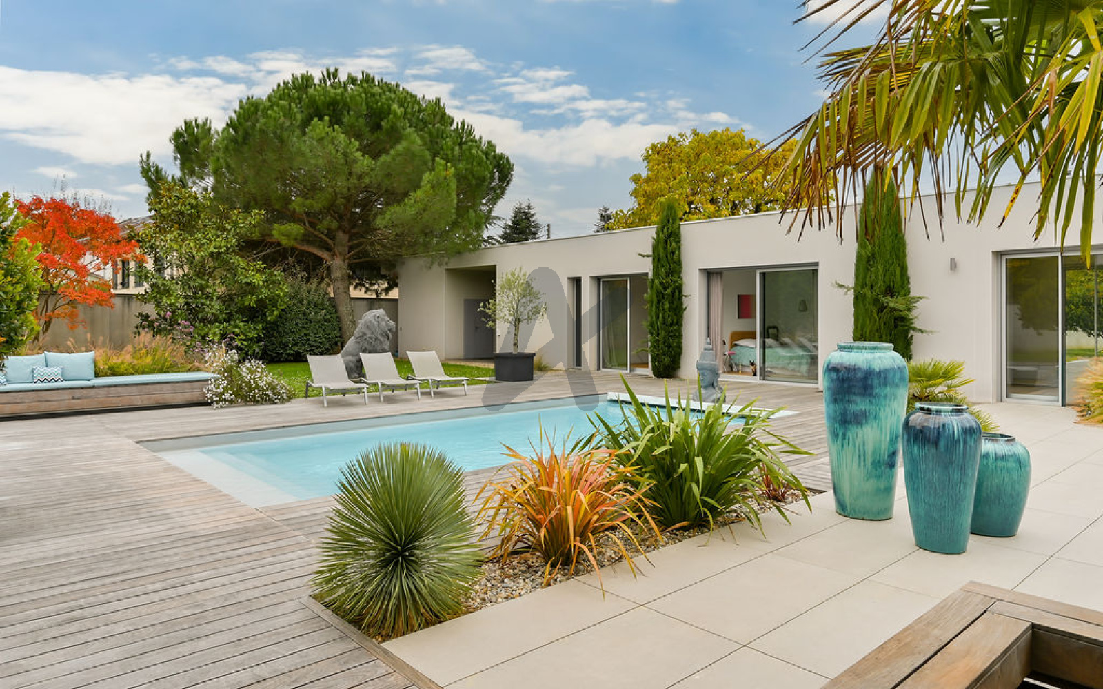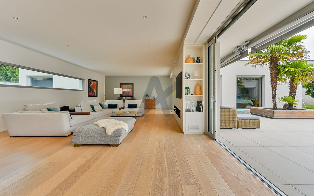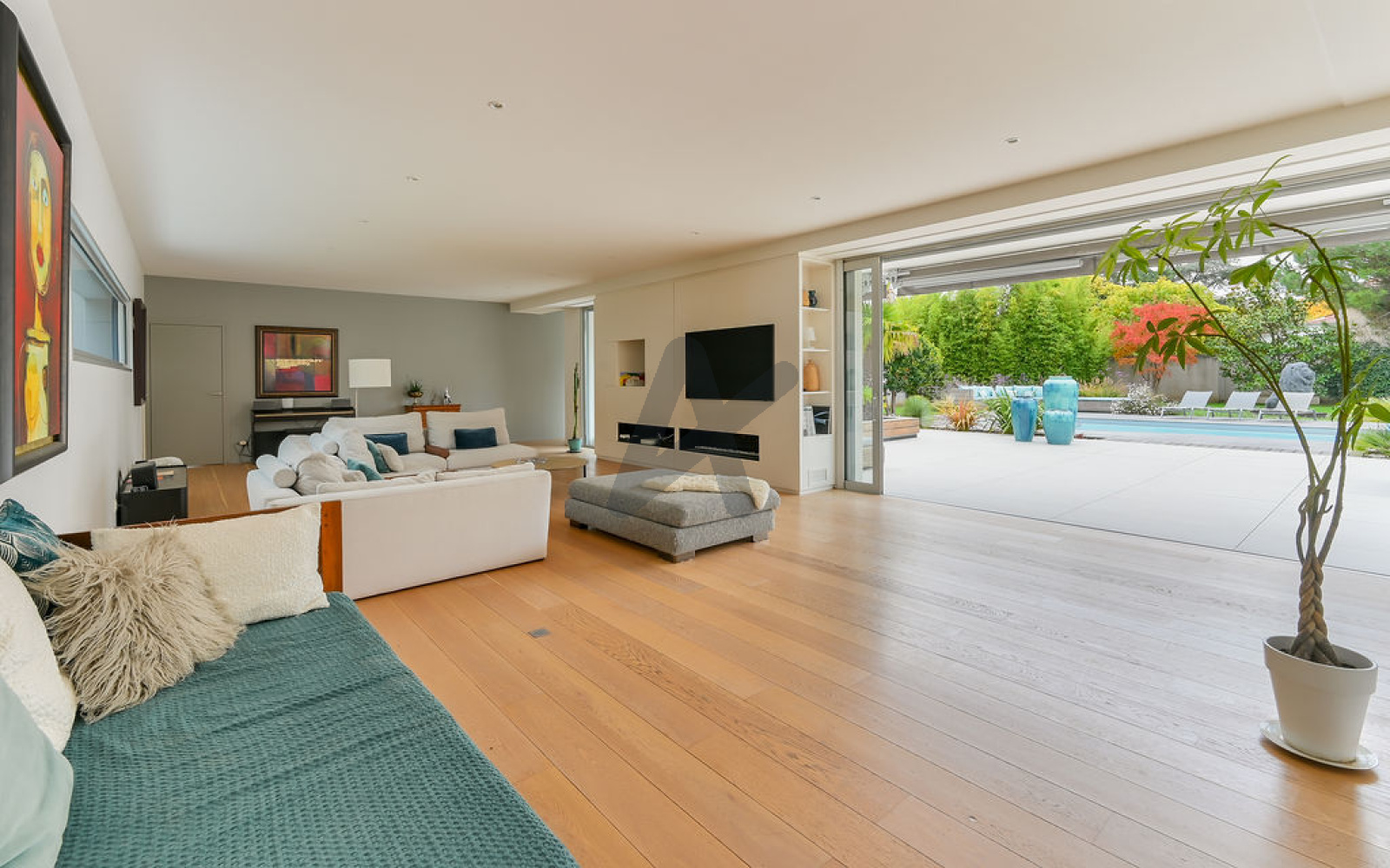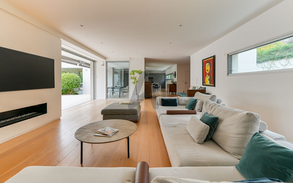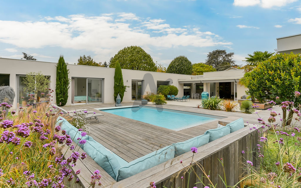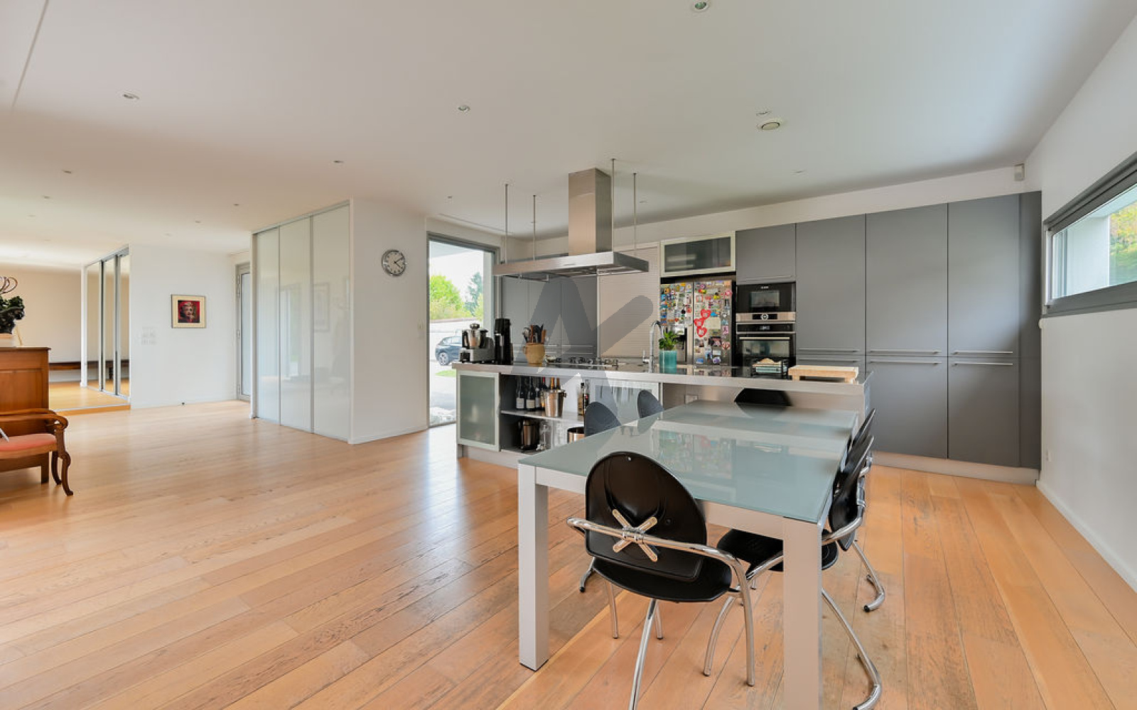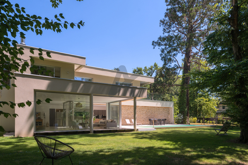 ECULLY, rare, secteur calme et résidentiel, à proximité immédiate du centre du village, des écoles, des commerces et transports, superbe maison contemporaine de plain-pied de 294 m² carrez et 302 m² avec annexe sur un terrain arboré et paysagé de 2 224 m² avec piscine. La maison se compose d'une entrée avec vestiaire, d'une très belle pièce de vie de 125 m² environ avec cheminée entièrement ouverte sur la terrasse de 267 m² et la piscine, une suite parentale avec dressing et salle de bains donnant sur piscine et terrasse, une suite avec sa salle de douche, une 3eme chambre ou bureau. Dans l'autre aile de plain-pied, un dégagement dessert 2 autres chambres, une salle de bains, toilettes, espace buanderie. Toutes les chambres sont climatisées. Le jardin plat et arboré bénéficie d'une piscine chauffée de 8x4m² avec rideau électrique. Un garage couvert, fermé et sous alarme, un carport, un local piscine de 3 m² (PHmetre et gestion du sel automatiques, pompe à chaleur, pompes et filtres), un abri de jardin de 12 m² et 7 places de parkings extérieures complètent ce bien d'exception. Belles prestations, quartier recherché sur Ecully, chauffage au sol, climatisation, maison contemporaine très lumineuse et entièrement de plain-pied.