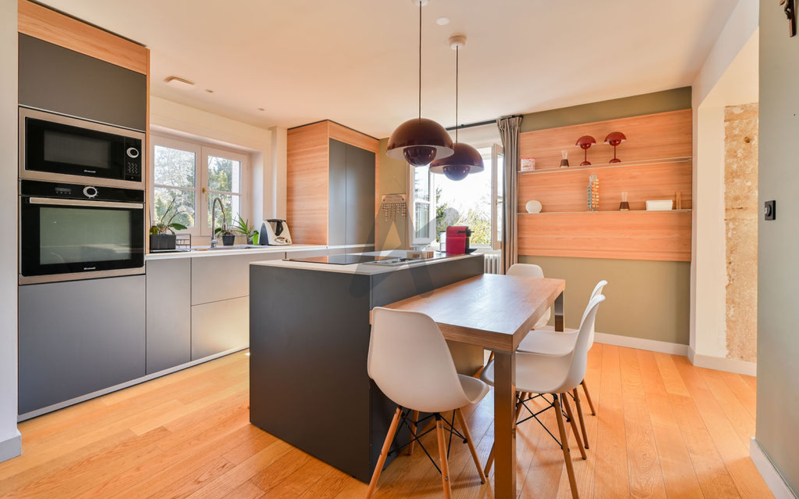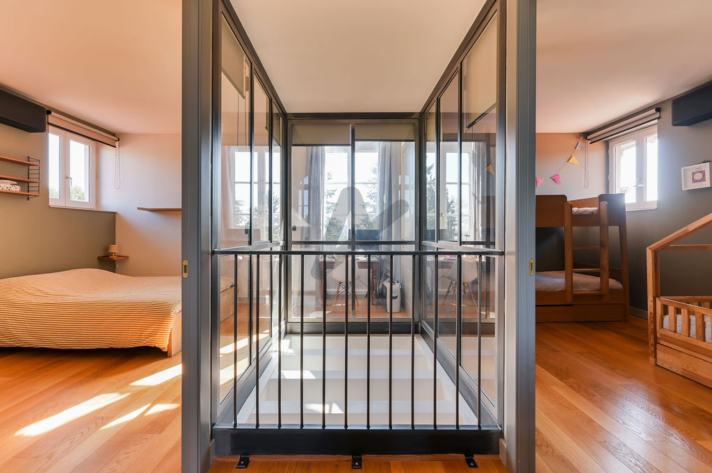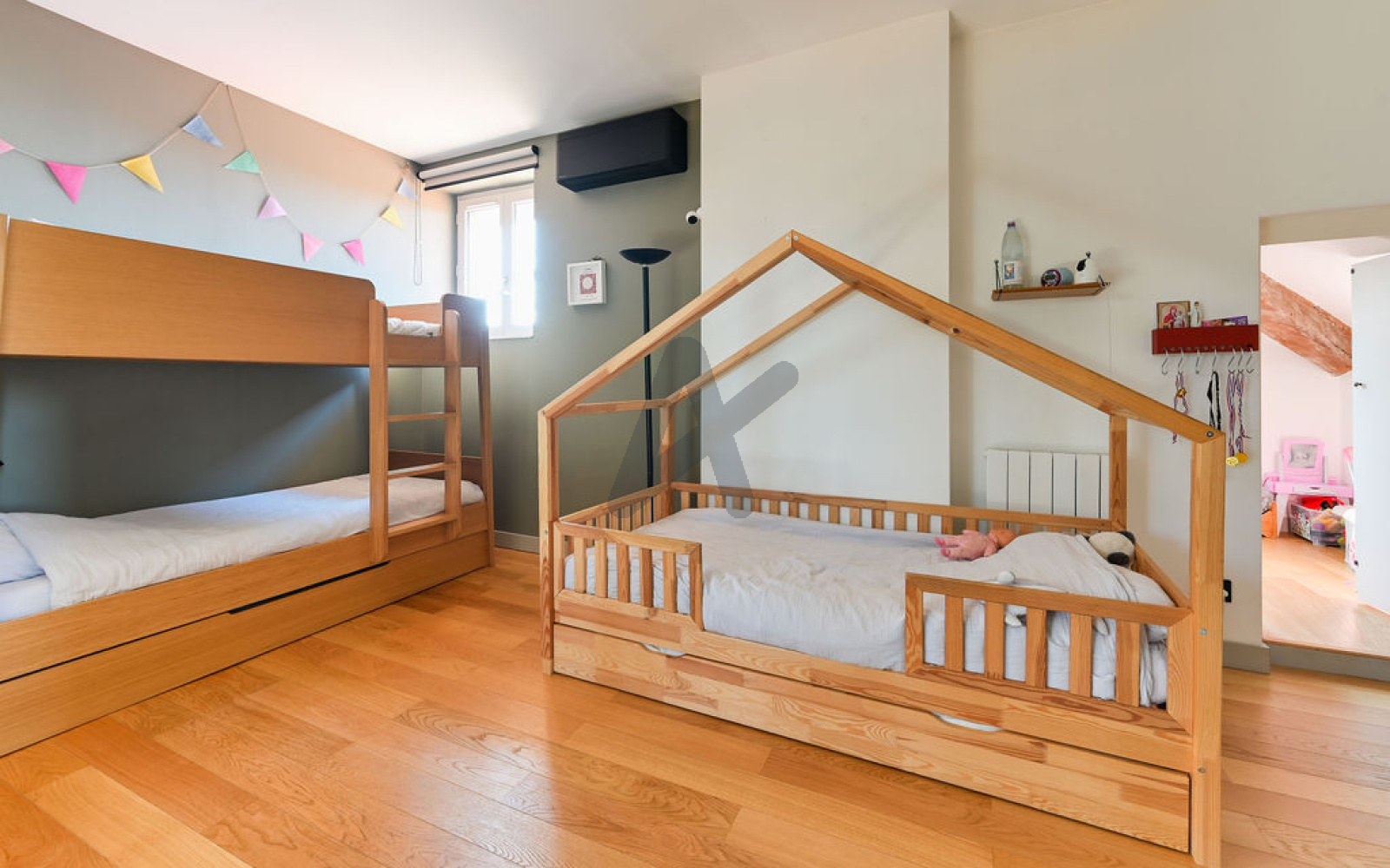 Ecully - Proche du centre, au sein d'une magnifique propriété bourgeoise, découvrez cet appartement de 167m2 env. avec jardin de 600m2 carrez et 177m2 au sol. L'appartement situé au 2ème étage, a bénéficié d'une rénovation totale de qualité, il propose, au rez de chaussée, un spacieux salon traversant avec cheminée, une cuisine semi-ouverte équipée de la marque haut de gamme Valcuccine, une buanderie et la chambre parentale avec dressing et salle de bain. L'étage, dédié aux enfants, se compose d'un palier faisant office de salon TV, de deux belles chambres climatisées, avec grands placards, d'une salle de jeux et d'une salle de douche. Un bureau indépendant de 20m2 env. complète l'appartement. Un jardin de 700m2 (à usage privatif) avec cuisine d'été complète ce bien rare, ainsi qu'un garage (avec prise de recharge pour voiture) et deux places de stationnement. La copropriété a bénéficié de travaux réguliers et ne nécessite pas de travaux, ainsi la toiture a été entièrement rénovée en 2024 (couverture et isolation). Charges de copropriété : 1813€ / an, soit 151€ / mois. Pas de procédure en cours. 11 lots dont 3 lots d'habitation. DPE D / D